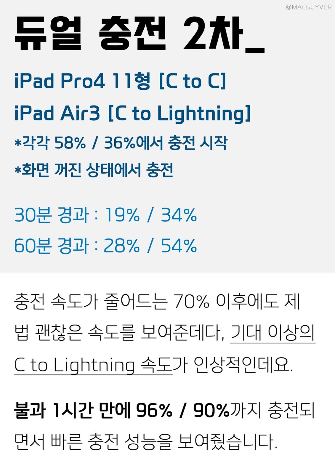 UM2 아이패드 충전기 듀얼 충전 2차_ iPad Pro4 11형 [C to C] iPad Air3 [C to Lightning] *각각 58% / 36%에서 충전 시작 *화면 꺼진 상태에서 충전 30분 경과 : 19% / 34% 60분 경과 : 28% / 54% 충전 속도가 줄어드는 70% 이후에도 제법 괜찮은 속도를 보여준데다, 기대 이상의 C to Lightning 속도가 인상적인데요. 아이폰 고속 충전기는 불과 1시간 만에 96% / 90%까지 충전되면서 빠른 충전 성능을 보여줬습니다.
