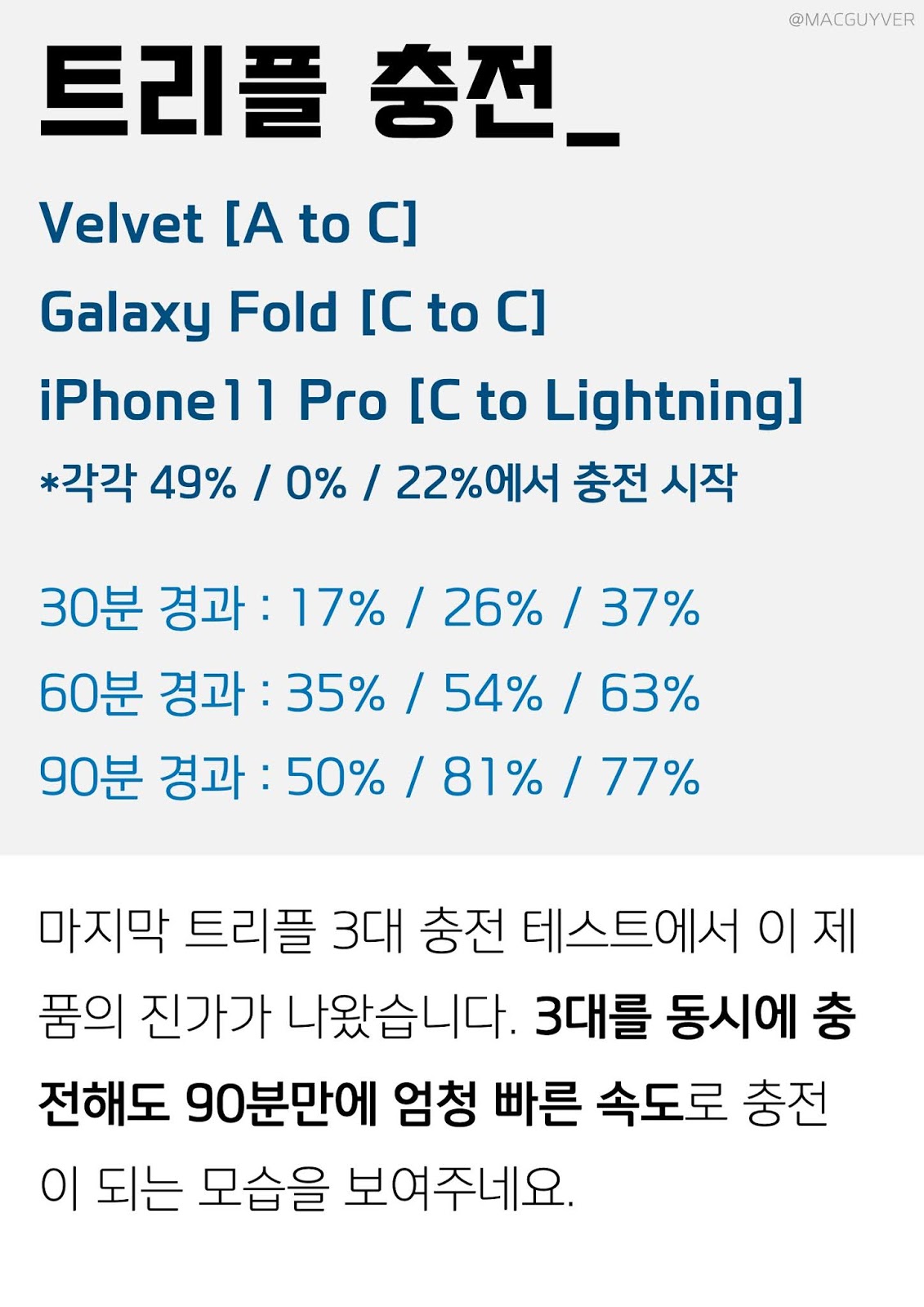 UM2 아이패드 충전기 트리플 충전_ Velvet [A to C] Galaxy Fold [C to C] iPhone11 Pro [C to Lightning] *각각 49% / 0% / 22%에서 충전 시작 30분 경과 : 17% / 26% / 37% 60분 경과 : 35% / 54% / 63% 90분 경과 : 50% / 81% / 77% 마지막 트리플 3대 충전 테스트에서 이 제품의 진가가 나왔습니다. GaN 충전기로 3대를 동시에 충전해도 90분만에 엄청 빠른 속도로 충전이 되는 모습을 보여주네요.