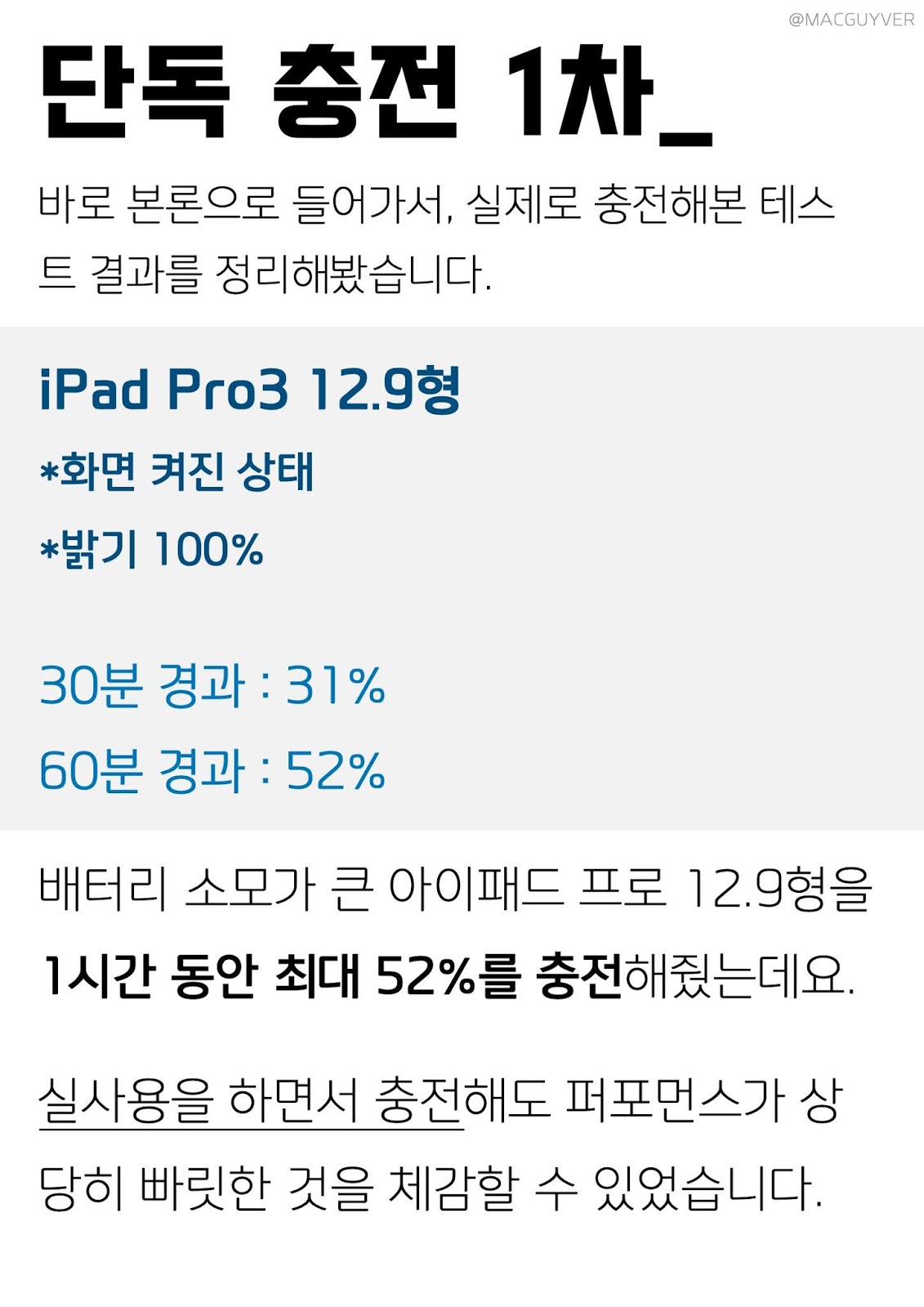 신소재 GaN 질화갈륨? 전력 손실 최대 40% 절감 15배 더 작은 설치 공간 확보 단독 충전 1차_ 바로 본론으로 들어가서, 아이폰 고속 충전기를 실제로 충전해본 테스트 결과를 정리해봤습니다. iPad Pro3 12.9형 *화면 켜진 상태 *밝기 100% 30분 경과 : 31% 60분 경과 : 52% 배터리 소모가 큰 아이패드 프로 12.9형을1시간 동안 최대 52%를 충전해줬는데요.