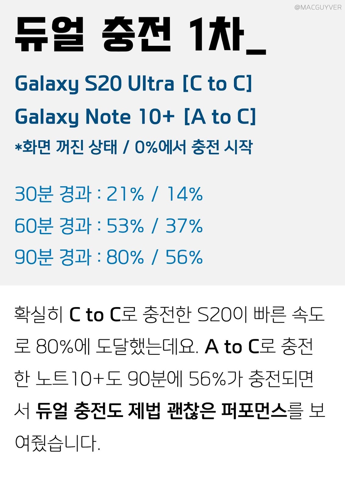 UM2 아이패드 충전기 듀얼 충전 1차_ Galaxy S20 Ultra [C to C] Galaxy Note 10+ [A to C] *화면 꺼진 상태 / 0%에서 충전 시작 30분 경과 : 21% / 14% 60분 경과 : 53% / 37% 90분 경과 : 80% / 56% 확실히 C to C로 충전한 S20이 빠른 속도로 80%에 도달했는데요. A to C로 충전한 노트10+도 90분에 56%가 충전되면서 듀얼 충전도 제법 괜찮은 퍼포먼스를 보여줬습니다.