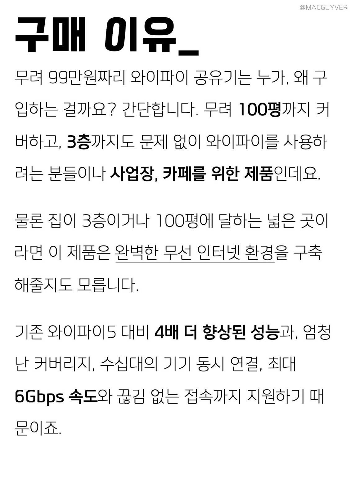 구매 이유_ 무려 99만원짜리 와이파이6 공유기는 누가, 왜 구입하는 걸까요? 간단합니다. 무려 100평까지 커버하고, 3층까지도 문제 없이 와이파이를 사용하려는 분들이나 사업장, 카페를 위한 제품인데요. 물론 집이 3층이거나 100평에 달하는 넓은 곳이라면 이 제품은 완벽한 무선 인터넷 환경을 구축해줄지도 모릅니다.