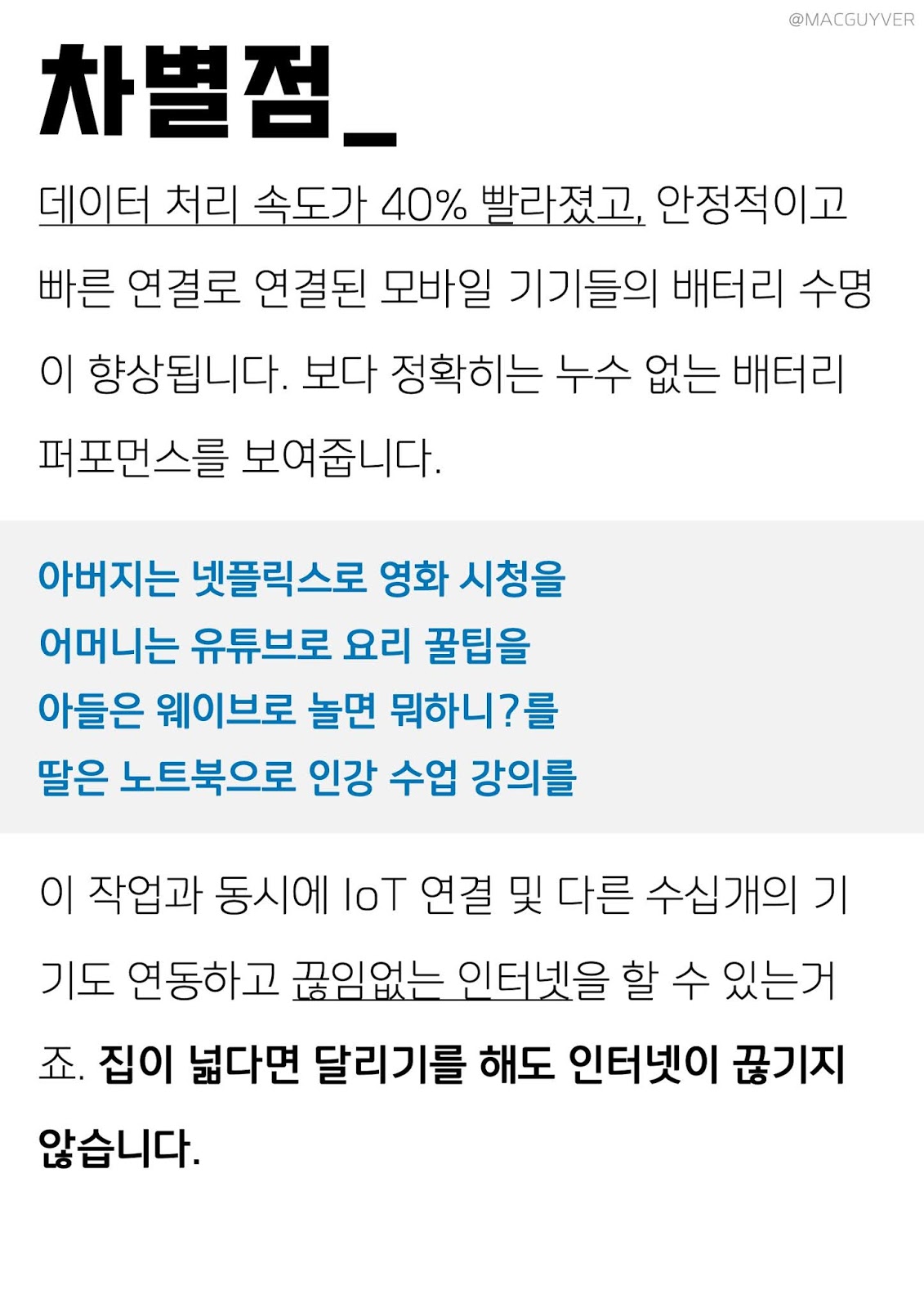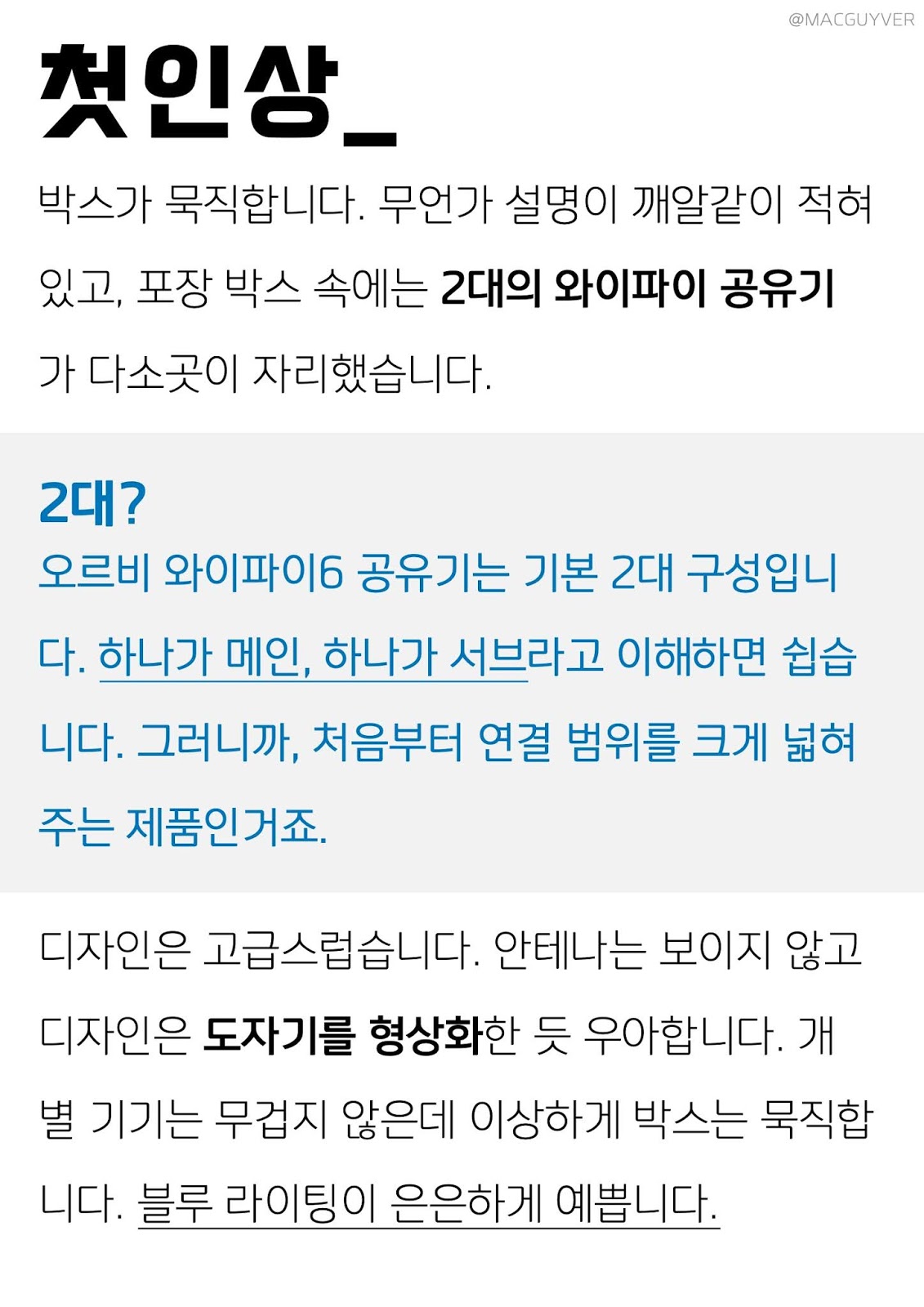 하나가 메인, 하나가 서브라고 이해하면 쉽습니다. 그러니까, 처음부터 연결 범위를 크게 넓혀주는 제품인거죠. 디자인은 고급스럽습니다. 안테나는 보이지 않고 디자인은 도자기를 형상화한 듯 우아합니다. 개별 기기는 무겁지 않은데 이상하게 박스는 묵직합니다. 블루 라이팅이 은은하게 예쁩니다. 차별점_ 데이터 처리 속도가 40% 빨라졌고, 안정적이고 빠른 연결로 연결된 모바일 기기들의 배터리 수명이 향상됩니다.
