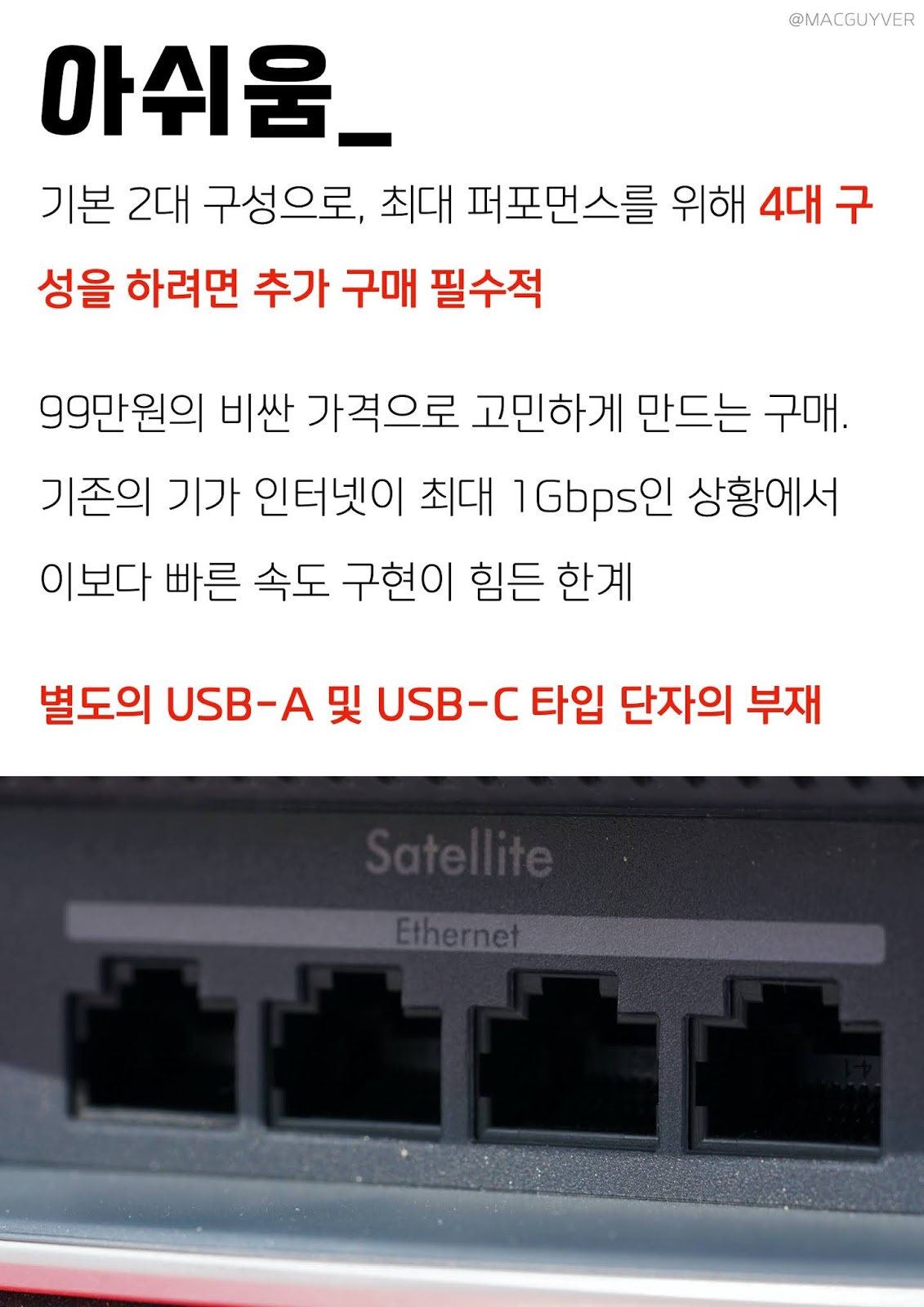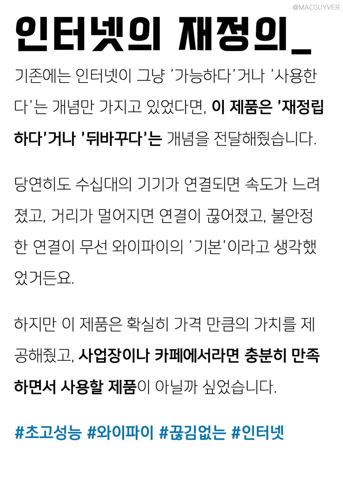 기존의 기가 인터넷이 최대 1Gbps인 상황에서 이보다 빠른 속도 구현이 힘든 한계 별도의 USB-A 및 USB-C 타입 단자의 부재 인터넷의 재정의_ 기존에는 인터넷이 그냥 '가능하다'거나 '사용한다'는 개념만 가지고 있었다면, 이 제품은 '재정립하다'거나 '뒤바꾸다'는 개념을 전달해줬습니다. 당연히도 수십대의 기기가 연결되면 속도가 느려졌고, 거리가 멀어지면 연결이 끊어졌고, 불안정한 연결이 무선 와이파이의 '기본'이라고 생각했었거든요. 하지만 이 제품은 확실히 가격만큼의 가치를 제공해줬고, 사업장이나 카페에서라면 충분히 만족하면서 사용할 제품이 아닐까 싶었습니다.