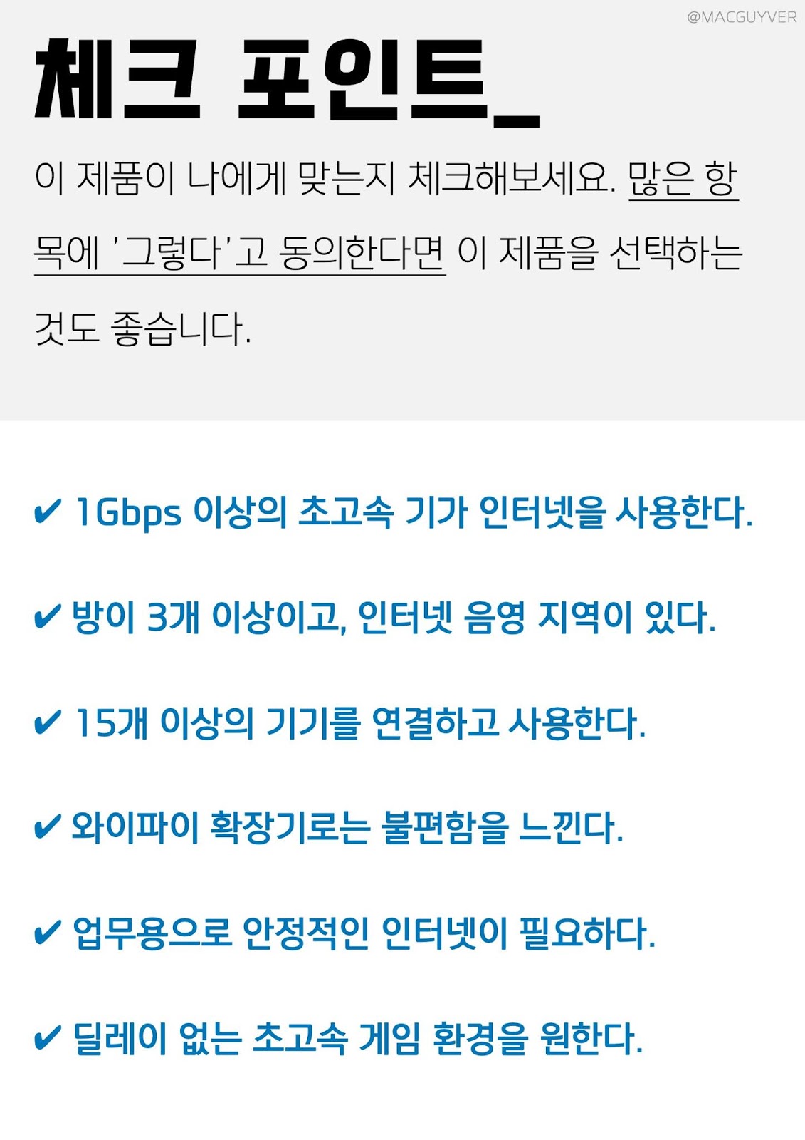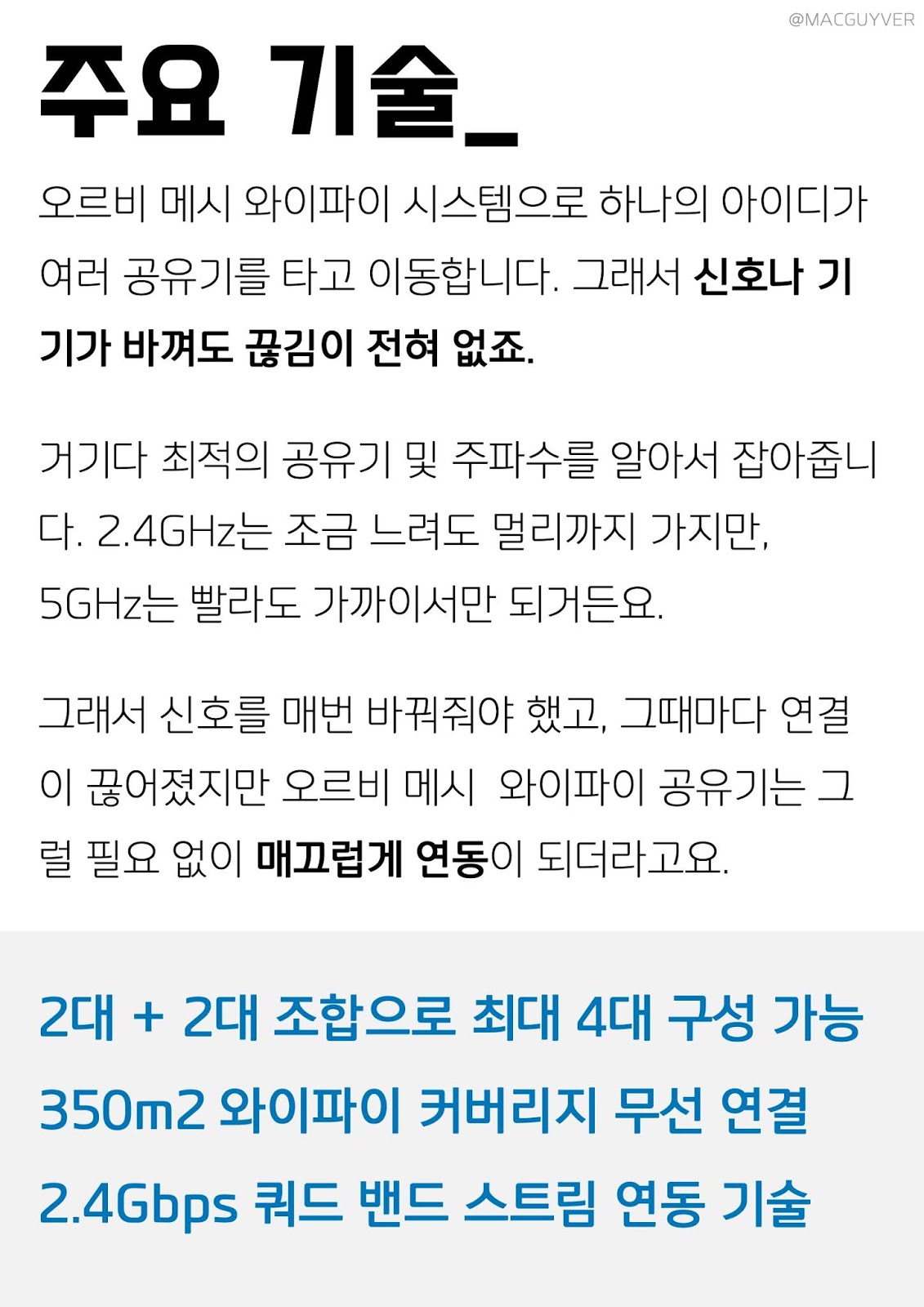 주요 기술_ 오르비 메시 와이파이 시스템으로 하나의 아이디가 여러 공유기를 타고 이동합니다. 그래서 신호나 기기가 바껴도 끊김이 전혀 없죠. 거기다 최적의 공유기 및 주파수를 알아서 잡아줍니다. 2.4GHz는 조금 느려도 멀리까지 가지만, 5GHz는 빨라도 가까이서만 되거든요. 그래서 신호를 매번 바꿔줘야 했고, 그때마다 연결이 끊어졌지만 오르비 메시 와이파이 공유기는 그럴 필요 없이 매끄럽게 연동이 되더라고요. 2대 + 2대 조합으로 최대 4대 구성 가능 350m2 와이파이 커버리지 무선 연결 2.4Gbps 쿼드 밴드 스트림 연동 기술 체크 포인트_ 이 제품이 나에게 맞는지 체크해보세요. 많은 항목에 '그렇다'고 동의한다면 이 제품을 선택하는 것도 좋습니다.