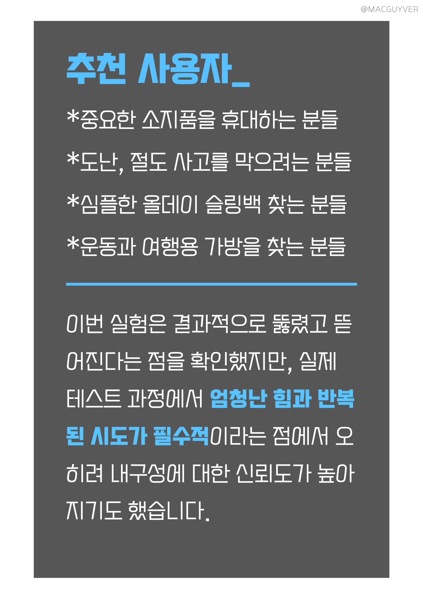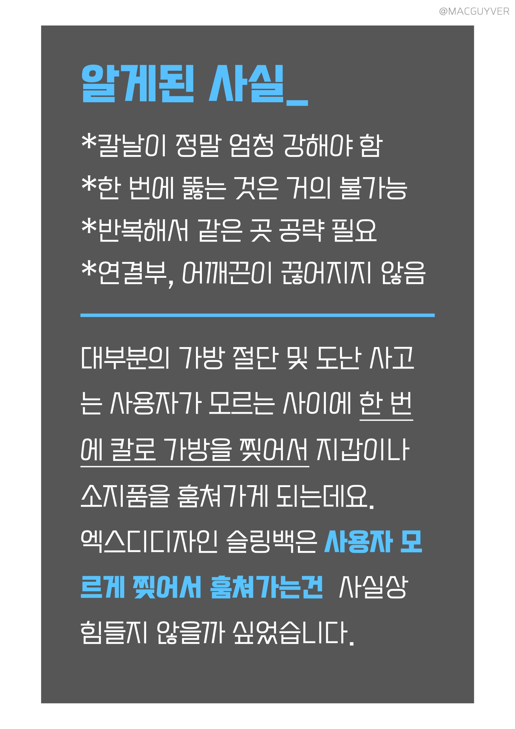 알게된 사실_ *칼날이 정말 엄청 강해야 함 *한 번에 엑스디디자인 힙색을 뚫는 것은 거의 불가능 *반복해서 같은 곳 공략 필요 *연결부, 어깨끈이 끊어지지 않음 대부분의 가방 절단 및 도난 사고는 사용자가 모르는 사이에 한 번에 칼로 가방을 찢어서 지갑이나 소지품을 훔쳐가게 되는데요. 엑스디디자인 도난방지 슬링백은 사용자 모르게 찢어서 훔쳐가는건 사실상 힘들지 않을까 싶었습니다.