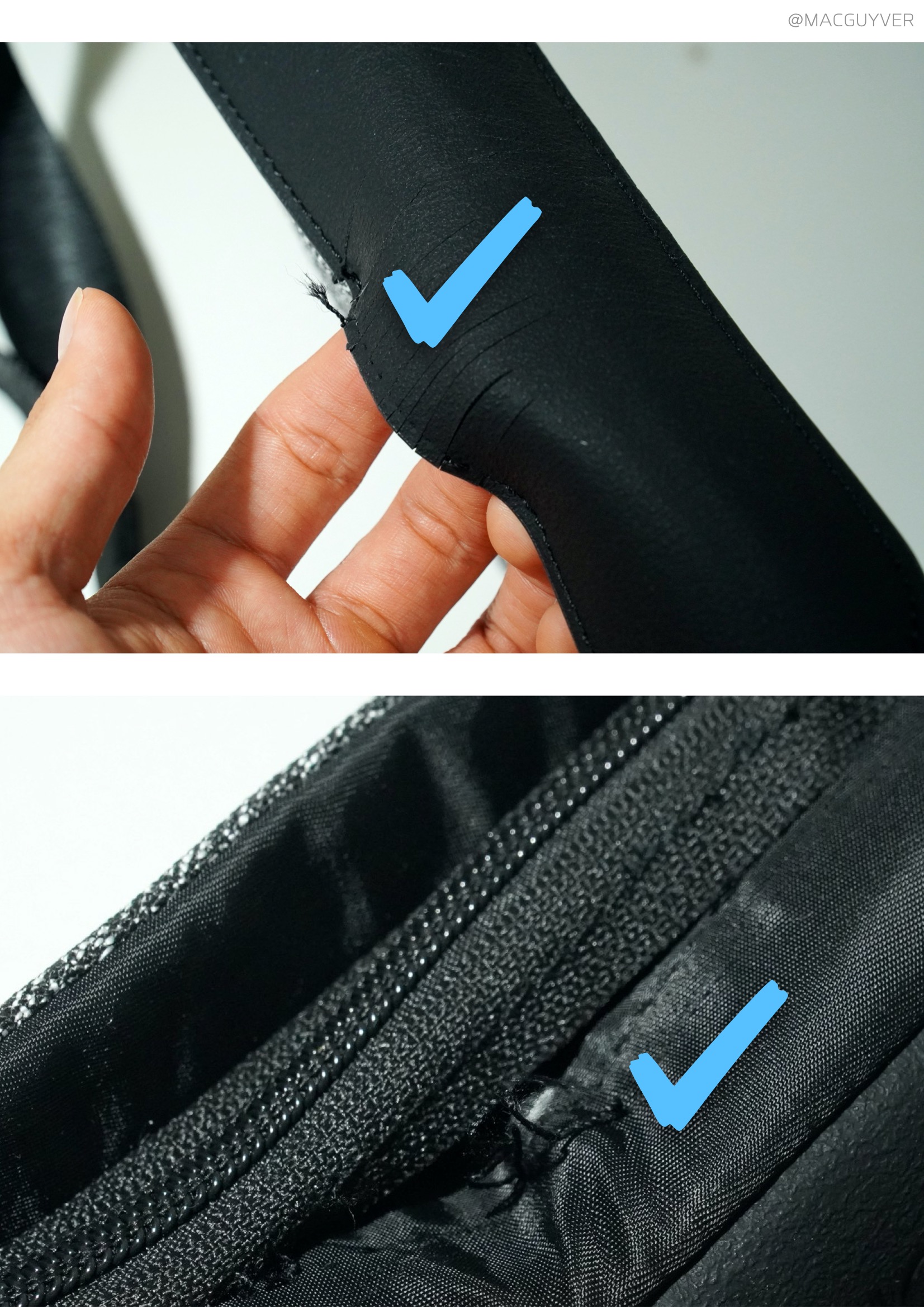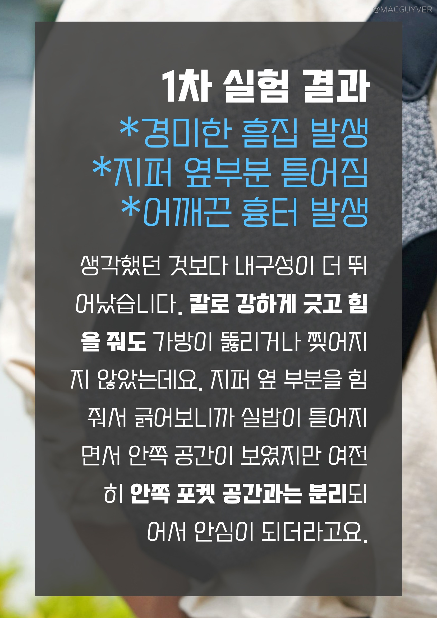 01작정하고 칼로 긋기*중앙 부분 강하게 수십번 그어보고 힘주기 *연결부를 계속 긋기 *하단부와 로고 긁어보기 *지퍼 부분 틈새 공략 *어깨끈 반복해서 긋기 1차 실험 결과 *경미한 흠집 발생 *지퍼 옆부분 튿어짐 *어깨끈 흉터 발생 생각했던 것보다 내구성이 더 뛰어났습니다. 칼로 강하게 긋고 힘을 줘도 가방이 뚫리거나 찢어지지 않았는데요. 도난방지가방 지퍼 옆 부분을 힘줘서 긁어보니까 크로스백 실밥이 튿어지면서 안쪽 공간이 보였지만 여전히 안쪽 포켓 공간과는 분리되 어서 안심이 되더라고요.
