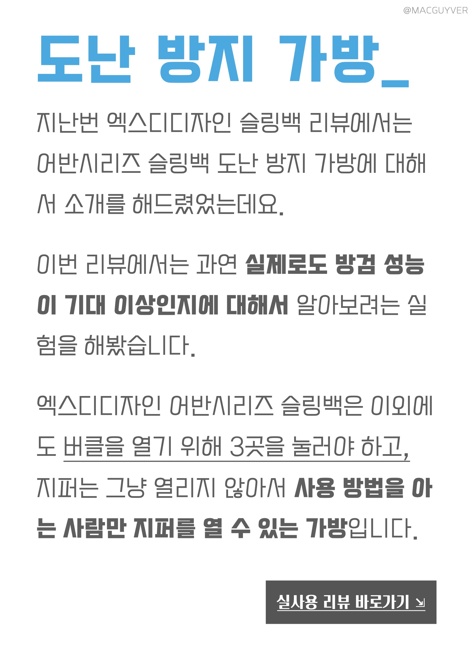 도난 방지 가방_ 지난번 엑스디디자인 슬링백 리뷰에서는 어반시리즈 슬링백 도난 방지 가방에 대해서 소개를 해드렸었는데요. 이번 리뷰에서는 과연 실제로도 여행용가방 방검 성능이 기대 이상인지에 대해서 알아보려는 실험을 해봤습니다. 엑스디디자인 어반시리즈 슬링백은 이외에도 버클을 열기 위해 3곳을 눌러야 하고, 크로스백 지퍼는 그냥 열리지 않아서 사용 방법을 아는 사람만 지퍼를 열 수 있는 가방입니다.