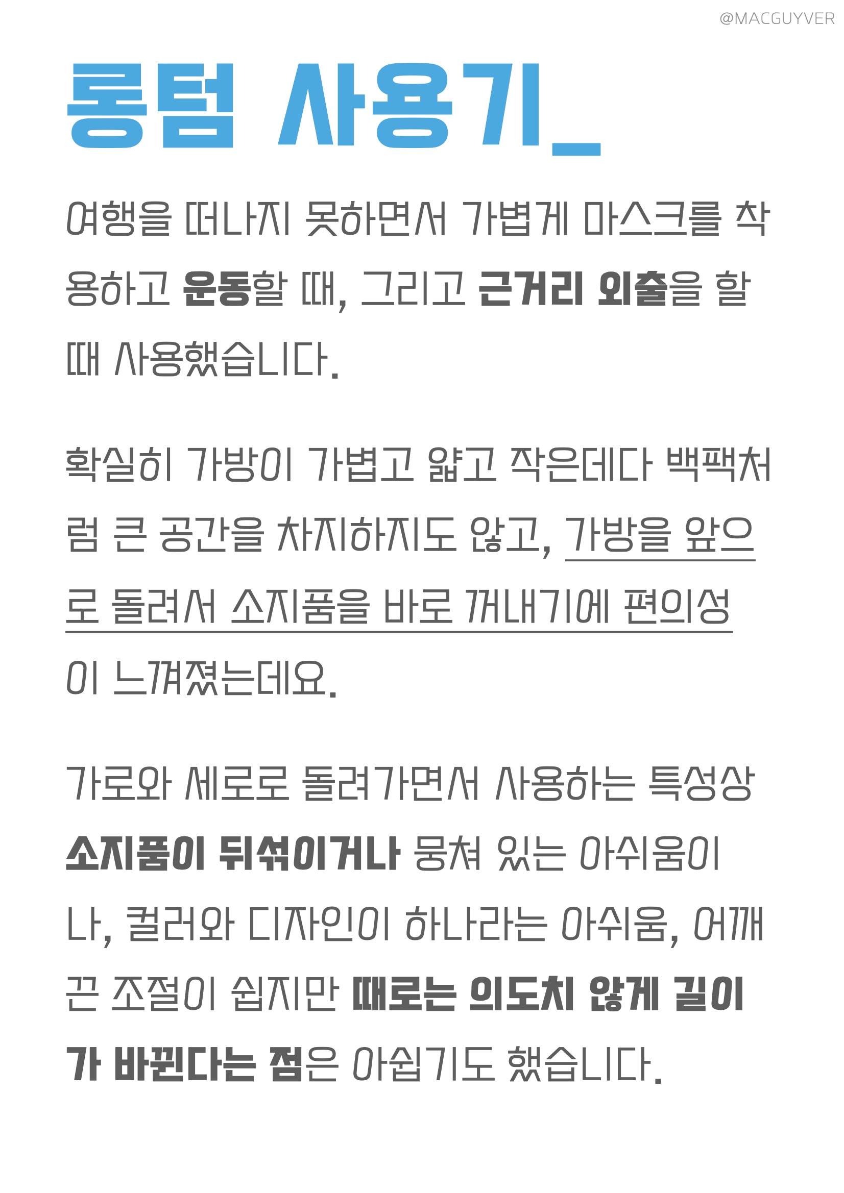 여행용가방 롱텀 사용기_ 여행을 떠나지 못하면서 가볍게 마스크를 착용하고 운동할 때, 그리고 근거리 외출을 할 때 힙색으로 사용했습니다. 확실히 가방이 가볍고 얇고 작은데다 백팩처럼 큰 공간을 차지하지도 않고, 힙색 가방을 앞으로 돌려서 소지품을 바로 꺼내기에 편의성이 느껴졌는데요. 가로와 세로로 돌려가면서 사용하는 힙색 특성상 소지품이 뒤섞이거나 뭉쳐 있는 아쉬움이나, 스포츠백 컬러와 디자인이 하나라는 아쉬움, 어깨끈 조절이 쉽지만 때로는 의도치 않게 길이가 바뀐다는 점은 아쉽기도 했습니다.
