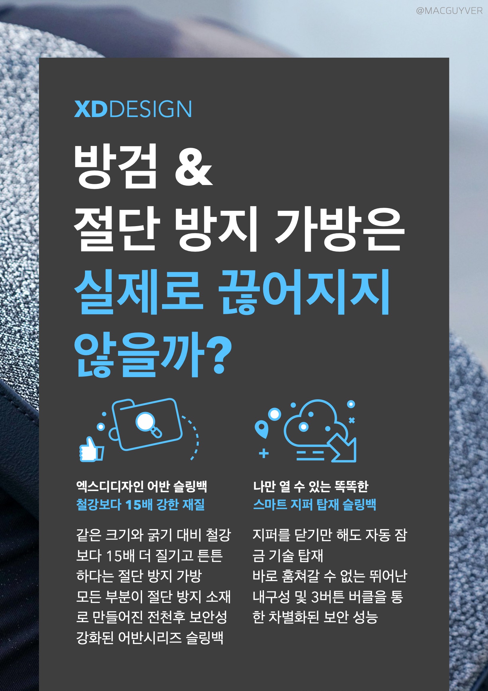 엑스디디자인 도난방지가방 같은 크기와 굵기 대비 철강보다 15배 더 질기고 튼튼하다는 절단 방지 가방, 스포츠백 모든 부분이 절단 방지 소재로 만들어진 전천후 보안성 강화된 어반시리즈 슬링백, 지퍼를 닫기만 해도 자동 잠금 기술 탑재 바로 훔쳐갈 수 없는 뛰어난 내구성 및 3버튼 버클을 통한 차별화된 보안 성능