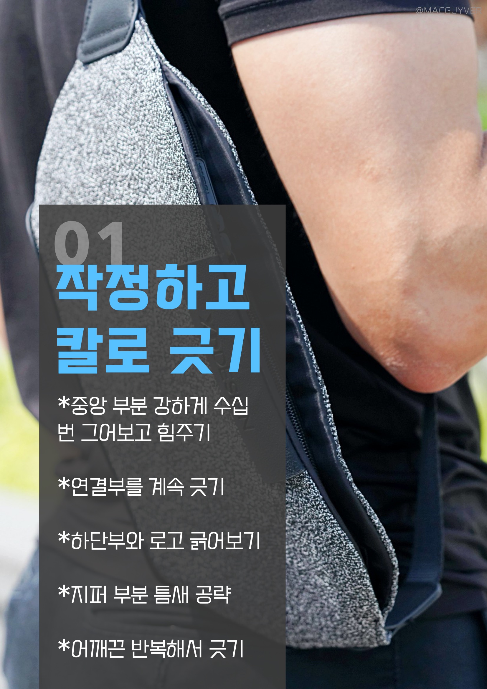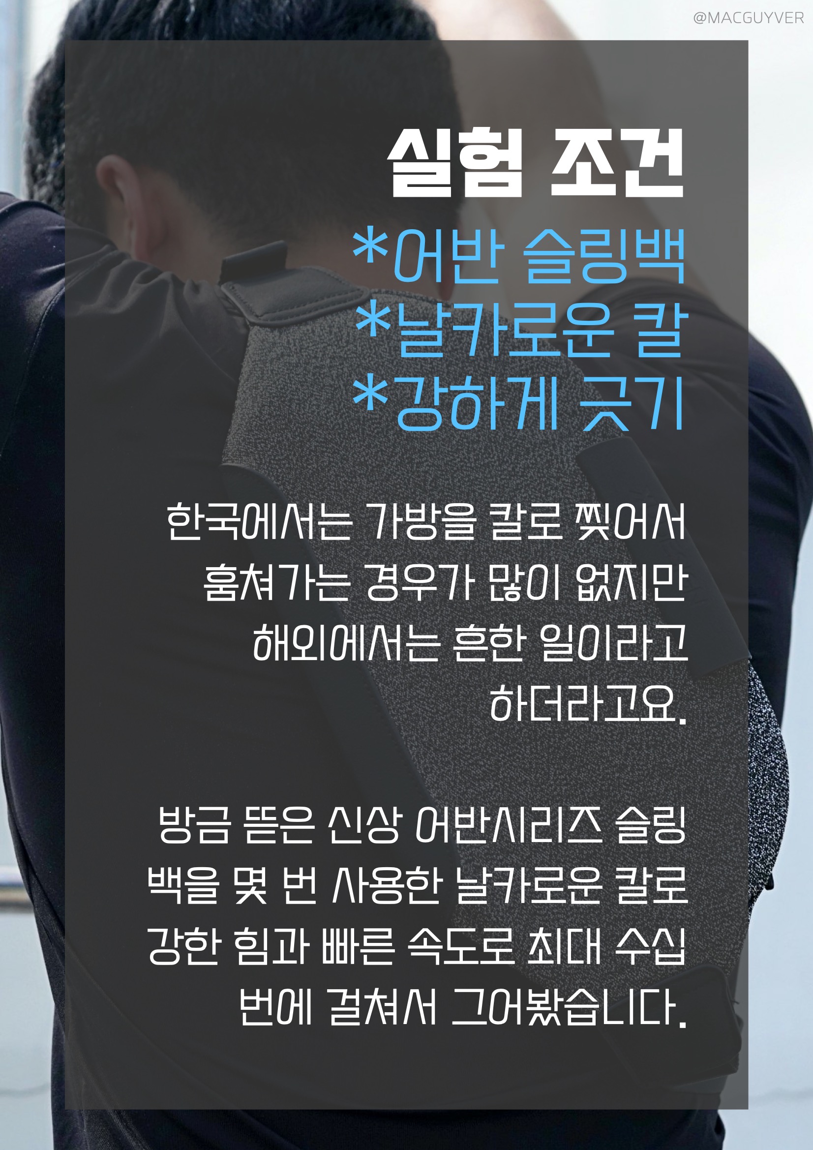 실험 조건 *어반 슬링백 *날카로운 칼 *강하게 긋기 한국에서는 가방을 칼로 찢어서 훔쳐가는 경우가 많이 없지만 해외에서는 흔한 일이라고 하더라고요. 방금 뜯은 신상 어반시리즈 슬링백을 몇 번 사용한 날카로운 칼로 강한 힘과 빠른 속도로 엑스디디자인 방수백최대 수십번에 걸쳐서 그어봤습니다.