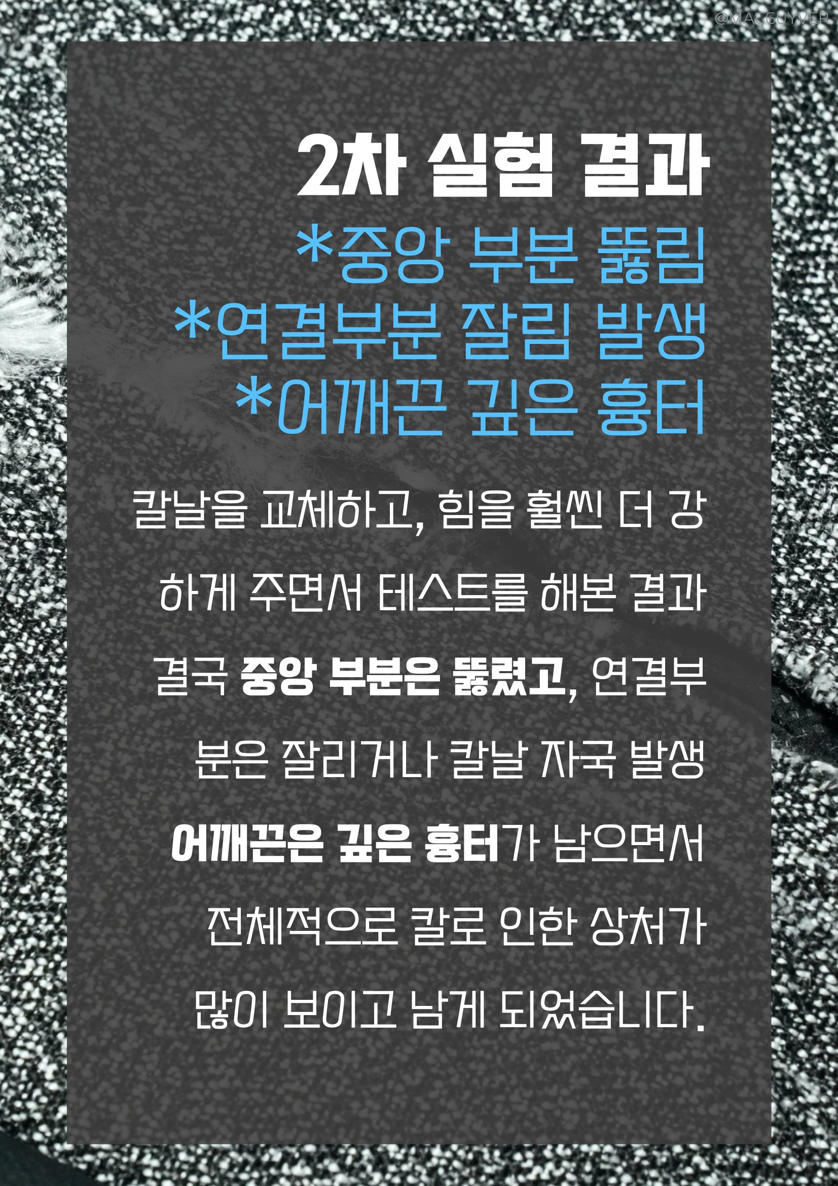 02칼날교체 다시 도전 *중앙 부분 강하게 수십번 그어보고 힘주기 *연결부를 힘줘서 긋기 *하단부 강하게 긁어보기 *어깨끈 반복해서 긋기 2차 실험 결과 *중앙 부분 뚫림 *연결부분 잘림 발생 *어깨끈 깊은 흉터칼날을 교체하고, 힘을 훨씬 더 강하게 주면서 테스트를 해본 결과 결국 슬링백 중앙 부분은 뚫렸고, 연결부분은 잘리거나 칼날 자국 발생 어깨끈은 깊은 흉터가 남으면서 전체적으로 칼로 인한 상처가 많이 보이고 남게 되었습니다.