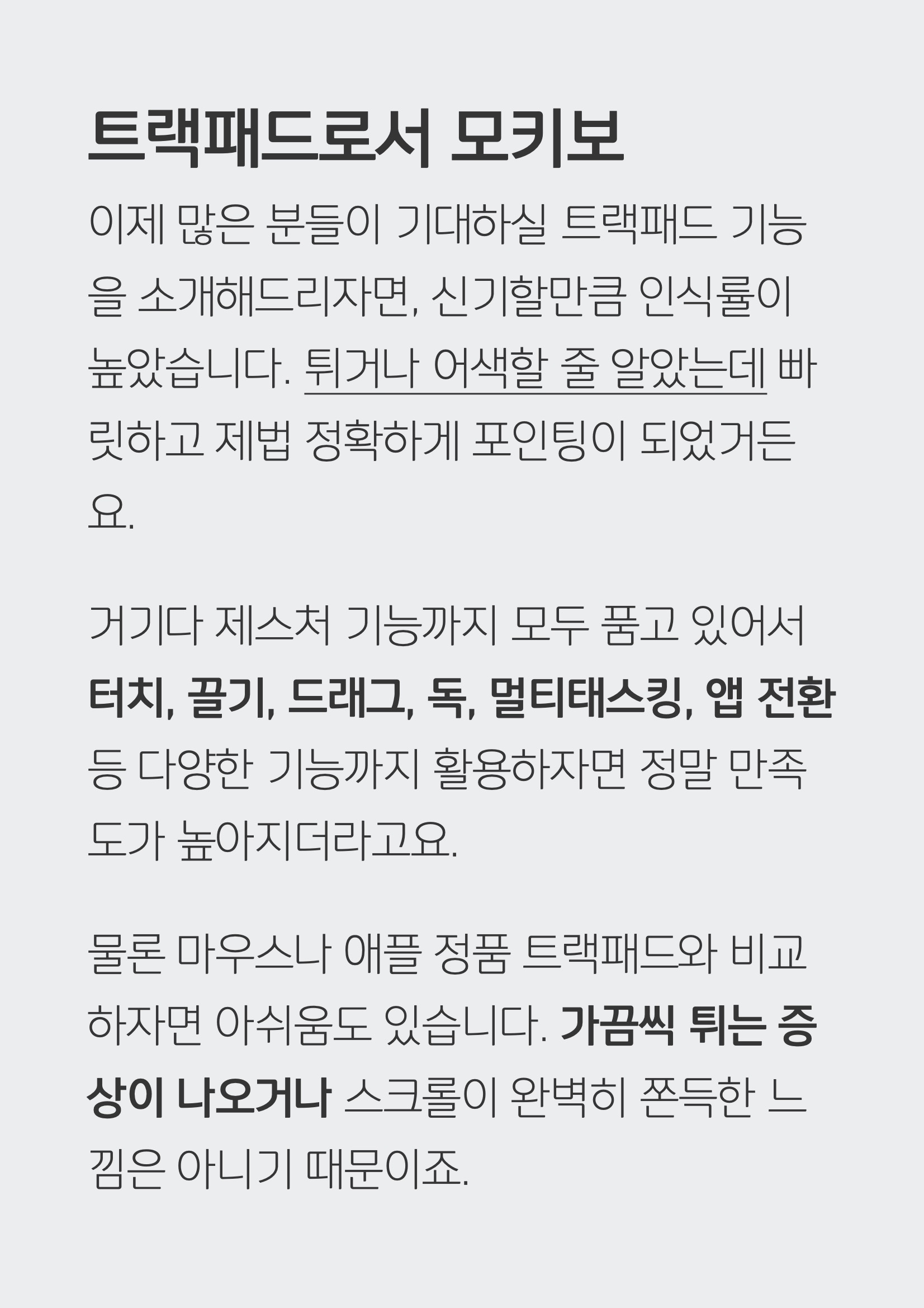 키보드로서 모키보 본질은 여전히 키보드이기 때문에, 모키보 키보드의 타이핑 경험이 중요한데요. 블루투스 키보드 3대 멀티 페어링과 3가지 운영체제에 맞춰진 단축키를 지원해서 범용성이나 호환성이 상당히 높았습니다. 특히 멀티 페어링 전환 속도가 엄청 빨라서 편의성이 좋더라고요. 물론 아쉬움도 있습니다. 아이패드 프로 매직 키보드 트랙패드 사용을 위해서 키보드 저항이 제법 있는 편이거든요. 그래서 다소 통통거리는 키감을 가졌습니다. 터치패드 키보드 트랙패드로서 모키보 이제 많은 분들이 기대하실 트랙패드 기능을 소개해드리자면, 신기할만큼 인식률이 높았습니다. 멀티 디바이스 키보드 튀거나 어색할 줄 알았는데 빠릿하고 제법 정확하게 포인팅이 되었거든요. 무선 키보드 거기다 제스처 기능까지 모두 품고 있어서 블루투스 키보드 터치, 끌기, 드래그, 독, 멀티태스킹, 앱 전환 등 다양한 기능까지 활용하자면 정말 만족도가 높아지더라고요.