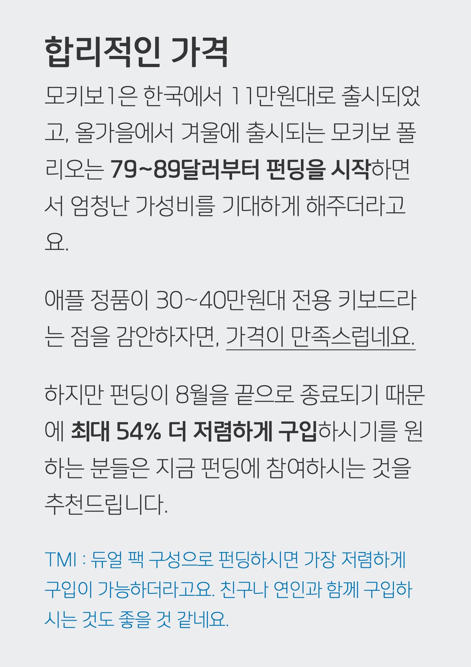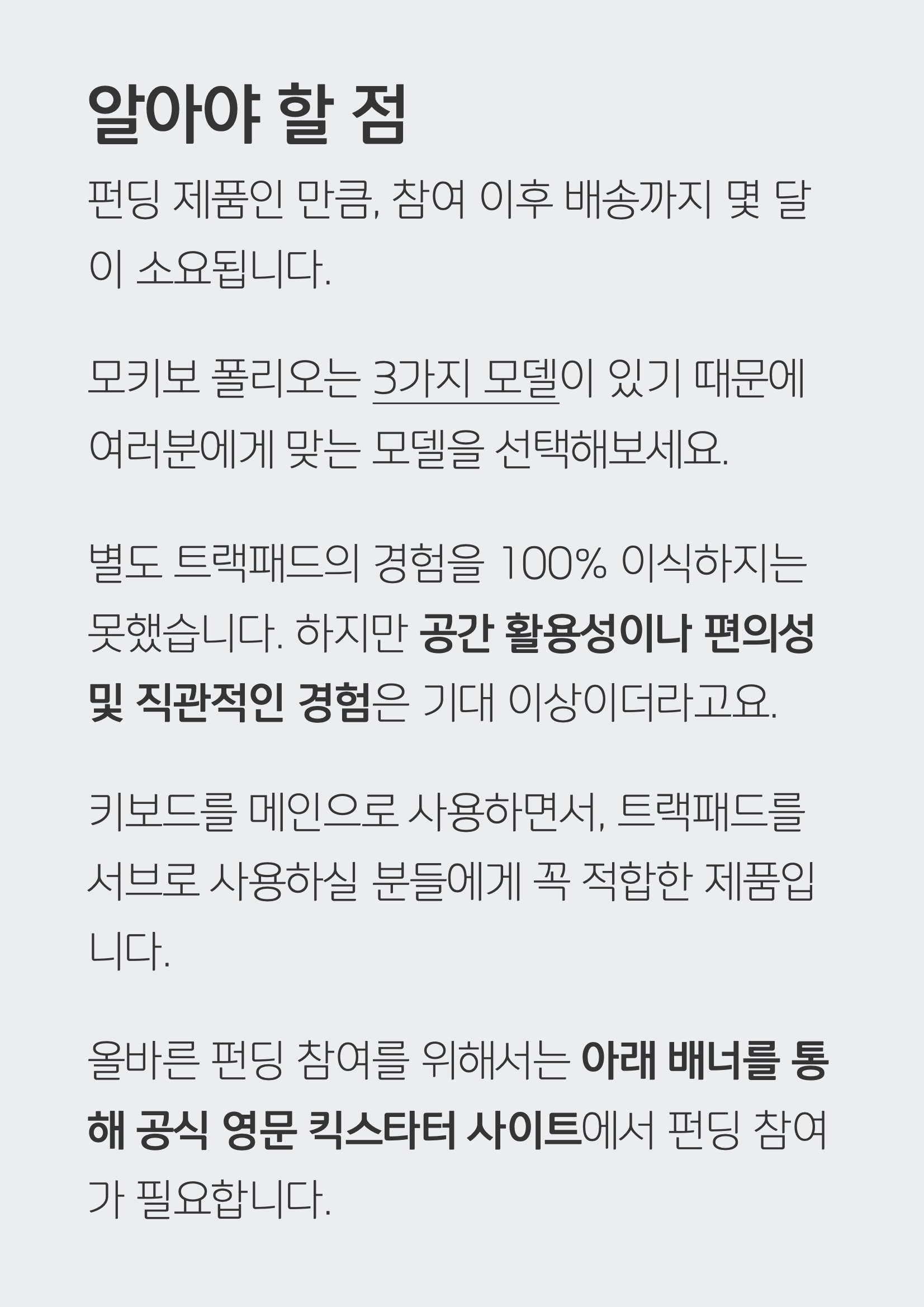 아이패드 프로 11형을 사용중인 입장에서, 올가을에 모키보 폴리오가 출시되면 발빠르게 사용해보고 싶은 생각도 들더라고요. 알아야 할 점 펀딩 제품인 만큼, 참여 이후 배송까지 몇 달이 소요됩니다. 무선 키보드 모키보 폴리오는 3가지 모델이 있기 때문에 여러분에게 맞는 모델을 선택해보세요. 별도 트랙패드의 경험을 100% 이식하지는 못했습니다. 하지만 공간 활용성이나 편의성 및 직관적인 경험은 기대 이상이더라고요. 아이패드 프로 매직 키보드를 메인으로 사용하면서, 트랙패드를 서브로 사용하실 분들에게 꼭 적합한 제품입니다. 올바른 펀딩 참여를 위해서는 아래 배너를 통해 공식 영문 킥스타터 사이트에서 펀딩 참여가 필요합니다. 터치패드 키보드 추천 사용자 키보드와 마우스 모두 필요한 분들 휴대하면서 사용할 제품 찾는 분들 애플 정품 가격이 부담스러운 분들 멀티 페어링 키보드를 원하는 분들