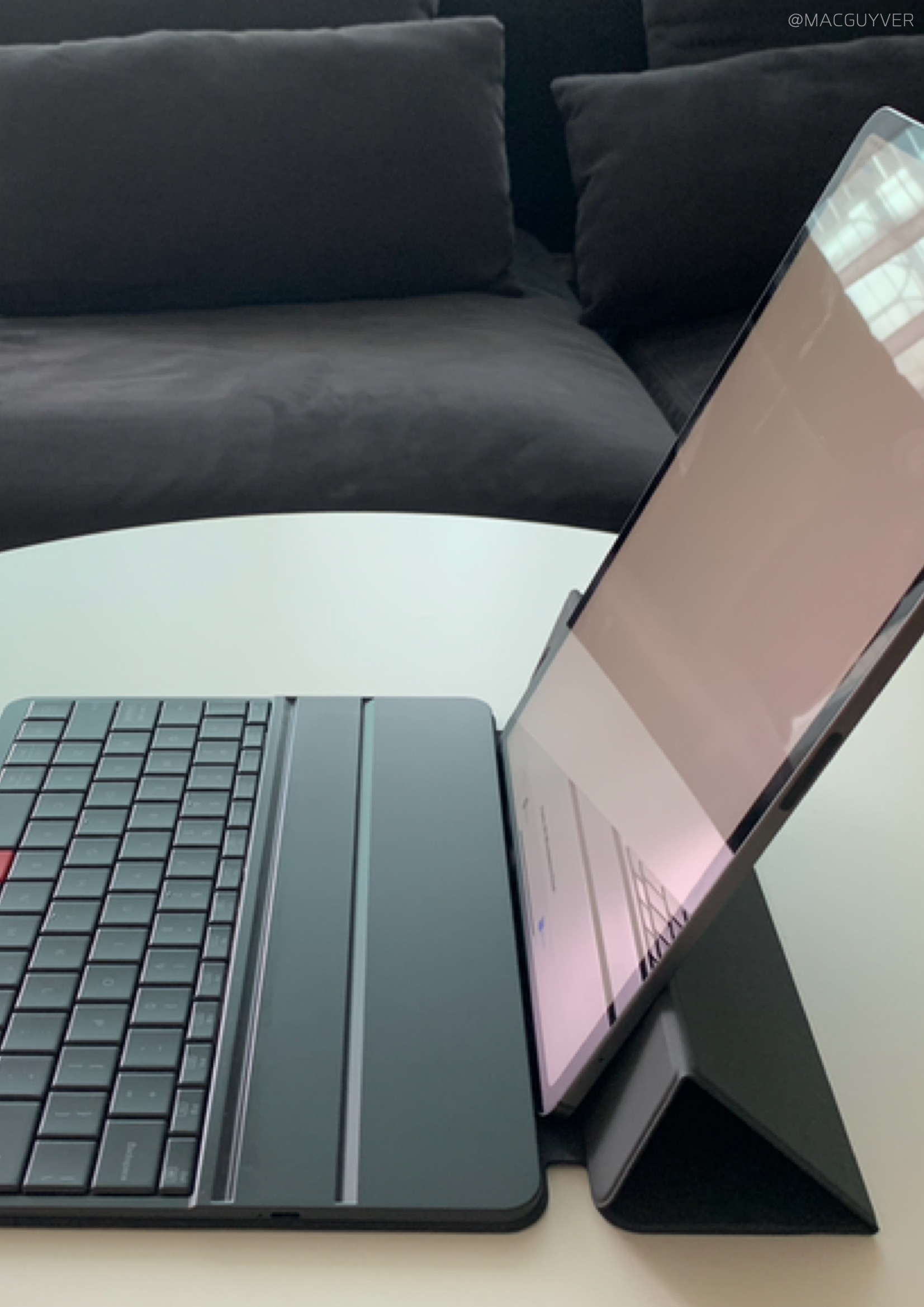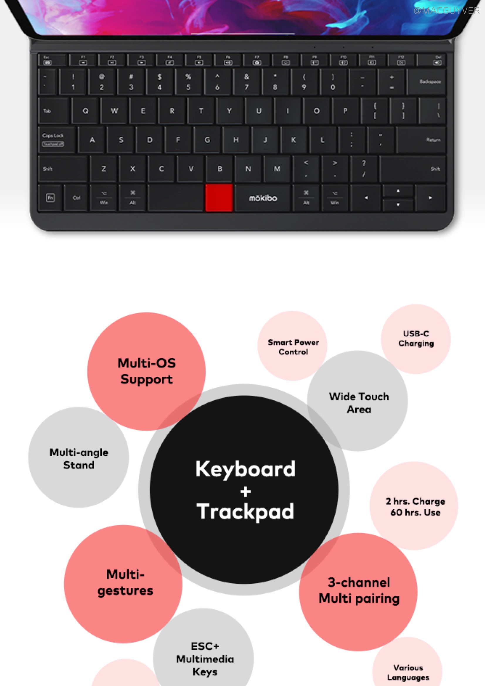 기대되는 변화들 제가 사용해본 제품은 모키보1이지만, 모키보 폴리오는 매직 키보드 대비 3배나 더 커진 트랙패드를 품었고, 아이패드 프로 전용 케이스 역할까지 하거든요. 거기다 3대 페어링까지 되니까 매직 키보드와 달리 범용성도 상당히 높아 보였습니다. 구조를 완전히 바꾸면서, 키캡 사이에 있던 전선을 아래로 옮겼고, 멀티 디바이스 키보드 키캡에 0.3mm 정도 굴곡을 넣고 키 간격도 0.7mm로 벌리면서 키감과 트랙패드 만족도를 높였다고 합니다. 블루투스 키보드 그냥 보기에도 재질이 달라 보이기도 하고, 조금 더 애플 정품스러운 높은 완성도와 디자인은 기대되는 변화 가운데 하나인데요.