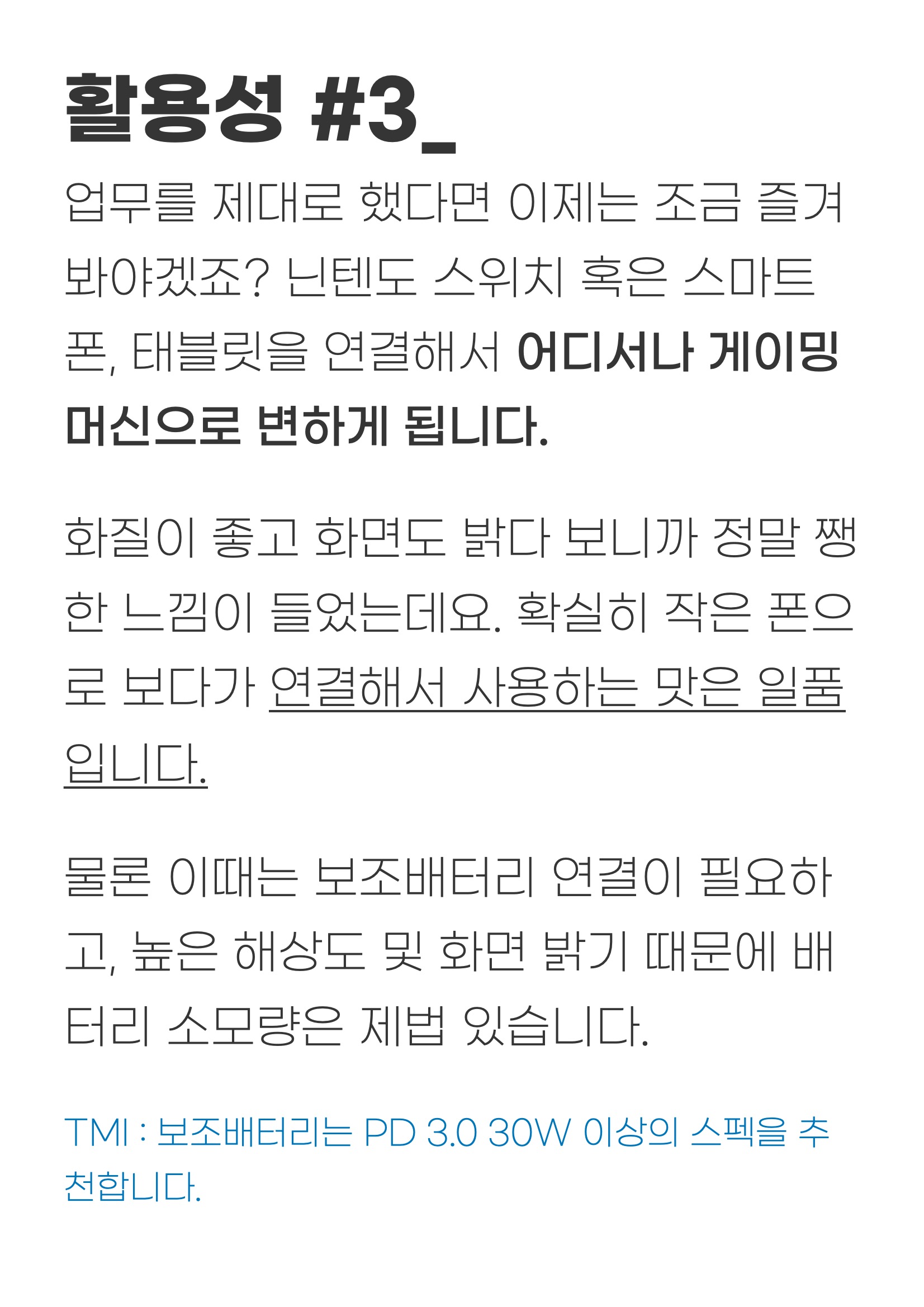 노트북 모니터 활용성 #3_ 업무를 제대로 했다면 이제는 조금 즐겨봐야겠죠? 닌텐도 스위치 혹은 스마트폰, 태블릿을 연결해서 어디서나 미러링 모니터 게이밍 머신으로 변하게 됩니다. 화질이 좋고 화면도 밝다 보니까 정말 쨍한 느낌이 들었는데요. 확실히 작은 폰으로 보다가 연결해서 사용하는 맛은 일품입니다. 물론 이때는 보조배터리 연결이 필요하고, 높은 해상도 및 화면 밝기 때문에 배터리 소모량은 제법 있습니다. TMI : 보조배터리는 PD 3.0 30W 이상의 스펙을 추천합니다. 맥북 외장 모니터 활용성 #4_ 여행을 떠나서도 유용한 캐리비전 4K 포터블 모니터는 노트북이나 태블릿 없이 간편한 연결만으로 영화 한 편 보기에 최적이었는데요. 무게도 가볍고 자체 거치 기능까지 있으니까 정말 편리하게 놓아두고 보기에 꼭 알맞았습니다. 무게도 가볍고, 사용하지 않을때는 접어두면 보관도 쉬우니까 여행을 떠나면서도 챙겨가기에 좋은 아이템이 되더라고요. TMI : 실제로 들어보면 기대 이상으로 가볍게 느껴집니다.