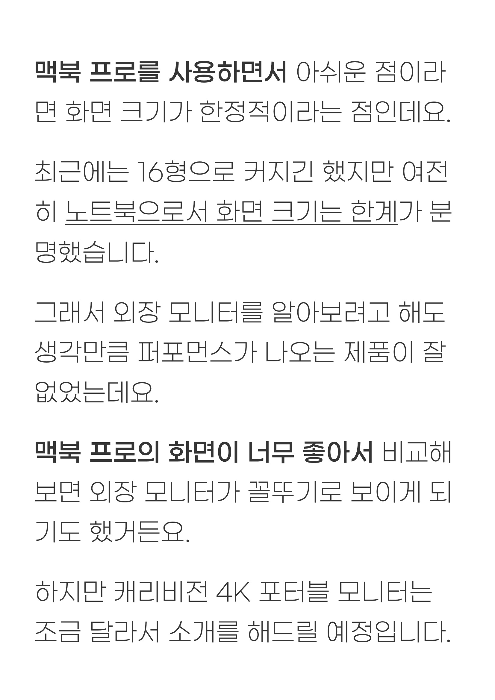 맥북 프로를 사용하면서 아쉬운 점이라면 화면 크기가 한정적이라는 점인데요. 최근에는 16형으로 커지긴 했지만 여전히 노트북으로서 화면 크기는 한계가 분명했습니다. 그래서 외장 모니터를 알아보려고 해도 생각만큼 퍼포먼스가 나오는 제품이 잘 없었는데요. 맥북 프로의 화면이 너무 좋아서 비교해보면 외장 모니터가 꼴뚜기로 보이게 되기도 했거든요. 하지만 캐리비전 4K 포터블 모니터는 조금 달라서 소개를 해드릴 예정입니다. 참고로 이번 휴대용 모니터 리뷰에서는 캐리비전 12in1 슈퍼허브를 5분에게 증정해드리는 댓글 이벤트도 함께 진행됩니다.
