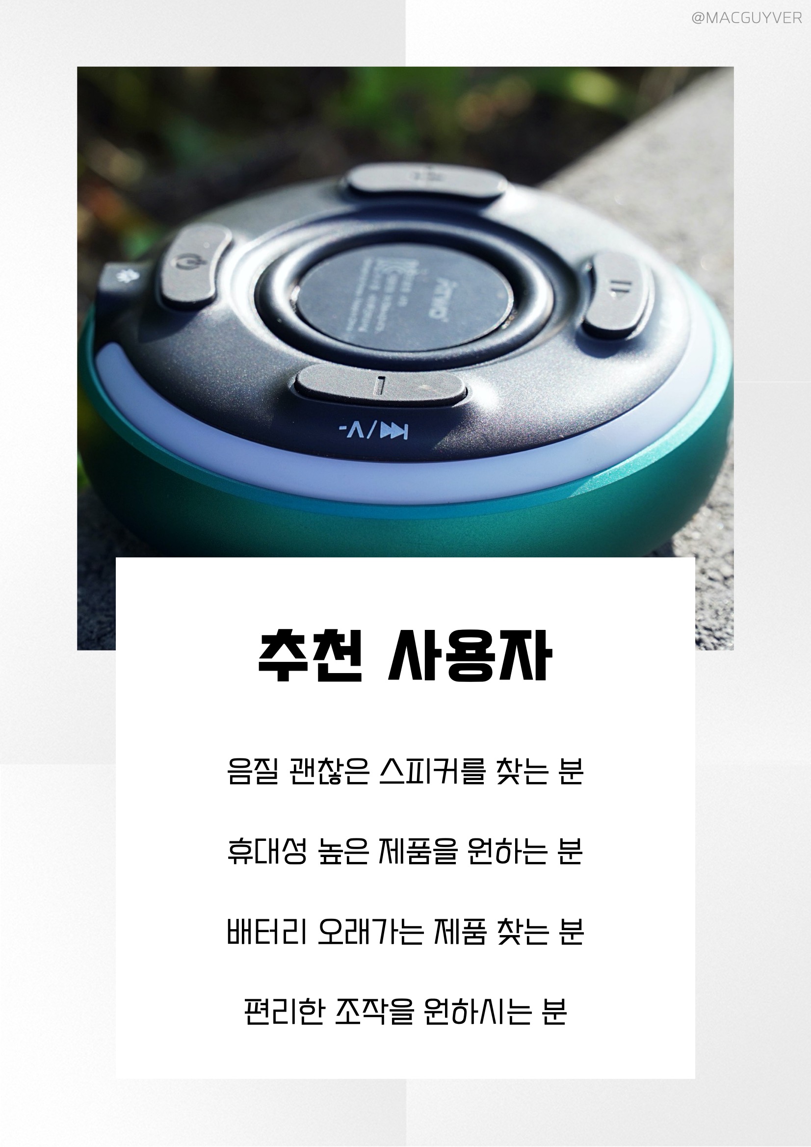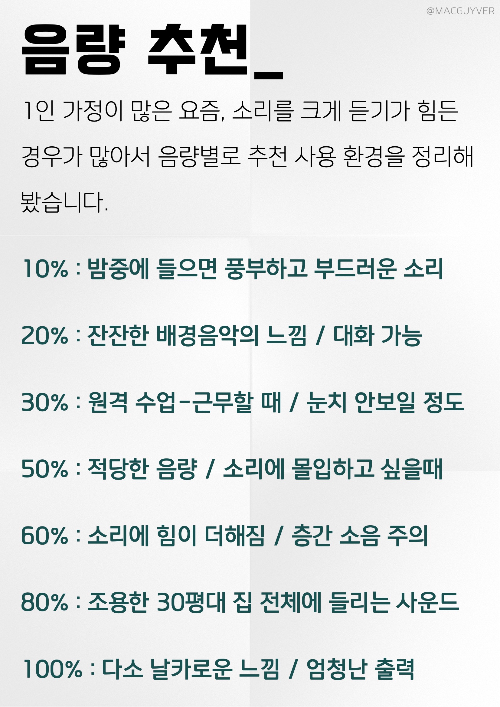 무선 블루투스 스피커 추천_ 1인 가정이 많은 요즘, 소리를 크게 듣기가 힘든 경우가 많아서 음량별로 추천 사용 환경을 정리해봤습니다. 블루투스 스피커 추천 10% : 밤중에 들으면 풍부하고 부드러운 소리 20% : 잔잔한 배경음악의 느낌 / 대화 가능 30% : 원격 수업-근무할 때 / 눈치 안보일 정도 50% : 적당한 음량 / 소리에 몰입하고 싶을때 60% : 소리에 힘이 더해짐 / 층간 소음 주의 80% : 조용한 30평대 집 전체에 들리는 사운드 100% : 다소 날카로운 느낌 / 엄청난 출력