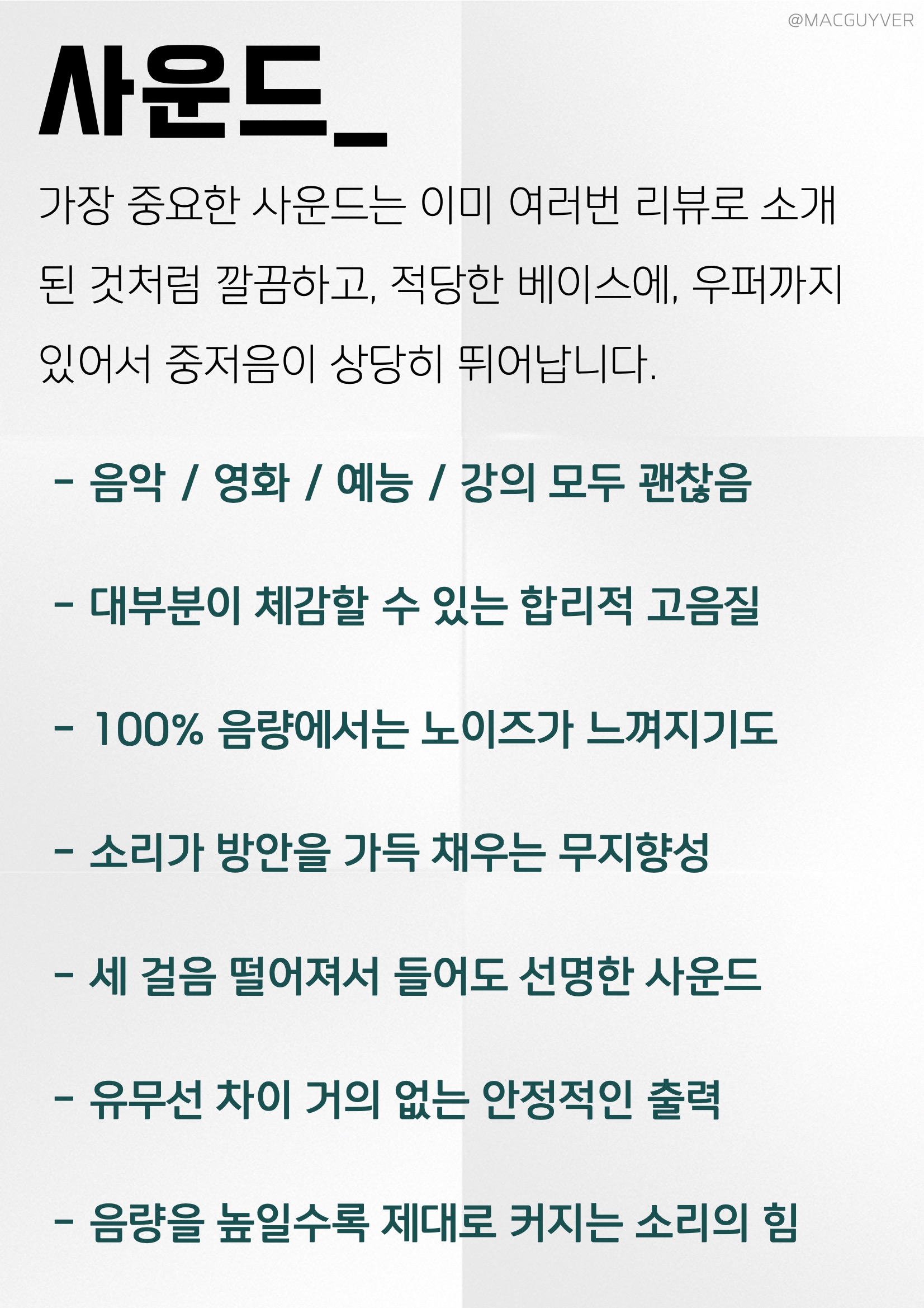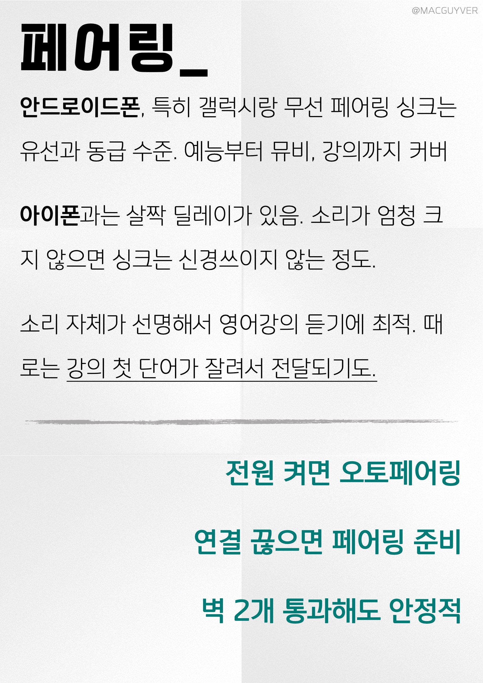 사운드_ 가장 중요한 사운드는 이미 여러번 리뷰로 소개된 것처럼 깔끔하고, 적당한 베이스에, 우퍼까지 있어서 중저음이 상당히 뛰어납니다. - 음악 / 영화 / 예능 / 강의 모두 괜찮음 - 대부분이 체감할 수 있는 합리적 고음질 - 100% 음량에서는 노이즈가 느껴지기도 - 소리가 방안을 가득 채우는 무지향성 - 세 걸음 떨어져서 들어도 선명한 사운드 - 유무선 차이 거의 없는 안정적인 출력 - 음량을 높일수록 제대로 커지는 소리의 힘 음량