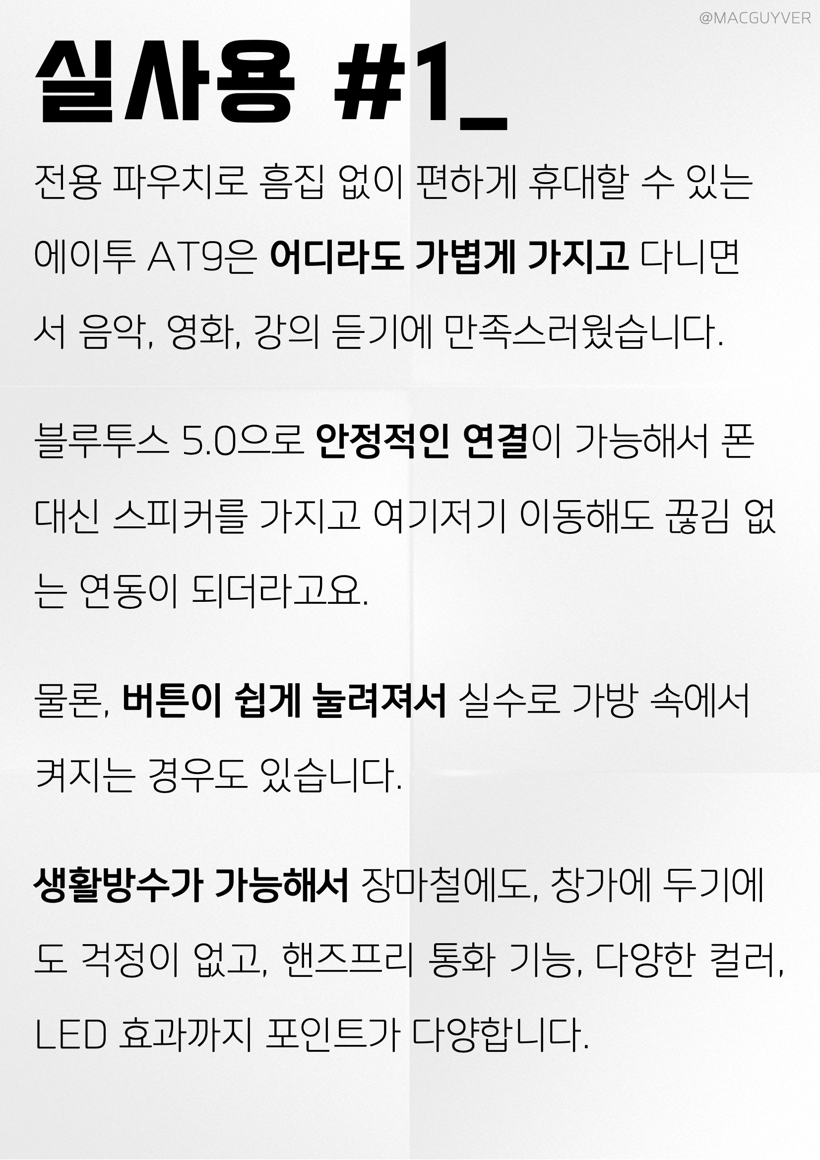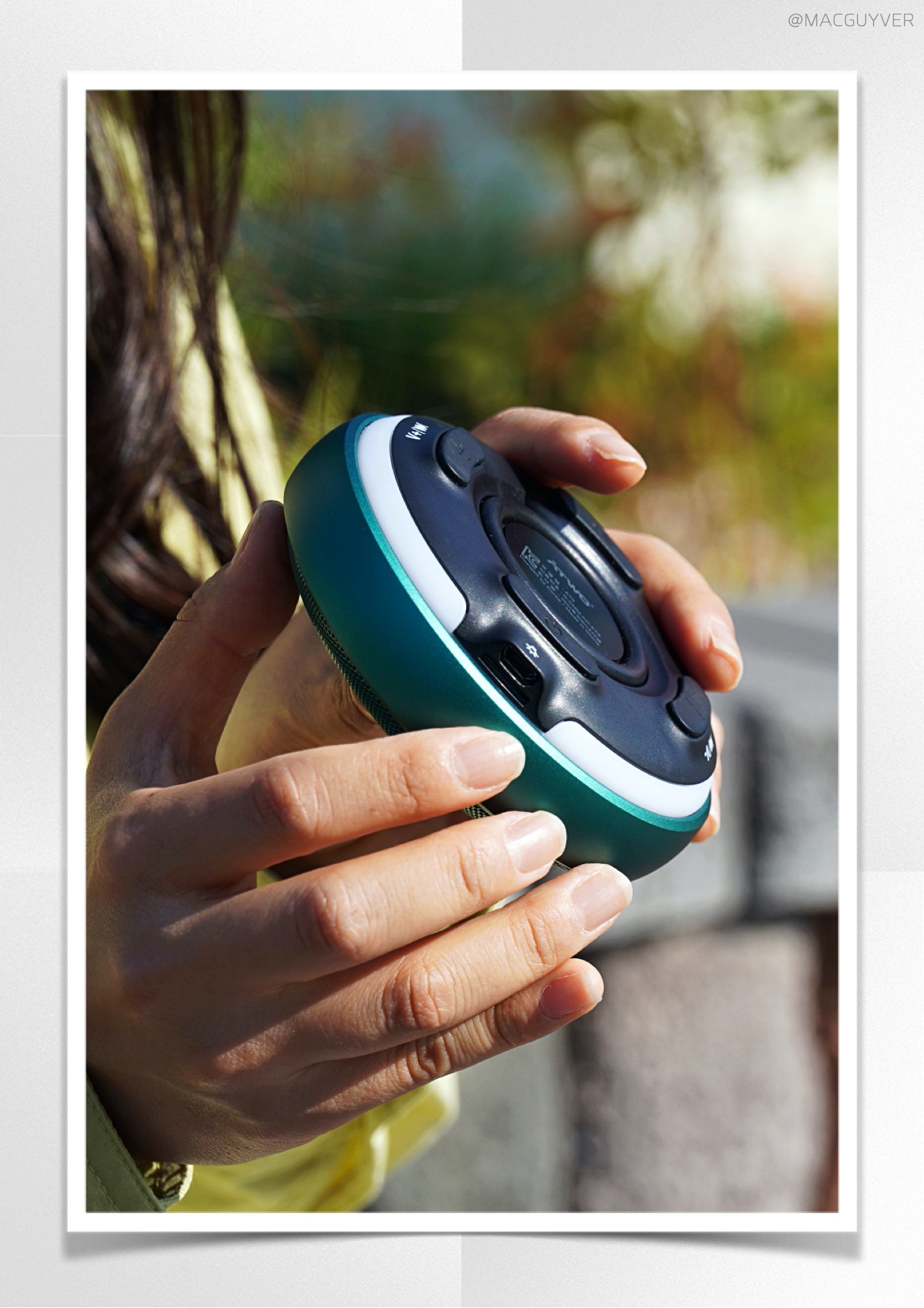 실사용 #1_ 전용 파우치로 흠집 없이 편하게 휴대할 수 있는 에이투 AT9은 어디라도 가볍게 가지고 다니면서 음악, 영화, 강의 듣기에 만족스러웠습니다. 블루투스 5.0으로 안정적인 연결이 가능해서 폰 대신 스피커를 가지고 여기저기 이동해도 끊김 없는 연동이 되더라고요. 물론, 버튼이 쉽게 눌려져서 실수로 가방 속에서 켜지는 경우도 있습니다. 에이투 스피커 생활방수가 가능해서 장마철에도, 창가에 두기에도 걱정이 없고, 핸즈프리 통화 기능, 다양한 컬러, LED 효과까지 포인트가 다양합니다.