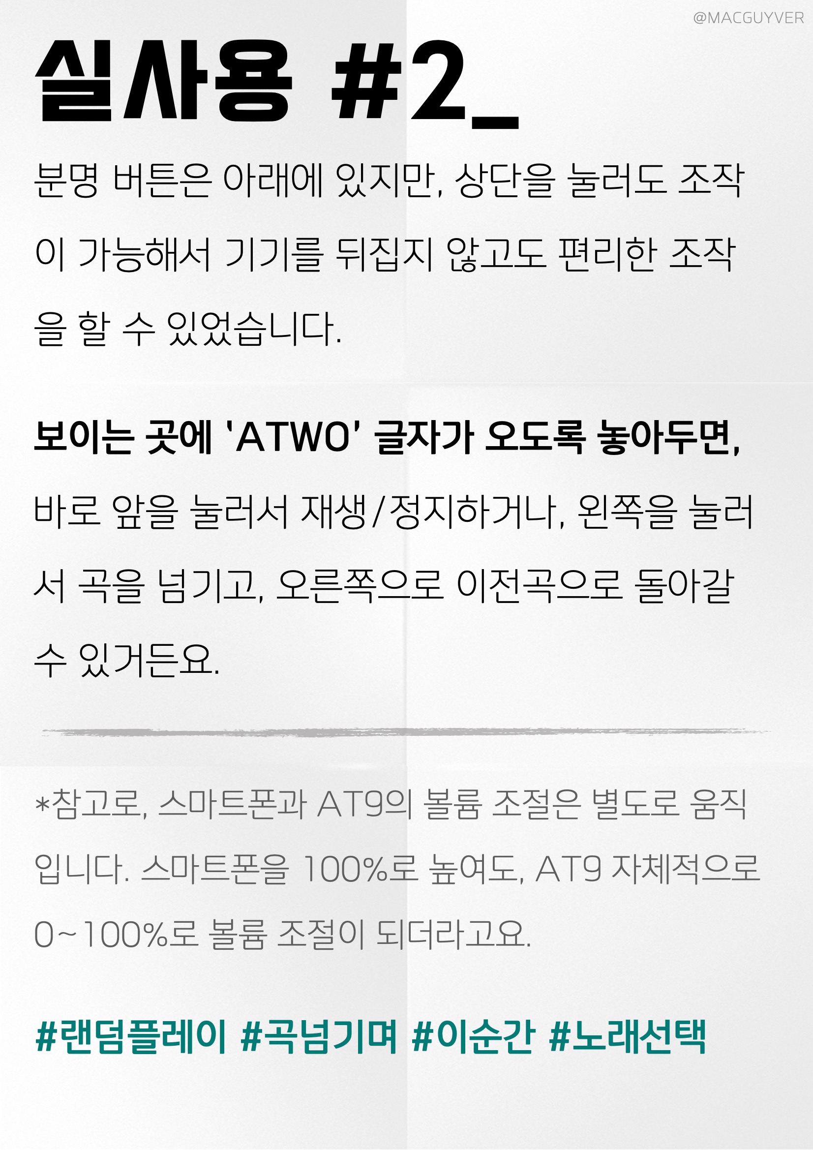 에이투 AT9 실사용 #2_ 분명 버튼은 아래에 있지만, 상단을 눌러도 조작이 가능해서 기기를 뒤집지 않고도 편리한 조작을 할 수 있었습니다. 보이는 곳에 ‘ATWO’ 글자가 오도록 에이투 스피커를 놓아두면, 바로 앞을 눌러서 재생/정지하거나, 왼쪽을 눌러서 곡을 넘기고, 오른쪽으로 이전곡으로 돌아갈 수 있거든요. 휴대용 스피커 *참고로, 스마트폰과 AT9의 볼륨 조절은 별도로 움직입니다. 스마트폰을 100%로 높여도, AT9 자체적으로 0~100%로 볼륨 조절이 되더라고요. 블루투스 스피커 #랜덤플레이 #곡넘기며 #이순간 #노래선택