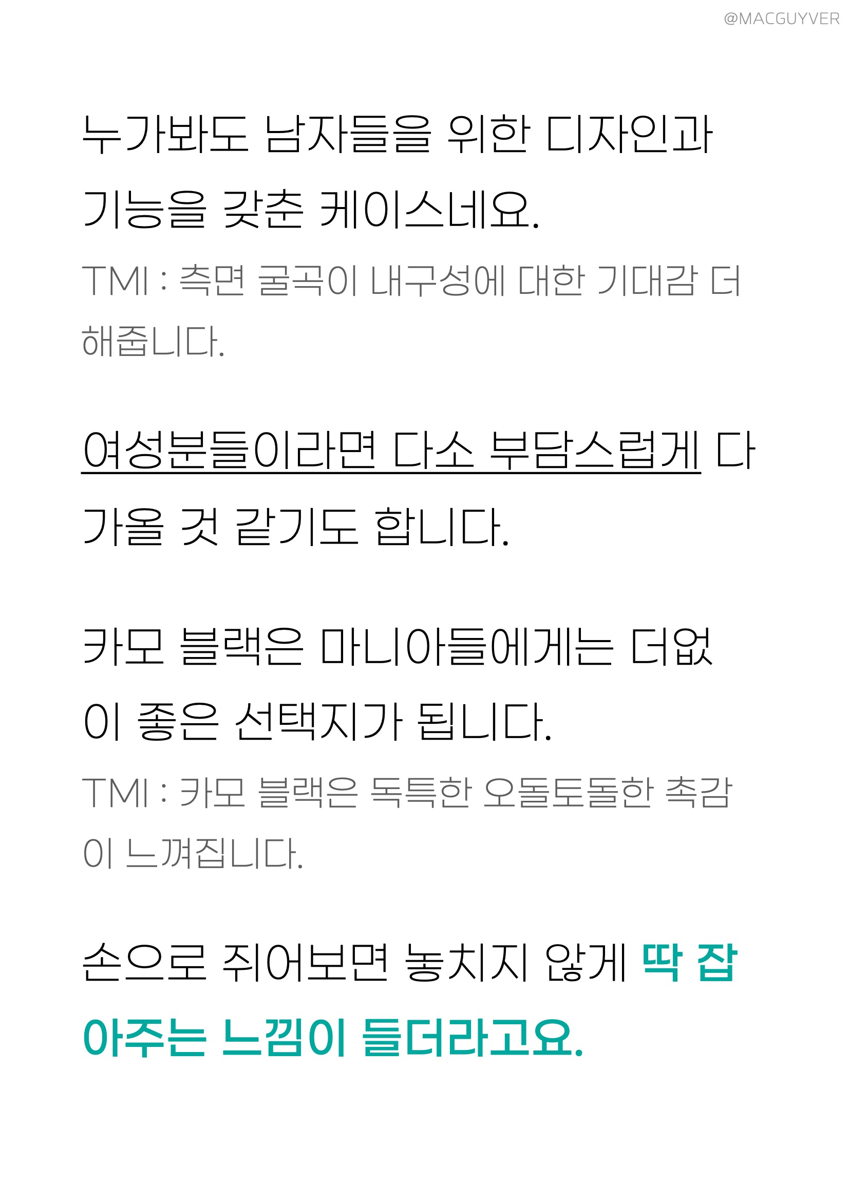 에어 케이스 - 번들 케이스와 비슷한 재질감 - 유연하면서 슬림한 핏감까지 - 유막 방지로 오랫동안 깨끗하게 - 8.02x16.7x1.1cm / 28.7g - 정가 : 12,800원 - 할인가 : 6,800원 실사용 소감_ 카메라 보호 테두리의 존재감이 제법 느껴집니다. 갤럭시 노트20 울트라 케이스 탈착은 역대급으로 간편하고, 어느 모서리에서도 쉽게 탈착이 됩니다. 생폰과 비교해서 손맛이 상당히 다릅니다. 조금 뻑뻑하기도 하더라고요. TMI : 폰을 손에서 자주 놓치는 분들이라면 딱 좋은 그립감을 주기도 합니다. 손에 땀이 많은 분들은 유분 자국까지 제법 남을 수 있습니다. TMI : 땀이 많다면 오히려 미끄러울수도 있겠네요. 메인 컬러인 브론즈에 스모크 블랙 에어 케이스를 씌우니까 오묘하게 예쁩니다. (Feat.취저)