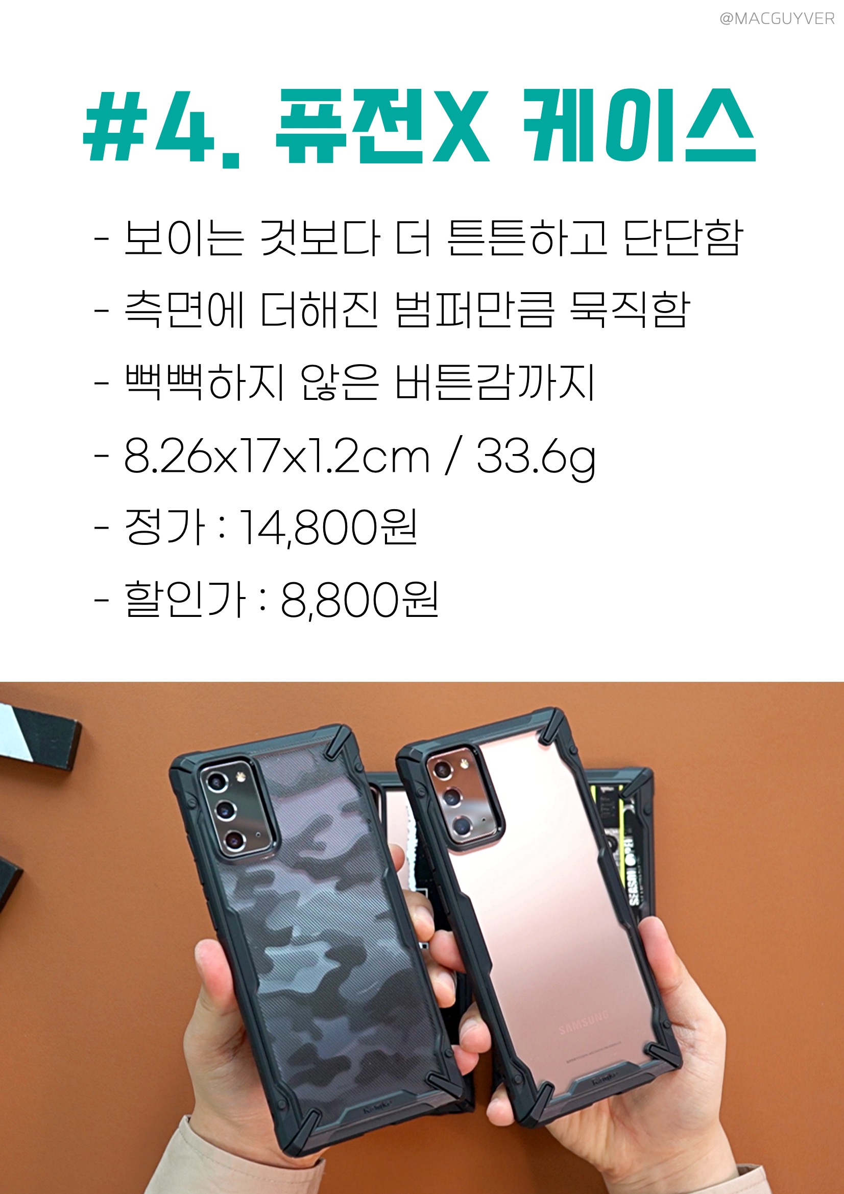 갤노트20 울트라 케이스 링케 에어S 케이스 - SF 코팅으로 은근한 컬러감 전달 - 1.5mm 슬림한 두께 높은 그립감 - 핑크샌드, 라벤더 그레이, 블랙 컬러 - 8.02x16.7x1.1cm / 28.7g - 정가 : 13,800원 - 할인가 : 7,800원 3가지 컬러 모두 거부감 없는 컬러감으로 파스텔톤 느낌입니다. 개인적으로 블랙보다는 라벤더 그레이, 핑크샌드가 더 예쁘네요. 특히 화이트에 가까운 은은한 핑크빛의 핑크샌드 컬러는 여리여리해서 여심 저격을 제대로 합니다. 갤럭시노트20 케이스 TMI : 브론즈 컬러와 핑크샌드가 잘 어울리고, 화이트 컬러와 라벤더 그레이가 잘 어울리더라고요. 전체적으로는 울트라보다는 기본 갤노트20 컬러와 에어S 케이스 컬러가 더 잘 어울리기도 합니다. #4. 퓨전X 케이스 - 보이는 것보다 훨씬 더 튼튼하고 단단함 - 측면에 더해진 범퍼만큼 체감되는 무게감 - 실사용시 전혀 뻑뻑하지 않은 버튼감까지 - 8.26x17x1.2cm / 33.6g - 정가 : 14,800원 - 할인가 : 8,800원