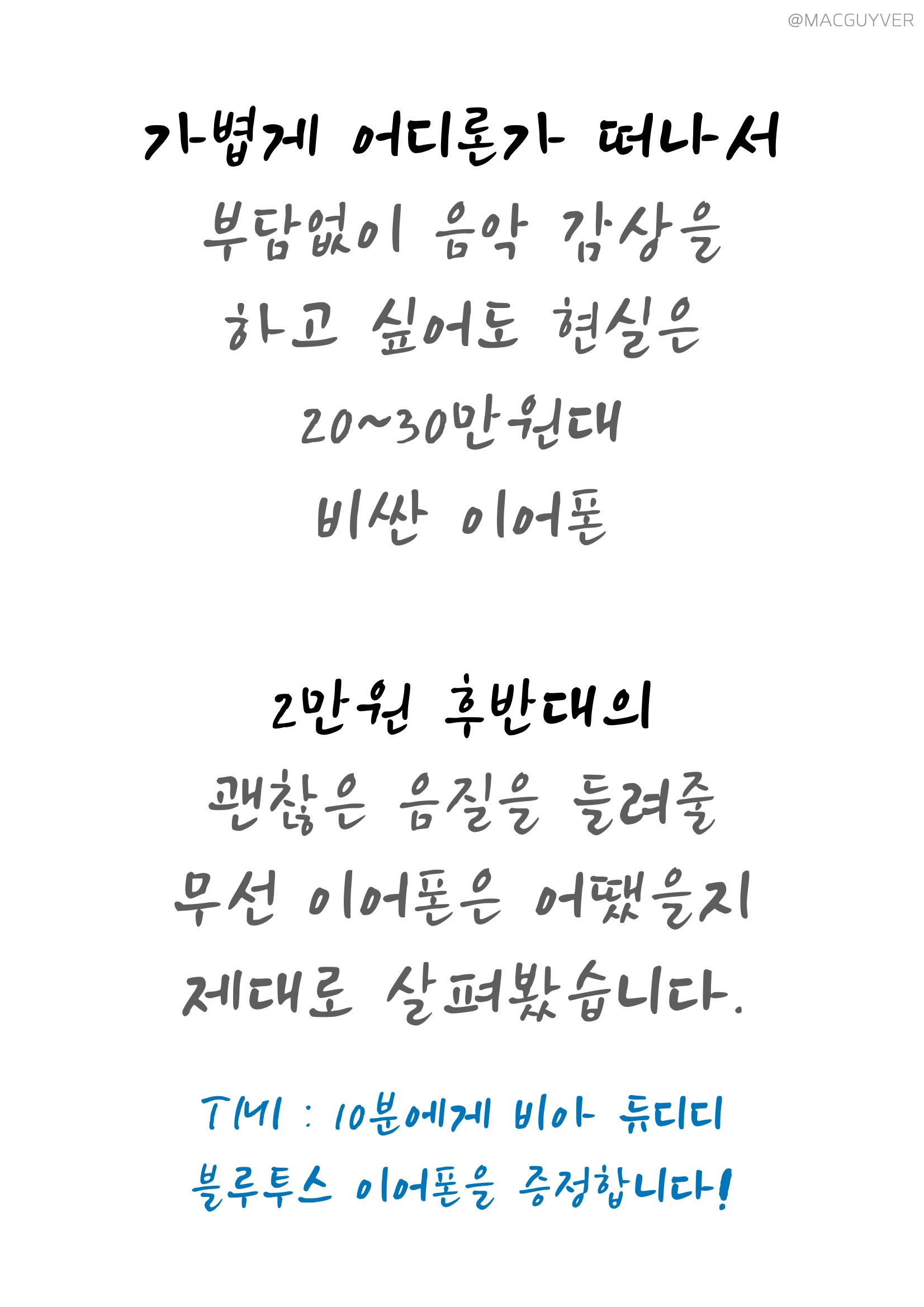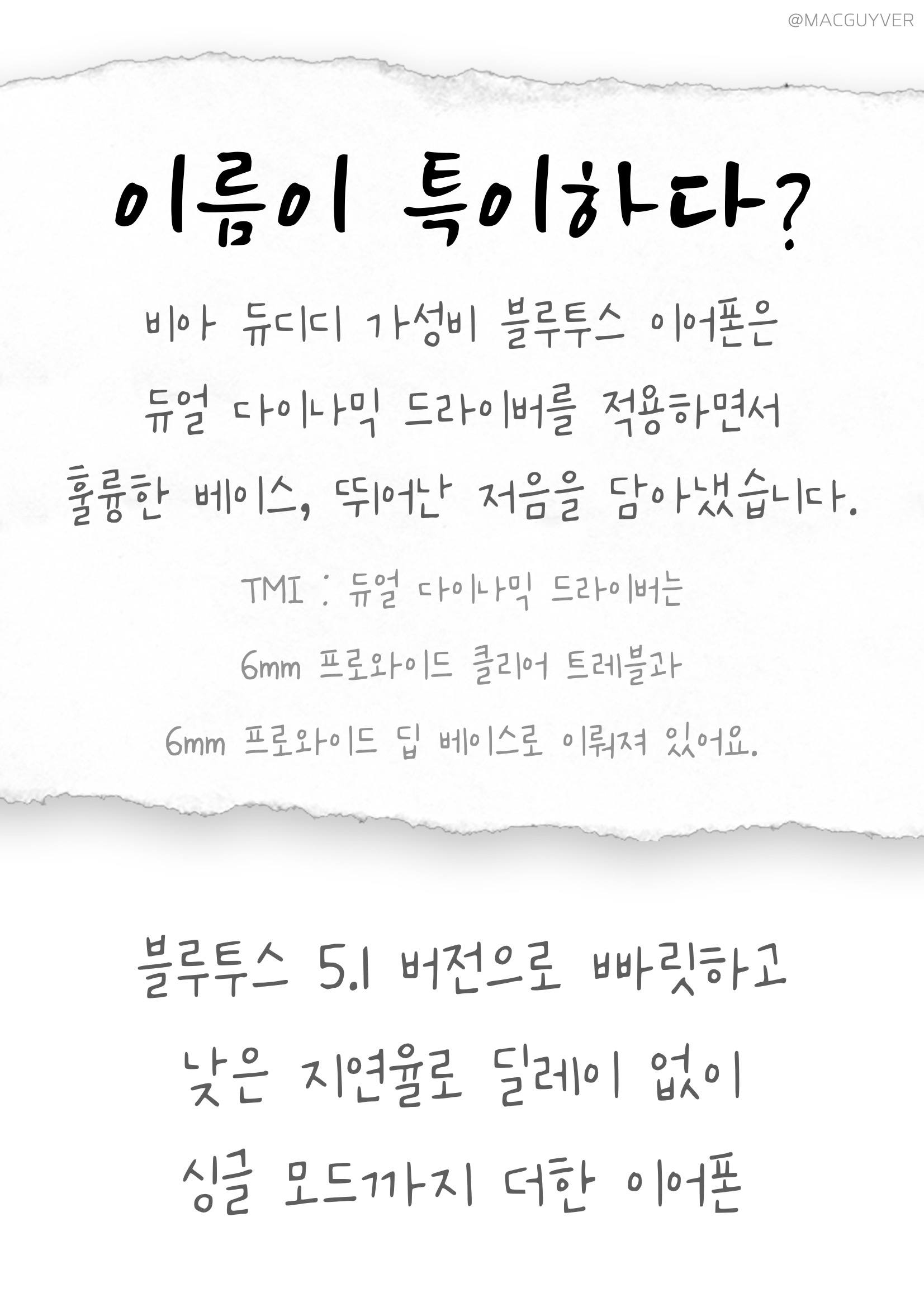 가볍게 어디론가 떠나서 부담없이 음악 감상을 하고 싶어도 현실은 20~30만원대 비싼 이어폰 2만원 후반대의 괜찮은 음질을 들려줄 무선 이어폰은 어땠을지 제대로 살펴봤습니다. 가성비 블루투스 이어폰 추천 TMI : 10분에게 비아 듀디디 이어폰을 증정합니다! 이름이 특이하다? 비아 듀디디라는 이름의 가성비 블루투스 이어폰은 듀얼 다이나믹 드라이버를 적용하면서 훌륭한 베이스, 뛰어난 저음을 담아냈습니다. 무선 이어폰 QCY TMI : 듀얼 다이나믹 드라이버는 6mm 프로와이드 클리어 트레블과 6mm 프로와이드 딥 베이스로 이뤄져 있어요.