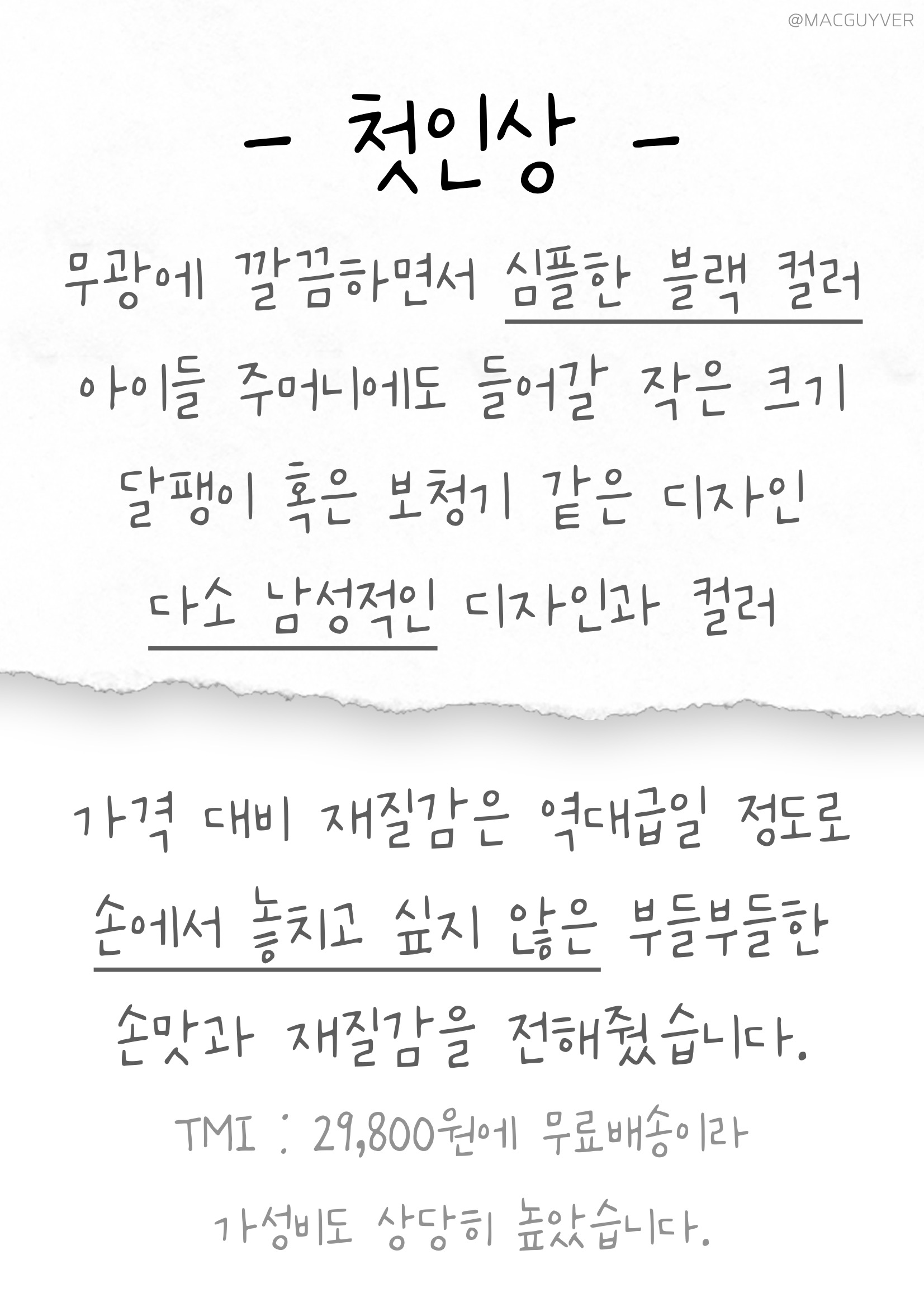 블루투스 5.1 버전으로 빠릿하고 낮은 지연율로 딜레이 없이 싱글 모드까지 더한 이어폰 비아 듀디디 첫인상 무광에 깔끔하면서 심플한 블랙 컬러 아이들 주머니에도 들어갈 작은 크기 달팽이 혹은 보청기 같은 디자인 다소 남성적인 디자인과 컬러 가격 대비 재질감은 역대급일 정도로 손에서 놓치고 싶지 않은 부들부들한 손맛과 재질감을 전해줬습니다. TMI : 29,800원에 무료배송이라 가성비도 상당히 높았습니다. 제가 들어본 사운드는 베이스가 정말 뛰어나서 시원시원하고 저음까지 제대로 깊이감있는 사운드 고음은 선예도가 약간 아쉬운 듯한 중저음, 베이스에 맞춰진 소리 TMI : 화이트 노이즈는 일반적인 수준으로 약간 느껴지는, 예민하면 들리는 정도였어요.