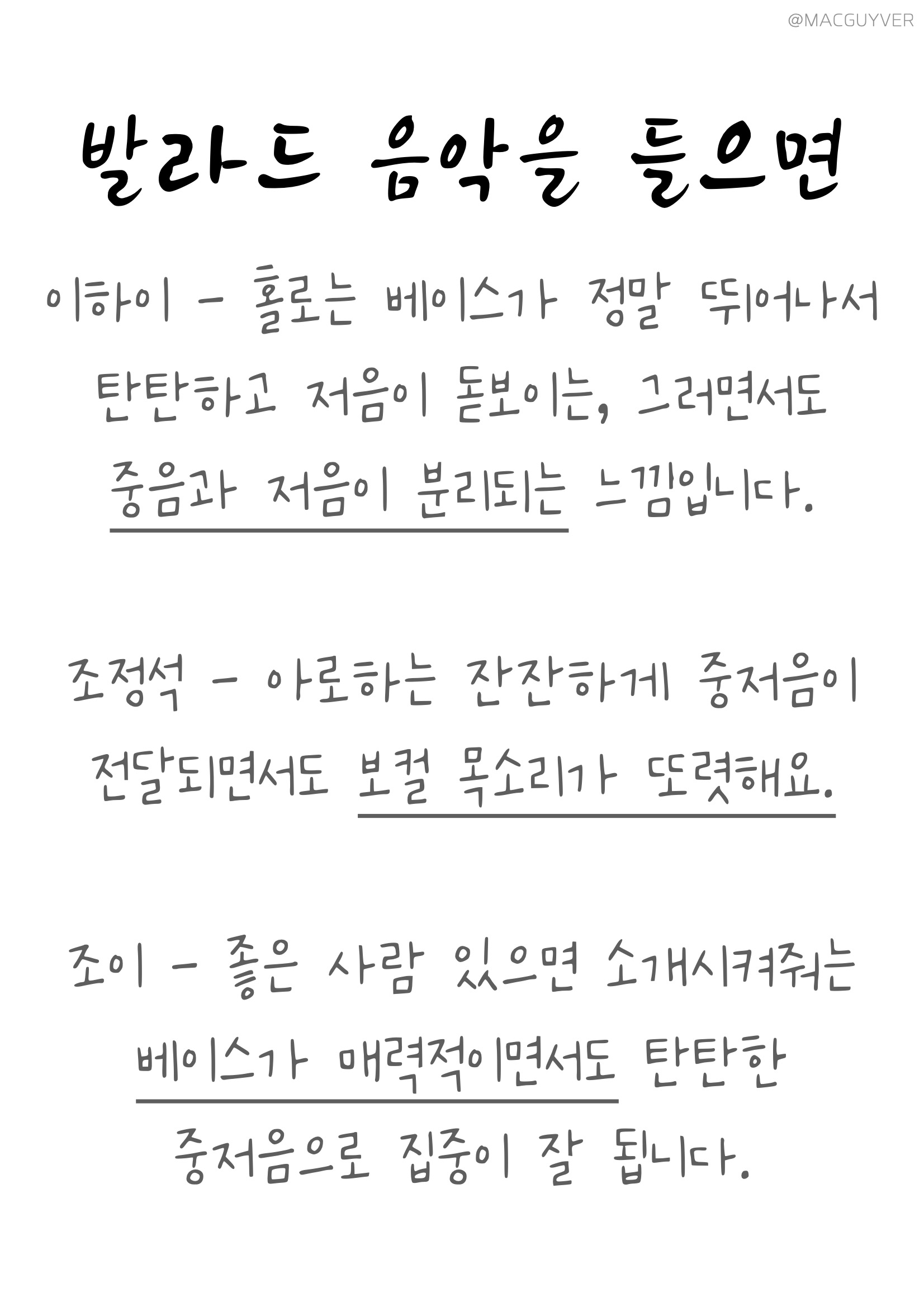 가성비 블루투스 이어폰 해상력은 고음부를 제외하자면 기대 이상이지만 선예도가 아주 높으면서 찌르는 고음은 아닙니다. TMI : 언박싱 이후에 하루 정도는 자주 듣는 음악을 재생해두시면 에이징이 되면서 소리가 더 좋아져요. 발라드 음악을 들으면 이하이 - 홀로는 베이스가 정말 뛰어나서 탄탄하고 저음이 돋보이는, 그러면서도 중음과 저음이 분리되는 느낌입니다. 조정석 - 아로하는 잔잔하게 중저음이 전달되면서도 보컬 목소리가 또렷해요. 조이 - 좋은 사람 있으면 소개시켜줘는 베이스가 매력적이면서도 탄탄한 중저음으로 집중이 잘 됩니다.