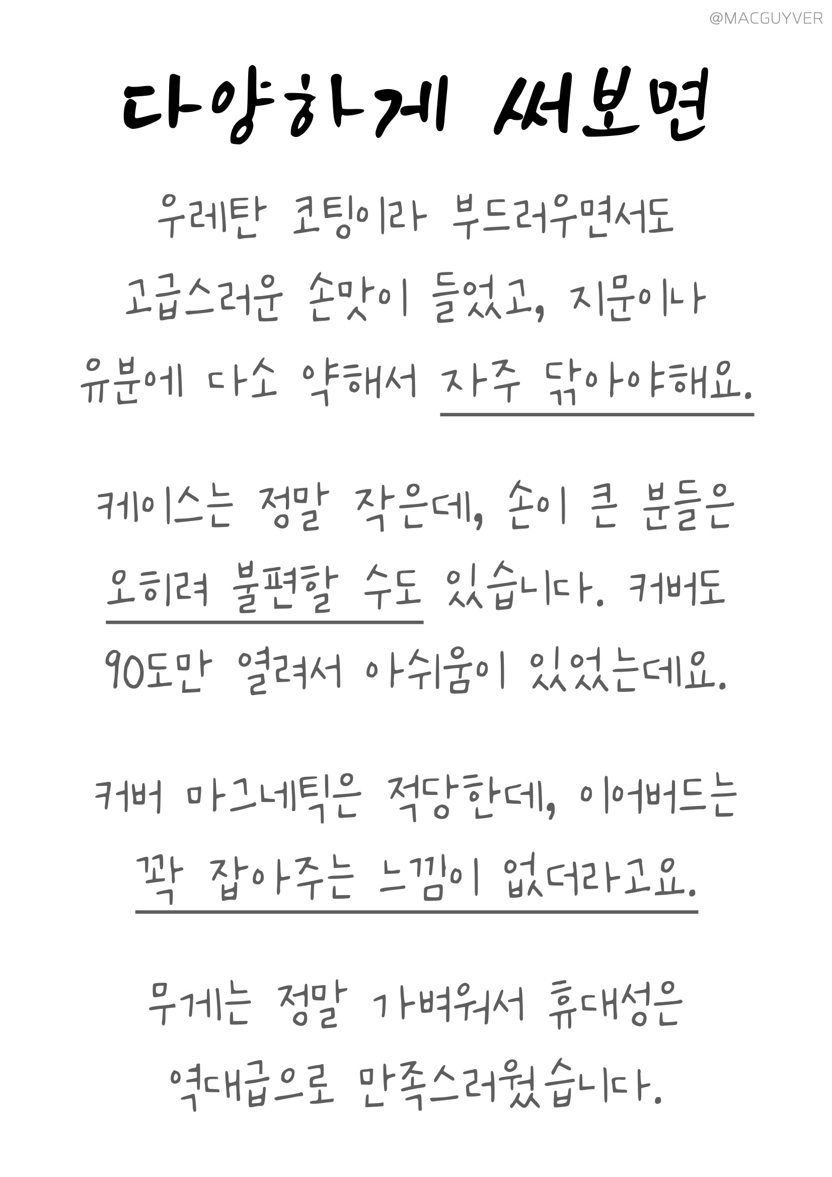 가성비 블루투스 이어폰 장시간 착용시 2시간부터는 압박감이 3시간 부터는 약간 통증이 있어요. 조작을 해보면 조작 반응 속도는 상당히 빨라서 0.5초 이내로 반응이 나왔습니다. 버튼 방식이라 압박감이 약간 있고 누를때 존재감도 있는데요, 불편할 정도는 아니더라고요. 버튼 소리는 고급스럽지 않고 일반적인 '딸깍'하는 소리가 들립니다. 무선 이어폰 QCY 전화 받고 끊기, 재생 정지, 볼륨 조절, 곡 넘김, 음성 비서 호출까지 다양한 기능 조작이 모두 가능했습니다. TMI : 3버튼 클릭은 자주 안쓰게 되더라고요. 다양하게 써보면 우레탄 코팅이라 부드러우면서도 고급스러운 손맛이 들었고, 지문이나 유분에 다소 약해서 자주 닦아야해요. 케이스는 정말 작은데, 손이 큰 분들은 오히려 불편할 수도 있습니다.