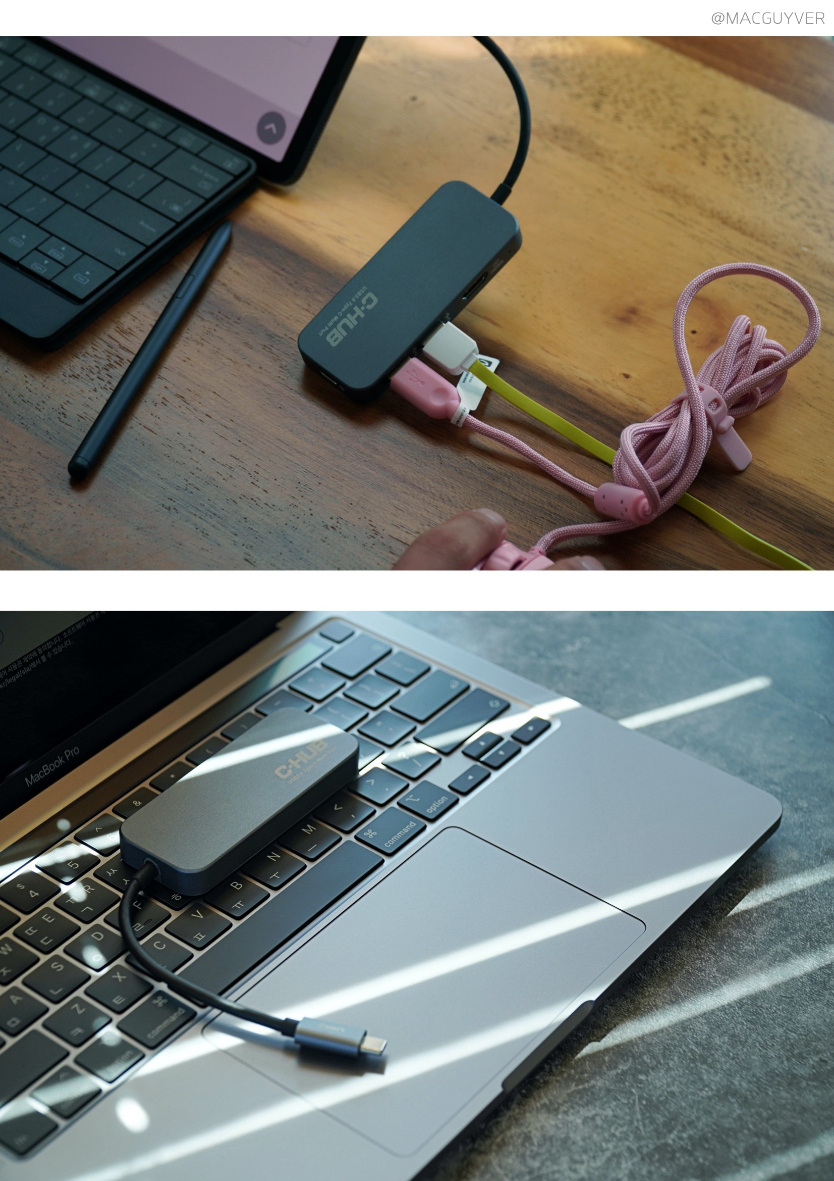 하단부는 미끄럼 방지 처리까지 되어서 맥북과 겹처도 흠집을 예방하더라고요. 아이패드 프로 USB 허브 케이블 일체형이라서 별도로 휴대하지 않고 제품만 가지고 이동할 수 있게 디자인이 되었는데, 이러한 방식은 호불호가 있기도 합니다. 맥북 허브 UM2 USB C허브 케이블만 고장나도 기기를 수리해야 하고, 길이가 애매할 때 교체하기도 번거롭기 때문이죠. 이 제품은 컨셉 자체가 작고 가볍고 바로 꽂아서 사용하는 방식이라 적당히 짧은 케이블도 잘 어울리는 것 같네요. 실사용 :: 실제로 만져보고 사용해본 UM2 허브는 단자 결착력은 적당해서 너무 뻑뻑하거나 무르지 않게 잡아주는 느낌이 들었습니다.