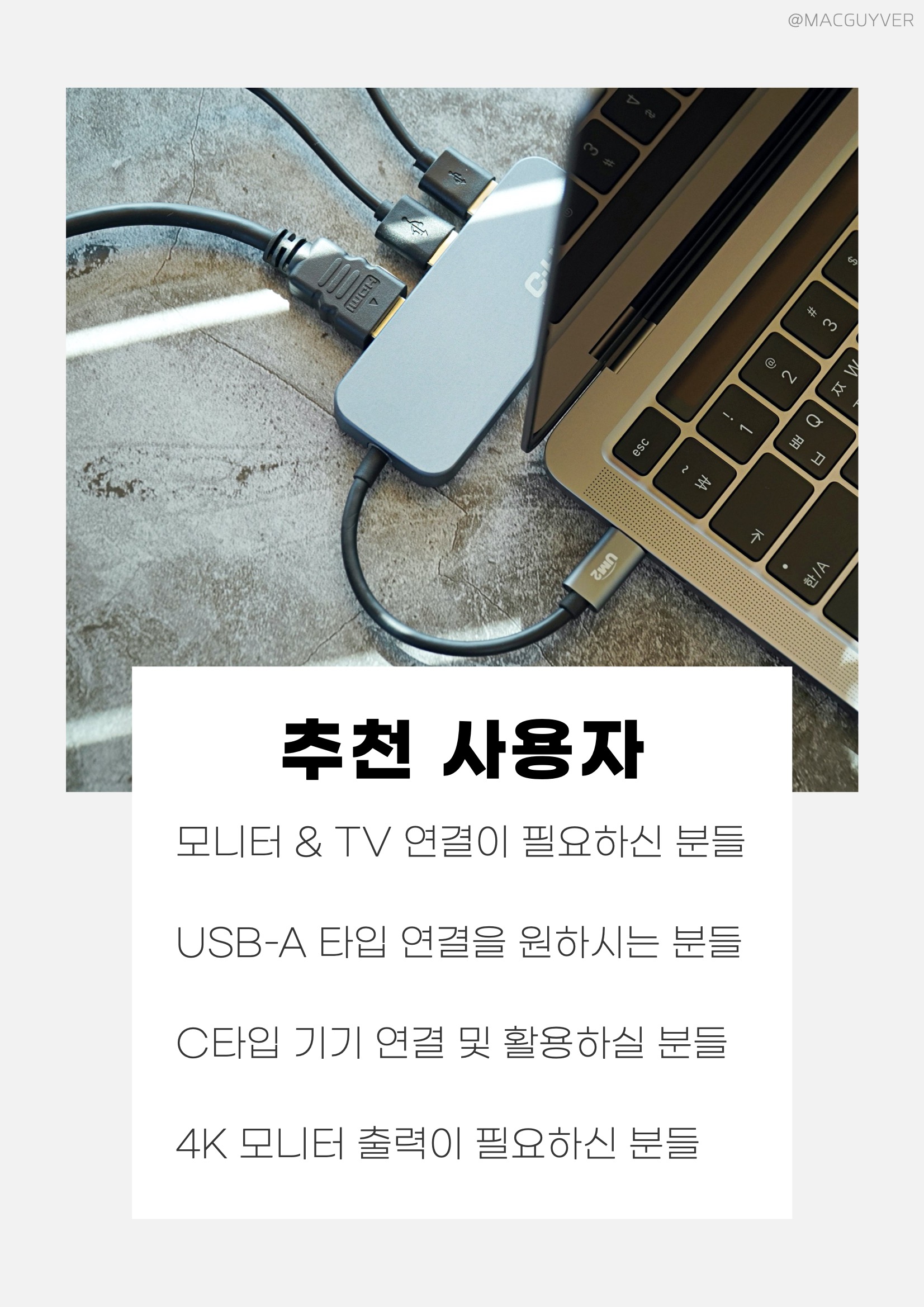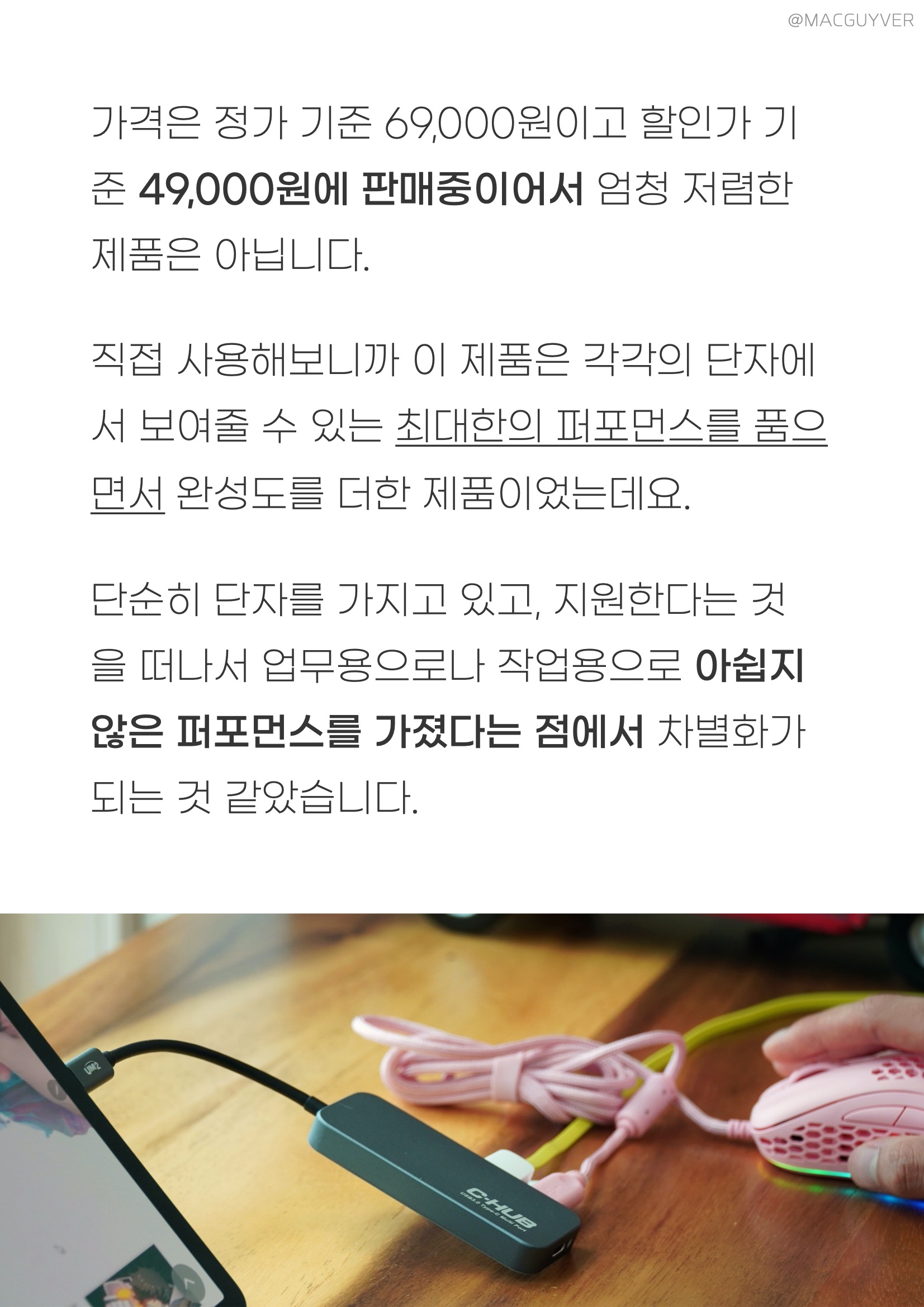 참고로 별도의 파우치는 없기 때문에 휴대할 때 UM2의 윗면과 맥북 프로 및 다른 기기가 맞닿아 있으면 흠집을 낼 수 있어서 주의해야 합니다. 맥북 허브 UM2 USB C허브 가격은 정가 기준 69,000원이고 할인가 기준 49,000원에 판매중이어서 엄청 저렴한 제품은 아닙니다. 직접 사용해보니까 이 제품은 각각의 단자에서 보여줄 수 있는 최대한의 퍼포먼스를 품으면서 완성도를 더한 제품이었는데요. 아이패드 프로 USB 허브 단순히 단자를 가지고 있고, 지원한다는 것을 떠나서 업무용으로나 작업용으로 아쉽지 않은 퍼포먼스를 가졌다는 점에서 차별화가 되는 것 같았습니다. 추천 사용자 모니터 & TV 연결이 필요하신 분들 USB-A 타입 연결을 원하시는 분들 C타입 기기 연결 및 활용하실 분들 4K 모니터 출력이 필요하신 분들