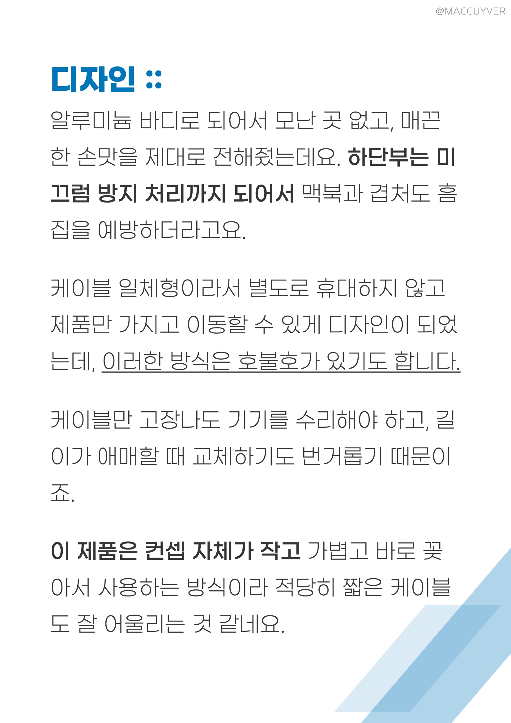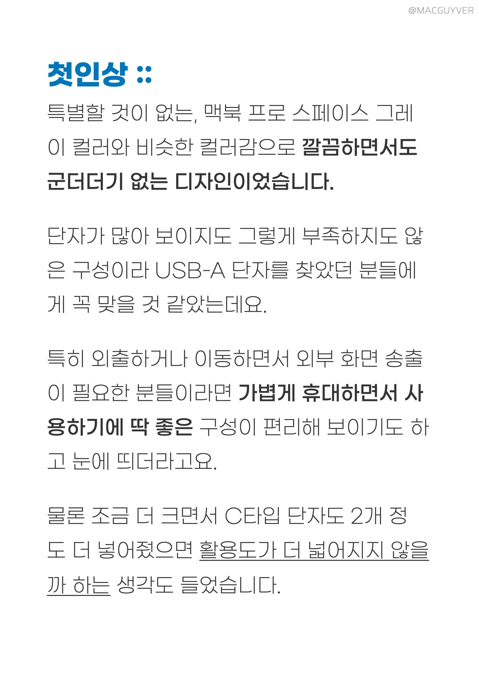 첫인상 :: 특별할 것이 없는, 맥북 프로 스페이스 그레이 컬러와 비슷한 컬러감으로 깔끔하면서도 군더더기 없는 디자인이었습니다. 단자가 많아 보이지도 그렇게 부족하지도 않은 구성이라 USB-A 단자를 찾았던 분들에게 꼭 맞을 것 같았는데요. 아이패드 프로 USB 허브 특히 외출하거나 이동하면서 외부 화면 송출이 필요한 분들이라면 가볍게 휴대하면서 사용하기에 딱 좋은 구성이 눈에 띄더라고요. 물론 아주 조금 더 크면서 C타입 단자도 2개 정도 더 넣어줬으면 하는 생각도 들었습니다. 디자인 :: 알루미늄 바디로 되어서 모난 곳 없고, 매끈한 손맛을 제대로 전해줬는데요.