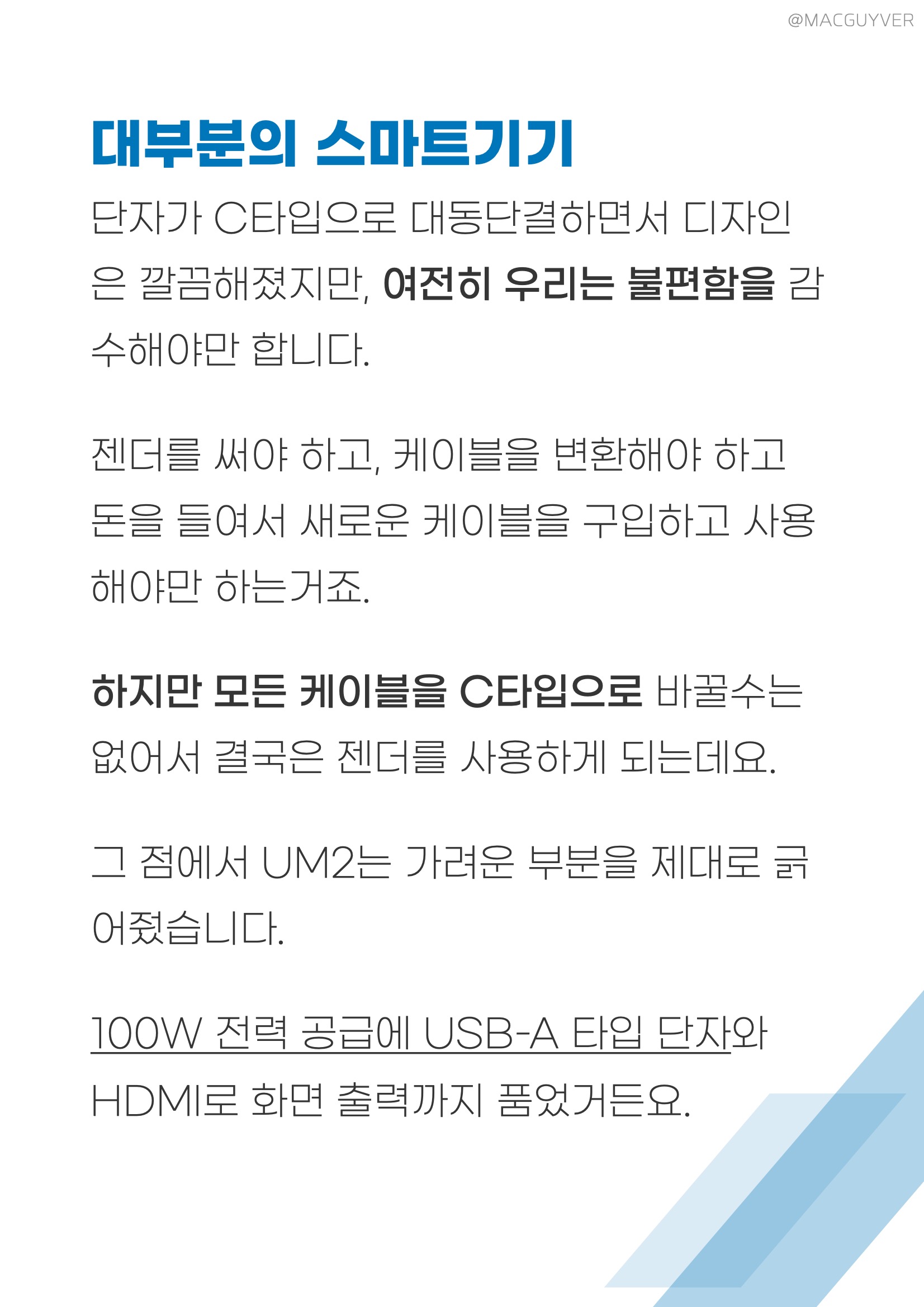 대부분의 스마트기기 단자가 C타입으로 대동단결하면서 디자인은 깔끔해졌지만, 여전히 우리는 불편함을 감수해야만 합니다. 젠더를 써야 하고, 케이블을 변환해야 하고 돈을 들여서 새로운 케이블을 구입하고 사용해야만 하는거죠. 하지만 모든 케이블을 C타입으로 바꿀수는 없어서 결국은 젠더를 사용하게 되는데요. 맥북 허브 UM2 USB C허브는 그 점에서 UM2는 가려운 부분을 제대로 긁어줬습니다. 아이패드 프로 USB 허브 100W 전력 공급에 USB-A 타입 단자와 HDMI로 화면 출력까지 품었거든요.