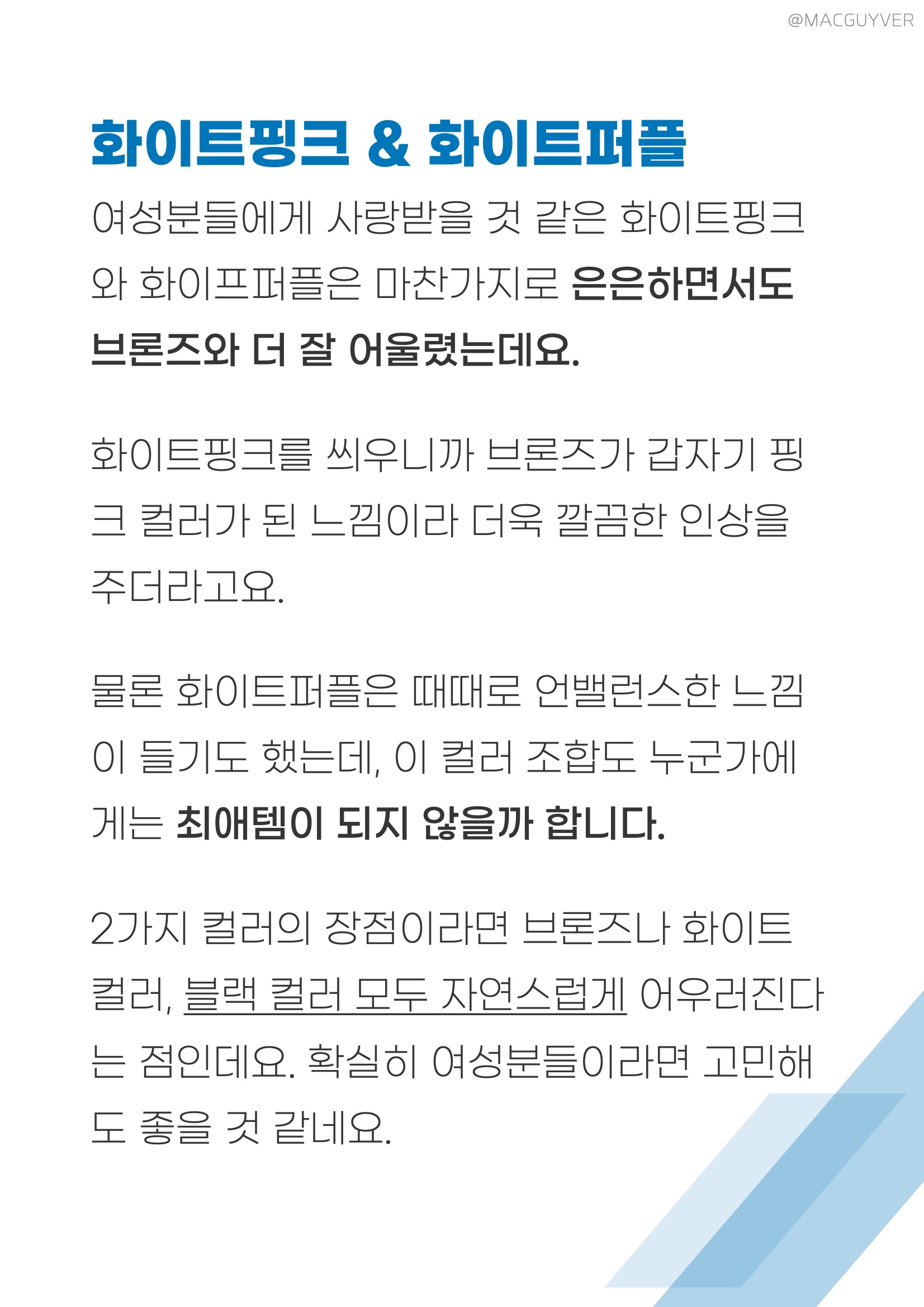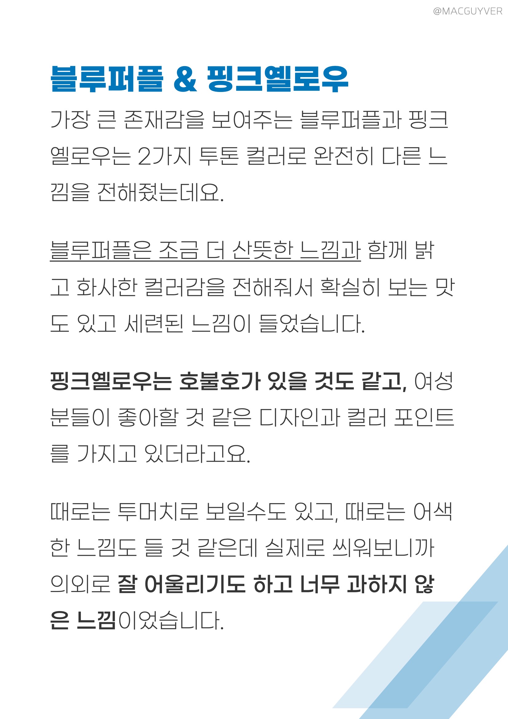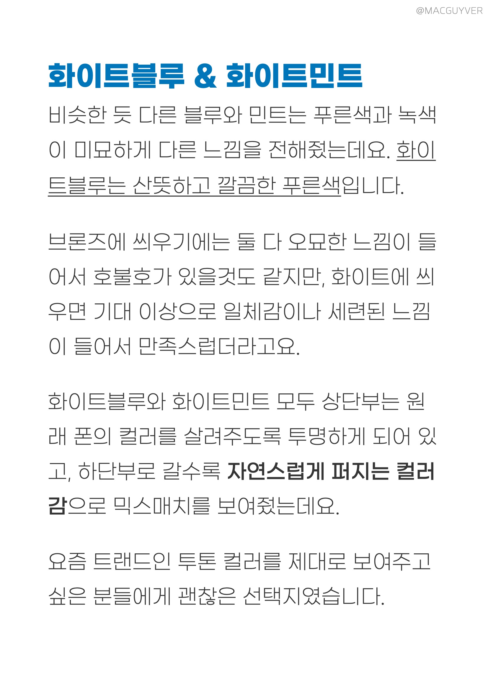 나하로 케이스 블루퍼플 & 핑크옐로우 가장 큰 존재감을 보여주는 블루퍼플과 핑크옐로우는 2가지 투톤 컬러로 완전히 다른 느낌을 전해줬는데요. 블루퍼플은 조금 더 산뜻한 느낌과 함께 밝고 화사한 컬러감을 전해줘서 확실히 보는 맛도 있고 세련된 느낌이 들었습니다. 갤럭시노트20 울트라 케이스 핑크옐로우는 호불호가 있을 것도 같고, 여성분들이 좋아할 것 같은 디자인과 컬러 포인트를 가지고 있더라고요. 갤노트 케이스 때로는 투머치로 보일수도 있고, 때로는 어색한 느낌도 들 것 같은데 실제로 씌워보니까 의외로 잘 어울리기도 하고 너무 과하지 않은 느낌이었습니다. 갤럭시노트20 케이스 화이트블루 & 화이트민트 비슷한 듯 다른 블루와 민트는 푸른색과 녹색이 미묘하게 다른 느낌을 전해줬는데요. 화이트블루는 정말 산뜻하고 깔끔하게 떨어지는 푸른색 컬러였습니다. 나하로 케이스 브론즈에 씌우기에는 둘 다 오묘한 느낌이 들어서 호불호가 있을것도 같지만, 화이트에 씌우면 기대 이상으로 일체감이나 세련된 느낌이 들어서 만족스럽더라고요. 갤노트20 케이스 화이트블루와 화이트민트 모두 상단부는 원래 폰의 컬러를 살려주도록 투명하게 되어 있고, 갤럭시노트20 그라데이션 케이스 하단부로 갈수록 자연스럽게 퍼지는 컬러감으로 믹스매치를 보여줬는데요. 요즘 트랜드인 투톤 컬러를 제대로 보여주고 싶은 분들에게 괜찮은 선택지가 아닐까 합니다.