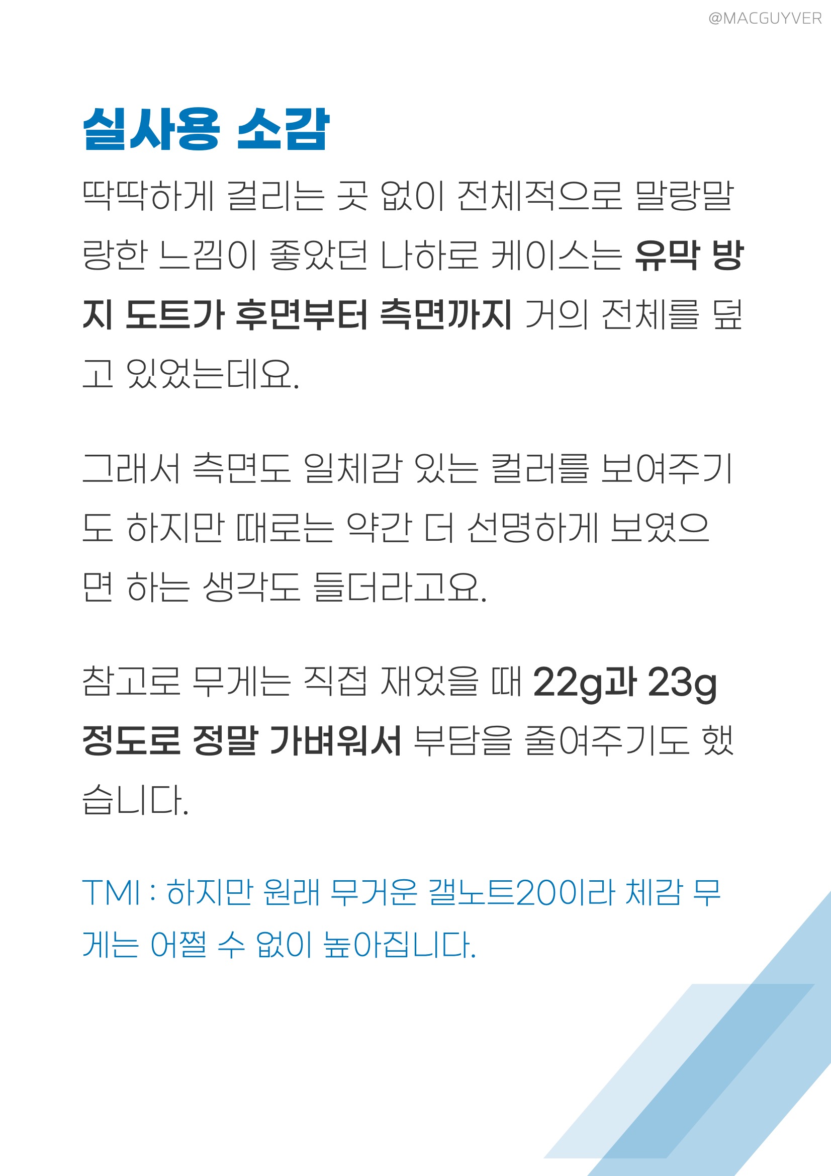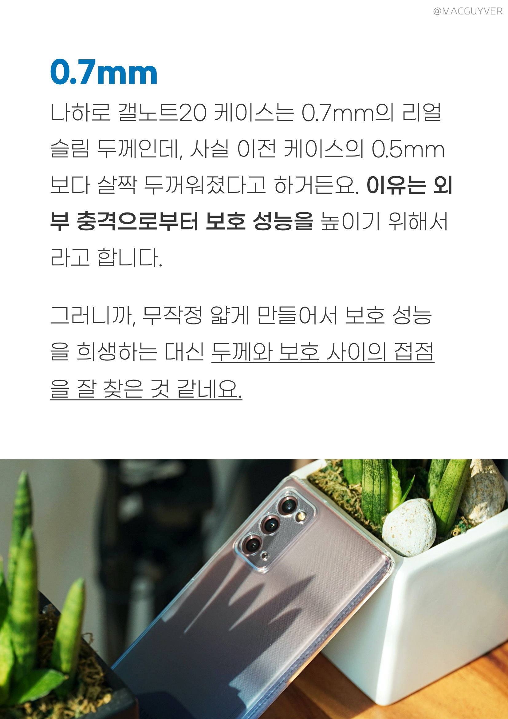 나하로 갤노트20 케이스는 0.7mm의 리얼슬림 두께인데, 사실 이전 케이스의 0.5mm보다 살짝 두꺼워졌다고 하거든요. 이유는 외부 충격으로부터 보호 성능을 높이기 위해서라고 합니다. 그러니까, 무작정 얇게 만들어서 보호 성능을 희생하는 대신 두께와 보호 사이의 접점을 잘 찾은 것 같네요. 갤럭시노트20 케이스 추천 실사용 소감 딱딱하게 걸리는 곳 없이 전체적으로 말랑말랑한 느낌이 좋았던 나하로 케이스는 유막 방지 도트가 후면부터 측면까지 거의 전체를 덮고 있었는데요. 그래서 나하로 케이스 측면도 일체감 있는 컬러를 보여주기도 하지만 때로는 약간 더 선명하게 보였으면 하는 생각도 들더라고요. 참고로 갤노트20 케이스 무게는 직접 재었을 때 22g과 23g 정도로 정말 가벼워서 부담을 줄여주기도 했습니다. 갤노트 케이스 TMI : 하지만 원래 무거운 갤노트20이라 체감 무게는 어쩔 수 없이 높아집니다.