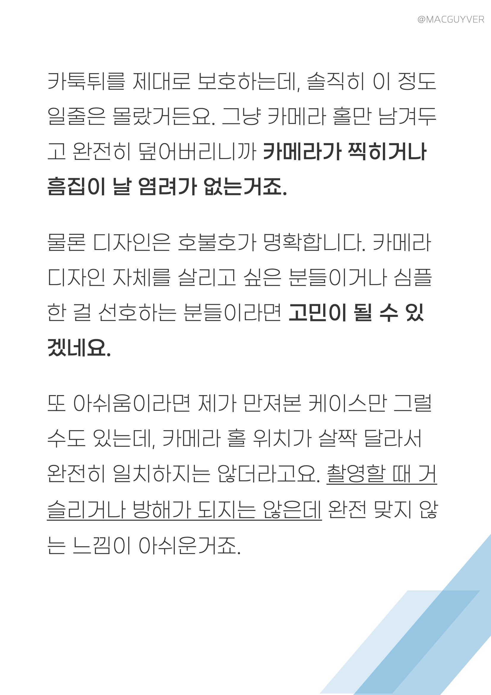 갤럭시노트20 케이스 탈착은 정말 쉬워요. 어느 모서리부터 탈착을 하든 불편하지 않게 바로 탈착이 되니까 편하게 바로 씌우고 벗길 수 있더라고요. 하지만 먼지가 들어가면 지저분해 보이기 때문에 기본 제공되는 도구들이나 붓으로 먼지를 털어주는게 좋습니다. 갤럭시노트20 그라데이션 케이스 탈착은 쉬운 반면, 사용했을 때 측면이 제법 쉽게 들뜨더라고요. 부들부들하게 만들고 탈착을 쉽게 하려다 그렇게 된 것 같은데, 먼지가 들어갈 수 있으니까 자주 털어줄 필요가 있어 보입니다. 갤럭시노트20 울트라 케이스 TMI : 하단부는 단자 홀까지 있어서 조금 더 쉽게 벌어지는 느낌입니다. 하지만 일부러 늘리지 않으면 그냥 늘어나지는 않네요. 갤노트20 울트라 케이스 카툭튀를 제대로 보호하는데, 솔직히 이 정도일줄은 몰랐거든요. 그냥 카메라 홀만 남겨두고 완전히 덮어버리니까 카메라가 찍히거나 흠집이 날 염려가 없는거죠. 갤노트 케이스 물론 디자인은 호불호가 명확합니다. 카메라 디자인 자체를 살리고 싶은 분들이거나 심플한 걸 선호하는 분들이라면 고민이 될 수 있겠네요. 갤노트20 케이스 또 아쉬움이라면 제가 만져본 케이스만 그럴수도 있는데, 카메라 홀 위치가 살짝 달라서 완전히 일치하지는 않더라고요. 갤럭시노트20 케이스 추천 촬영할 때 거슬리거나 방해가 되지는 않은데 완전 맞지 않는 느낌이 아쉬운거죠.