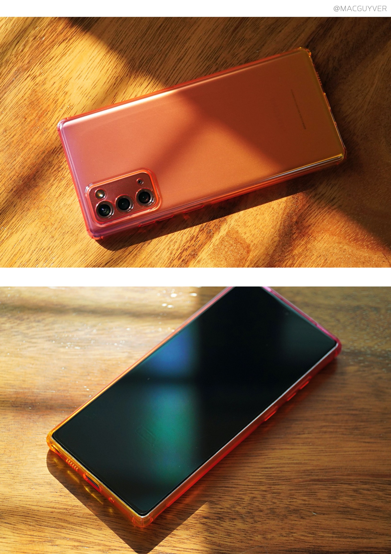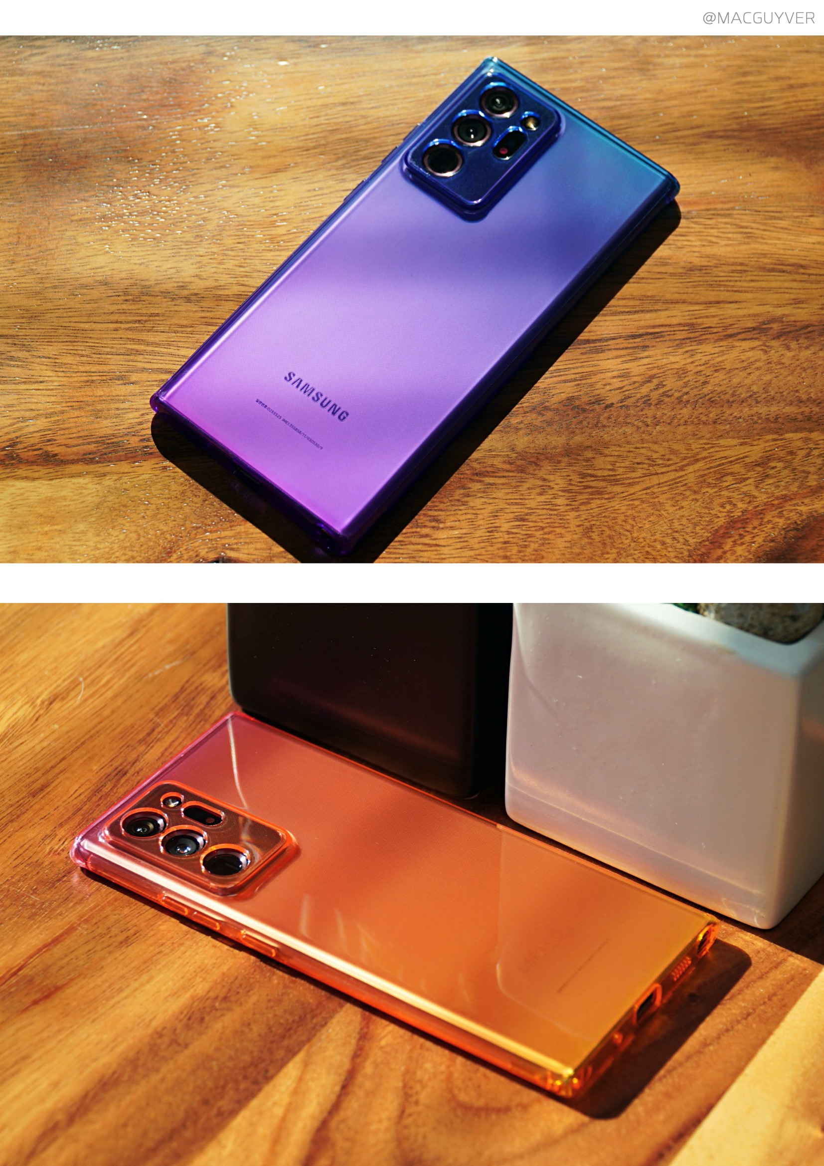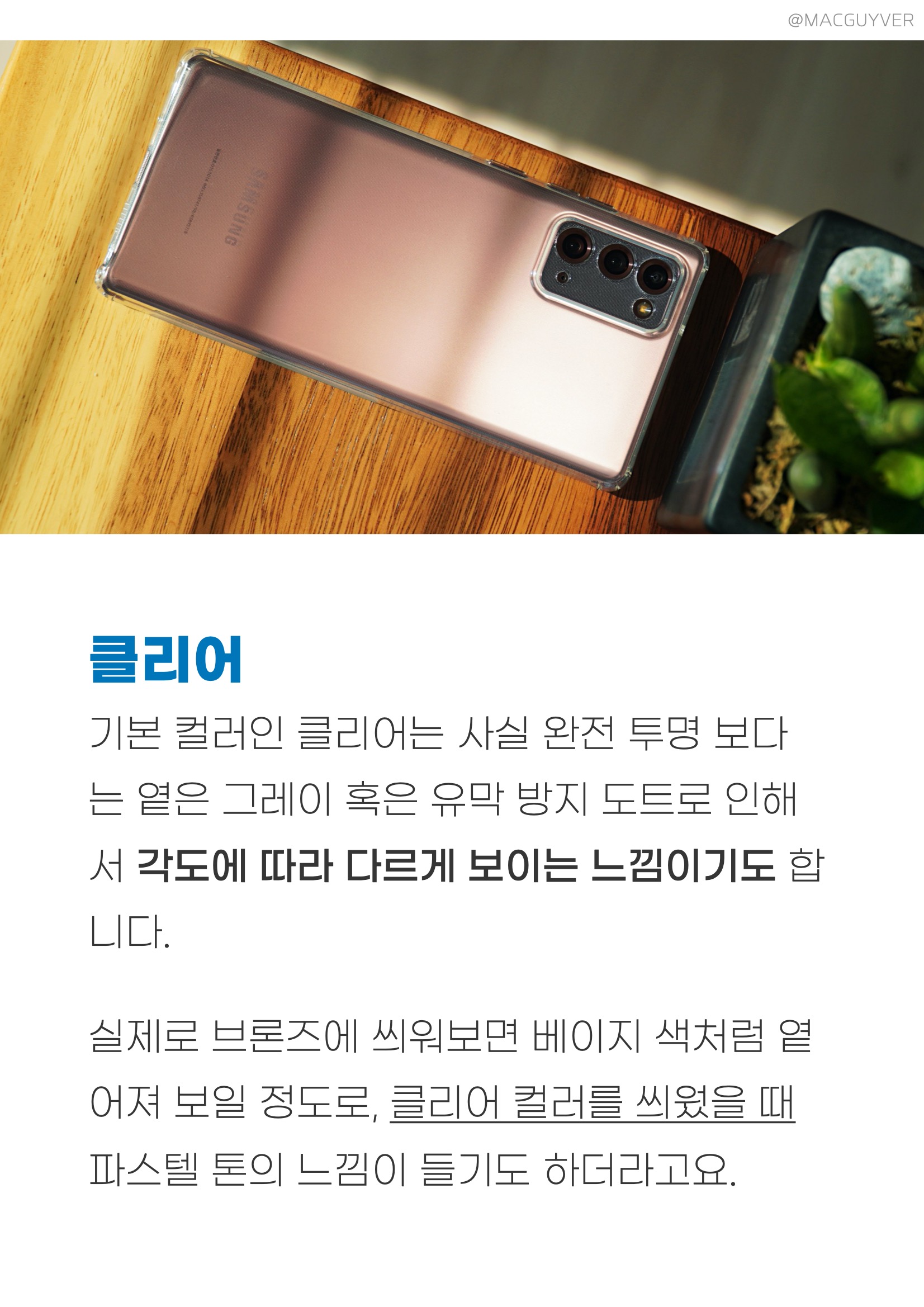 나하로 케이스 화이트핑크 & 화이트퍼플 여성분들에게 사랑받을 것 같은 화이트핑크와 화이프퍼플은 마찬가지로 은은하면서도 브론즈와 더 잘 어울리는 느낌을 전해줬는데요. 나하로 케이스 화이트핑크를 씌우니까 브론즈가 갑자기 핑크 컬러가 된 느낌이라 더욱 은은하고 깔끔한 인상을 주더라고요. 갤노트20 울트라 케이스 물론 화이트퍼플은 때때로 언밸런스한 느낌이 들기도 하고 어색하기도 했는데, 이 컬러 조합도 누군가에게는 최애템이 되지 않을까 합니다. 2가지 컬러의 장점이라면 브론즈나 화이트 컬러, 블랙 컬러 모두 자연스럽게 어우러진다는 점인데요. 확실히 여성분들이라면 고민해도 좋을 것 같네요. 갤럭시노트20 케이스 추천 클리어 & 0.7mm 기본 컬러인 클리어는 사실 완전 투명 보다는 옅은 그레이 혹은 유막 방지 도트로 인해서 각도에 따라 다르게 보이는 느낌이기도 합니다. 실제로 갤럭시노트20 케이스브론즈에 씌워보면 베이지 색처럼 옅어져 보일 정도로, 클리어 컬러를 씌웠을 때 파스텔 톤의 느낌이 들기도 하더라고요.