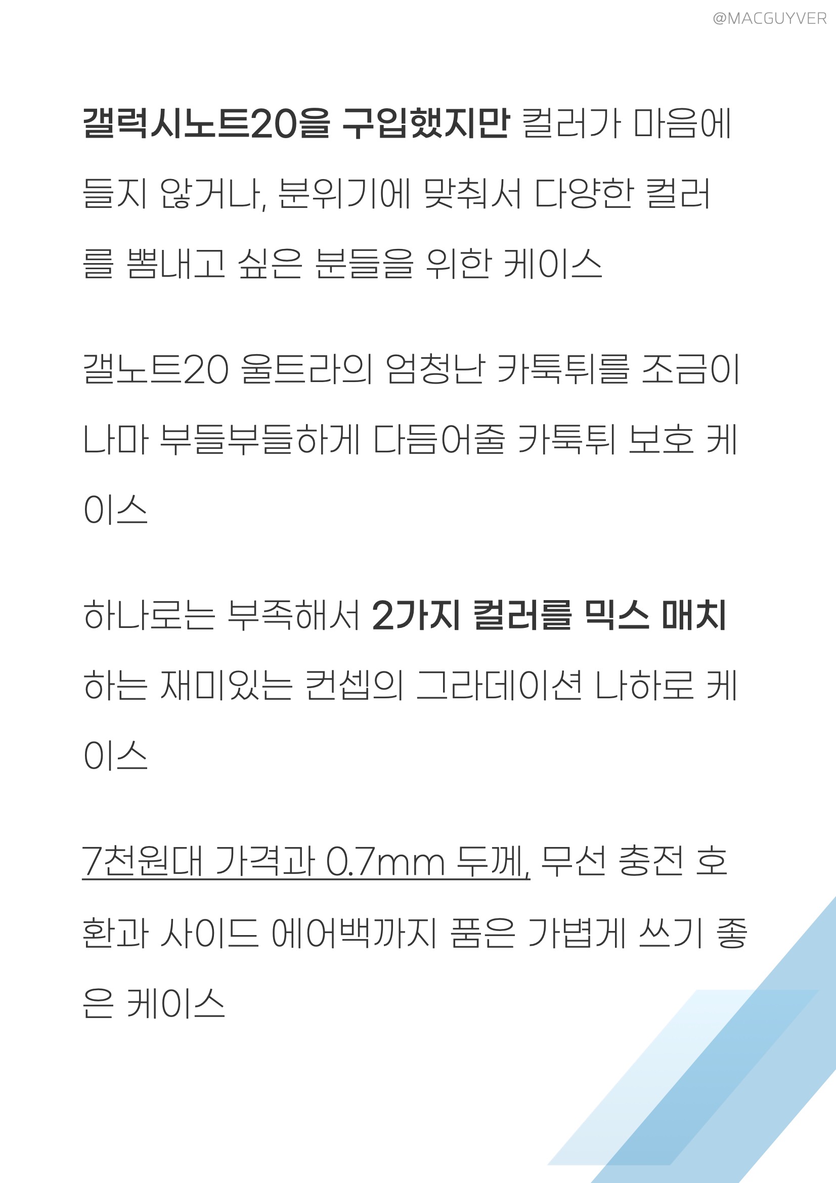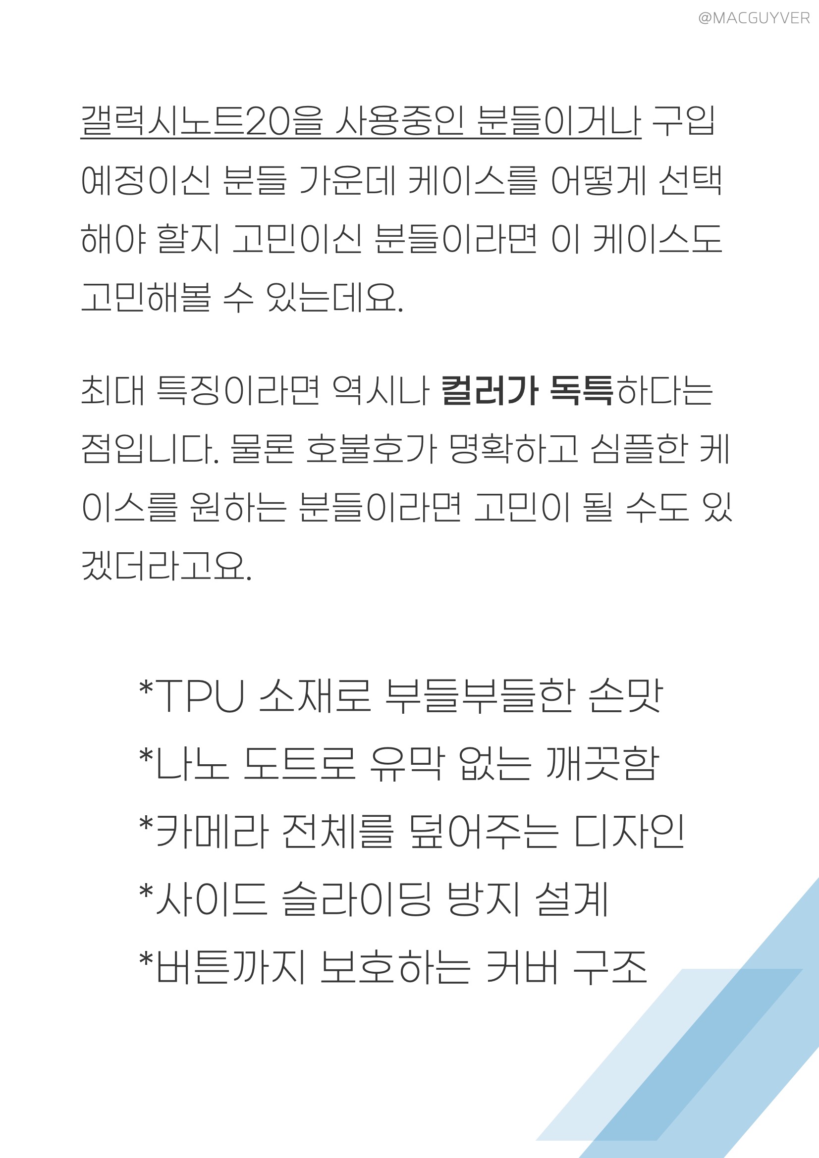 갤럭시노트20 케이스 추천 갤럭시노트20 케이스 유막 방지는 측면까지 정말 잘 되니까 깔끔한데, 갤럭시노트20 그라데이션 케이스 사용하다 보면 손에 있는 유분이 묻어서 외부에는 자국이 남기도 하거든요. 이럴때는 전용 구성품이나 융으로 닦아줄 필요가 있습니다. 갤럭시노트20 울트라 케이스 버튼감은 약간의 저항이 더해져서 조금은 힘이 필요합니다. 뚫린 것보다 보호는 잘 되고, 만졌을 때 거슬리지 않게 일체감은 있지만 버튼감이 아쉽네요. 그냥 사용할때는 몰랐는데, 나하로 케이스 어깨뽕이 있어요. 특히 갤노트20 울트라는 각진 어깨뽕이라 디자인을 해치지도 않고 자연스럽게 매치되더라고요. 갤노트20 케이스 이 정도로 보호가 될까 싶지만, 내부에 아주 조금이라도 공간이 있고 공기 방울이 있으니까 확실히 없는 것보다는 에어백 역할을 기대하게 해줬습니다. 나하로 갤노트20 케이스는 기본 클리어 모델부터 6가지의 서로 다른 컬러감의 모델이 있으니까 선택지가 정말 넓었는데요. 이외에도 케이스로서 기본기가 나쁘지 않아서 독특한 느낌을 원하는 분들이라면 나하로 케이스 고민해보시는 것도 좋을 것 같네요. 갤노트 케이스 추천 사용자 카툭튀를 조금이라도 덮어두고 싶은 분들 슬림하면서 보호 성능까지 원하시는 분들 다양한 컬러감의 디자인을 찾으셨던 분들 카메라 보호를 진짜 제대로 하고싶은 분들