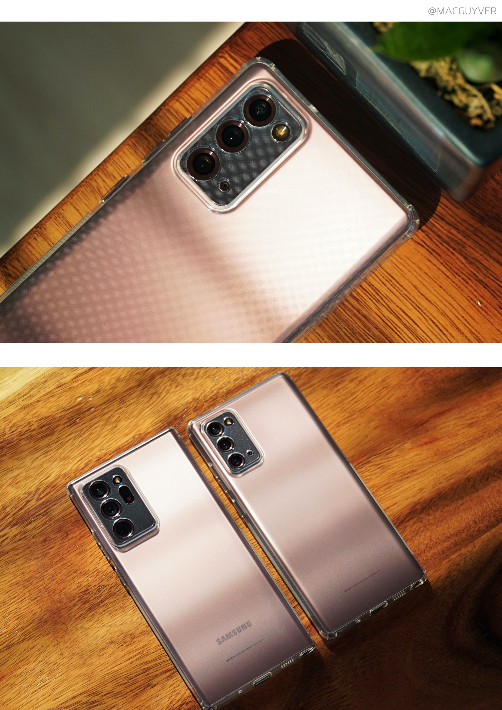 나하로 케이스 화이트핑크 & 화이트퍼플 여성분들에게 사랑받을 것 같은 화이트핑크와 화이프퍼플은 마찬가지로 은은하면서도 브론즈와 더 잘 어울리는 느낌을 전해줬는데요. 나하로 케이스 화이트핑크를 씌우니까 브론즈가 갑자기 핑크 컬러가 된 느낌이라 더욱 은은하고 깔끔한 인상을 주더라고요. 갤노트20 울트라 케이스 물론 화이트퍼플은 때때로 언밸런스한 느낌이 들기도 하고 어색하기도 했는데, 이 컬러 조합도 누군가에게는 최애템이 되지 않을까 합니다. 2가지 컬러의 장점이라면 브론즈나 화이트 컬러, 블랙 컬러 모두 자연스럽게 어우러진다는 점인데요. 확실히 여성분들이라면 고민해도 좋을 것 같네요. 갤럭시노트20 케이스 추천 클리어 & 0.7mm 기본 컬러인 클리어는 사실 완전 투명 보다는 옅은 그레이 혹은 유막 방지 도트로 인해서 각도에 따라 다르게 보이는 느낌이기도 합니다. 실제로 갤럭시노트20 케이스브론즈에 씌워보면 베이지 색처럼 옅어져 보일 정도로, 클리어 컬러를 씌웠을 때 파스텔 톤의 느낌이 들기도 하더라고요.