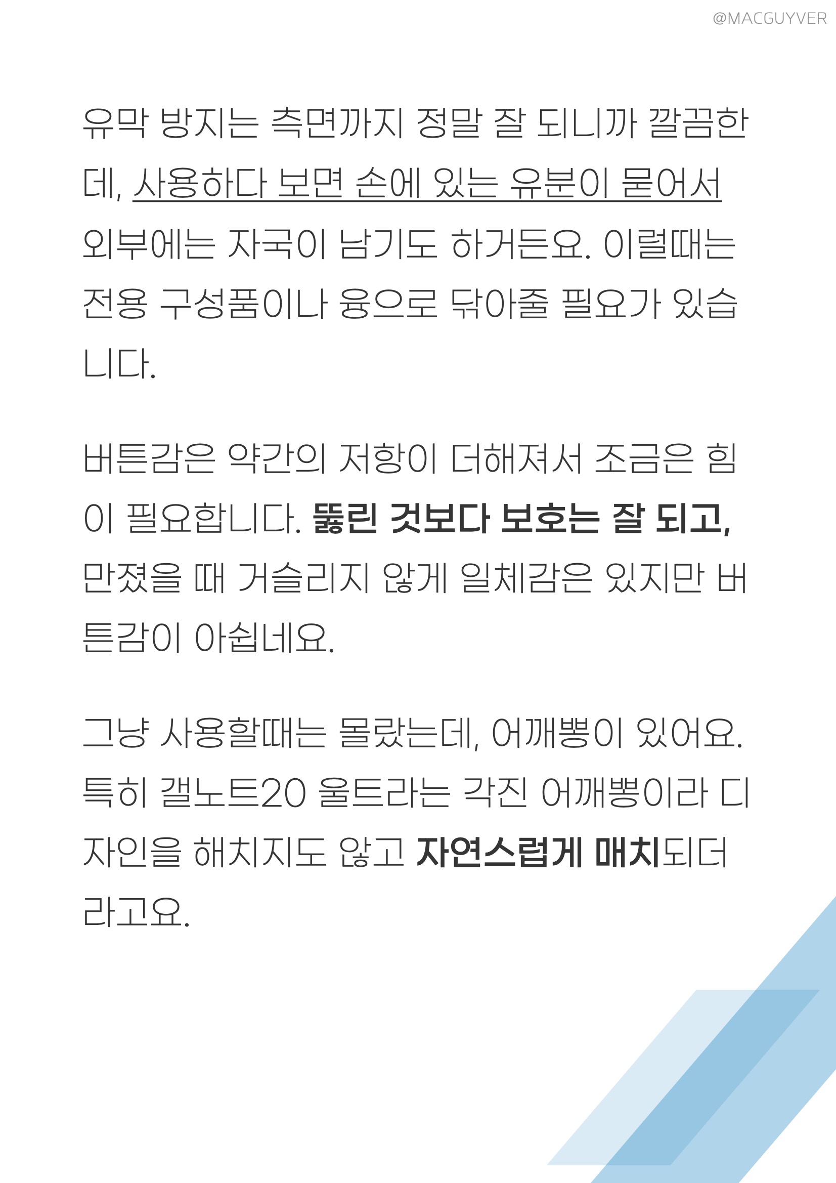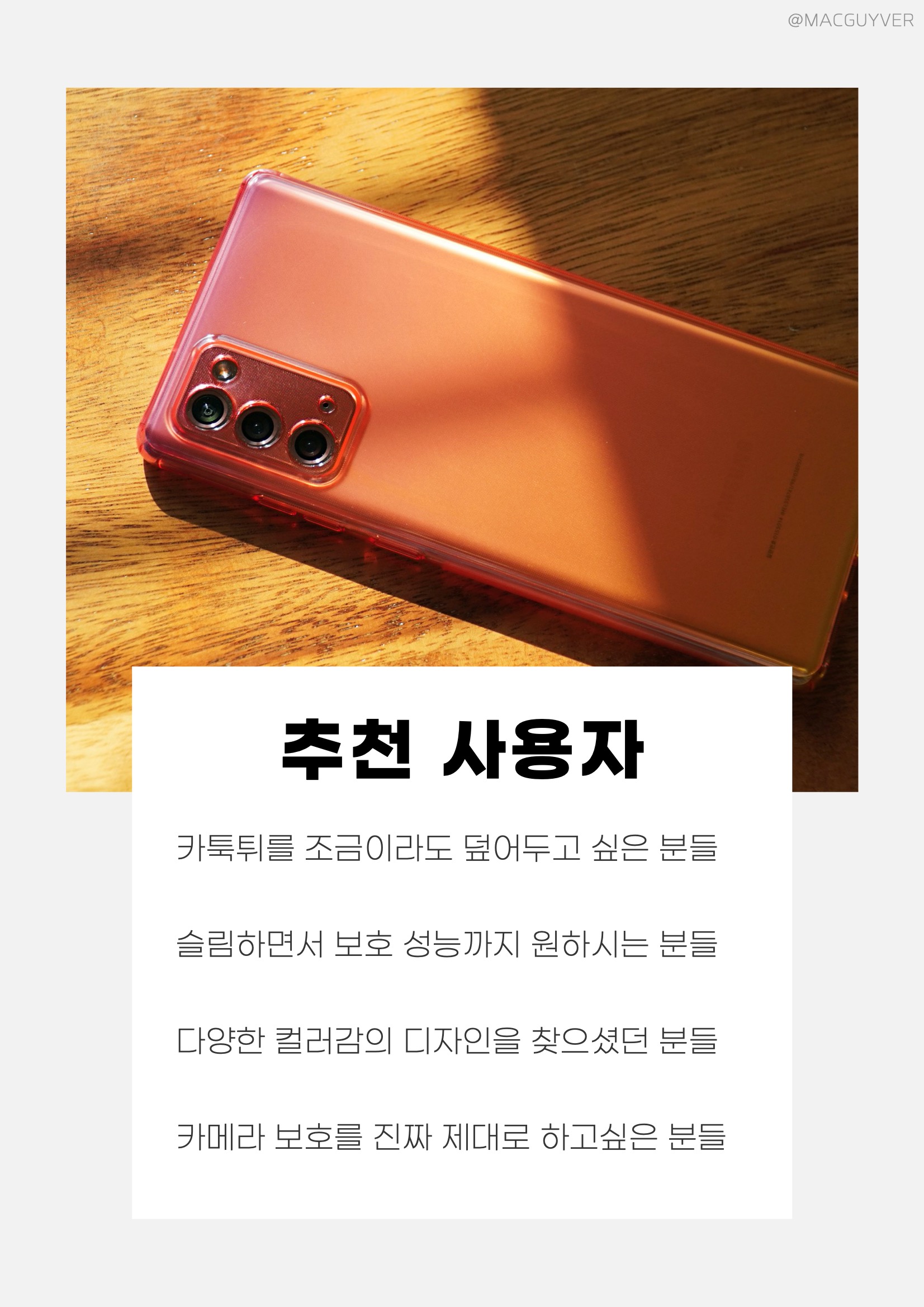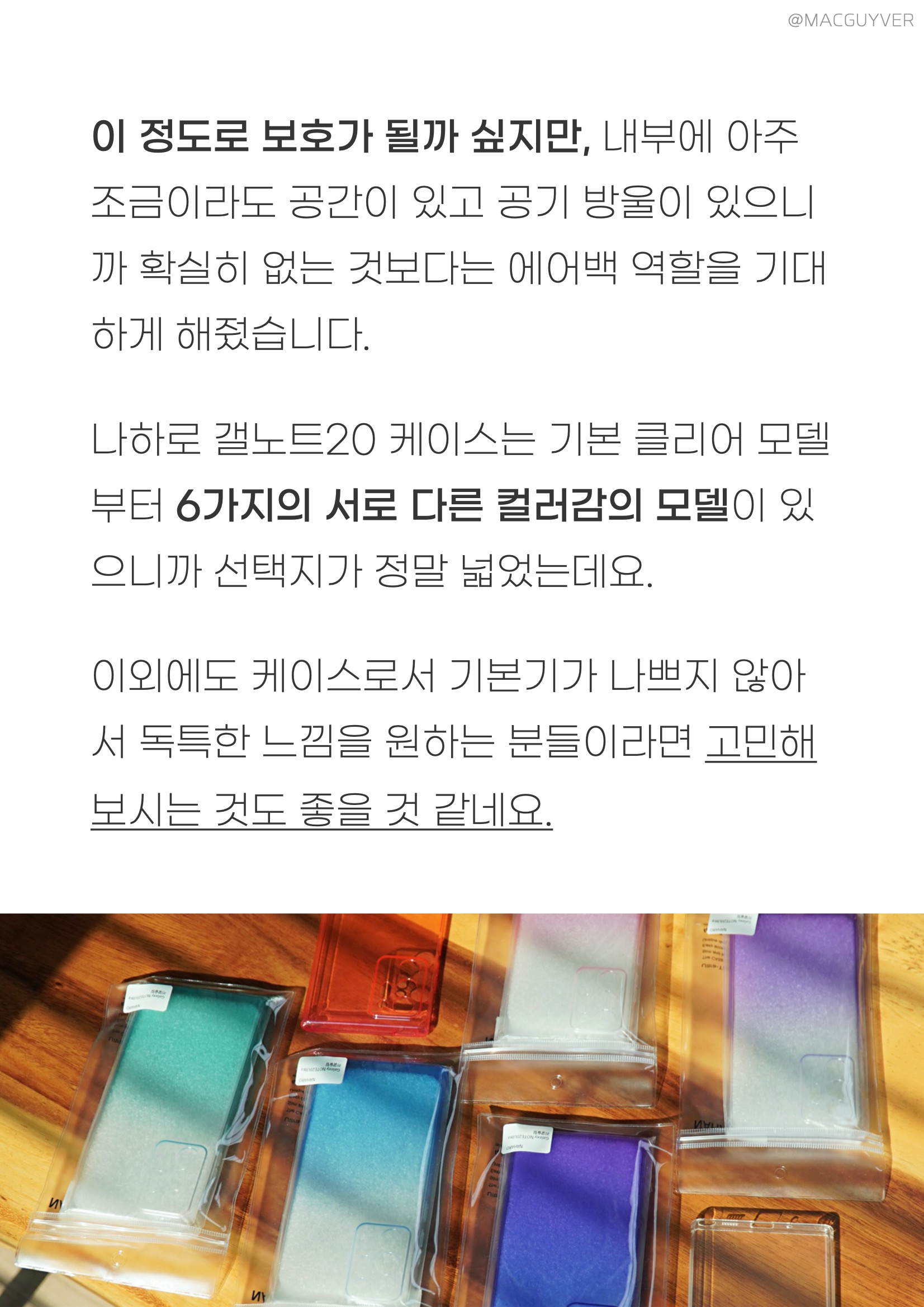 갤럭시노트20 케이스 추천 갤럭시노트20 케이스 유막 방지는 측면까지 정말 잘 되니까 깔끔한데, 갤럭시노트20 그라데이션 케이스 사용하다 보면 손에 있는 유분이 묻어서 외부에는 자국이 남기도 하거든요. 이럴때는 전용 구성품이나 융으로 닦아줄 필요가 있습니다. 갤럭시노트20 울트라 케이스 버튼감은 약간의 저항이 더해져서 조금은 힘이 필요합니다. 뚫린 것보다 보호는 잘 되고, 만졌을 때 거슬리지 않게 일체감은 있지만 버튼감이 아쉽네요. 그냥 사용할때는 몰랐는데, 나하로 케이스 어깨뽕이 있어요. 특히 갤노트20 울트라는 각진 어깨뽕이라 디자인을 해치지도 않고 자연스럽게 매치되더라고요. 갤노트20 케이스 이 정도로 보호가 될까 싶지만, 내부에 아주 조금이라도 공간이 있고 공기 방울이 있으니까 확실히 없는 것보다는 에어백 역할을 기대하게 해줬습니다. 나하로 갤노트20 케이스는 기본 클리어 모델부터 6가지의 서로 다른 컬러감의 모델이 있으니까 선택지가 정말 넓었는데요. 이외에도 케이스로서 기본기가 나쁘지 않아서 독특한 느낌을 원하는 분들이라면 나하로 케이스 고민해보시는 것도 좋을 것 같네요. 갤노트 케이스 추천 사용자 카툭튀를 조금이라도 덮어두고 싶은 분들 슬림하면서 보호 성능까지 원하시는 분들 다양한 컬러감의 디자인을 찾으셨던 분들 카메라 보호를 진짜 제대로 하고싶은 분들