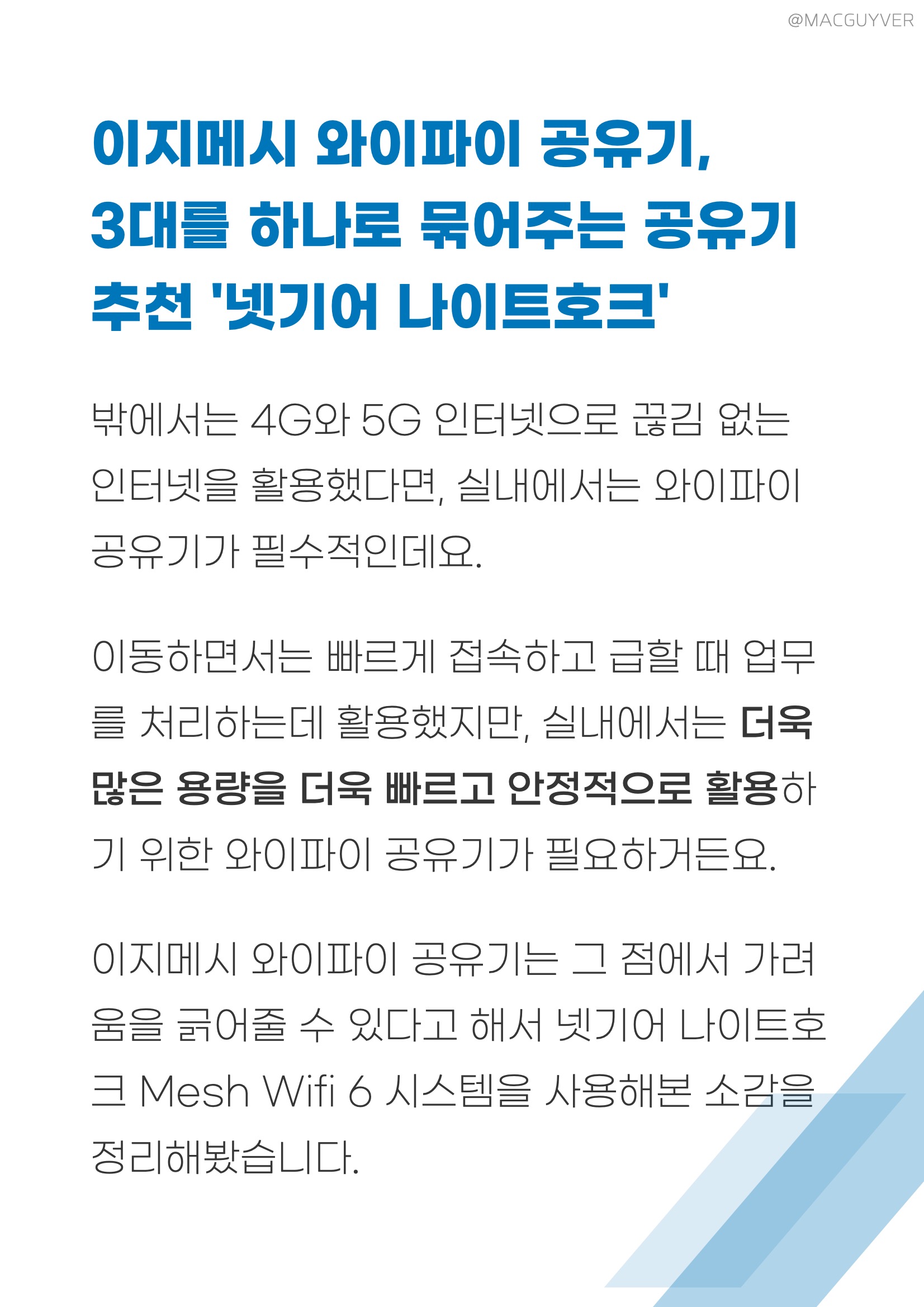 밖에서는 4G와 5G 인터넷으로 끊김 없는 인터넷을 활용했다면, 실내에서는 와이파이 공유기가 필수적인데요. 와이파이 공유기 넷기어 공유기 이동하면서는 빠르게 접속하고 급할 때 업무를 처리하는데 활용했지만, 실내에서는 더욱 많은 용량을 더욱 빠르고 안정적으로 활용하기 위한 와이파이 공유기가 필요하기 때문입니다. 넷기어 나이트호크 이지메이 와이파이 공유기는 그 점에서 가려움을 긁어줄 수 있다고 해서 넷기어 나이트호크 Mesh Wifi 6 시스템을 사용해본 소감을 정리해봤습니다.