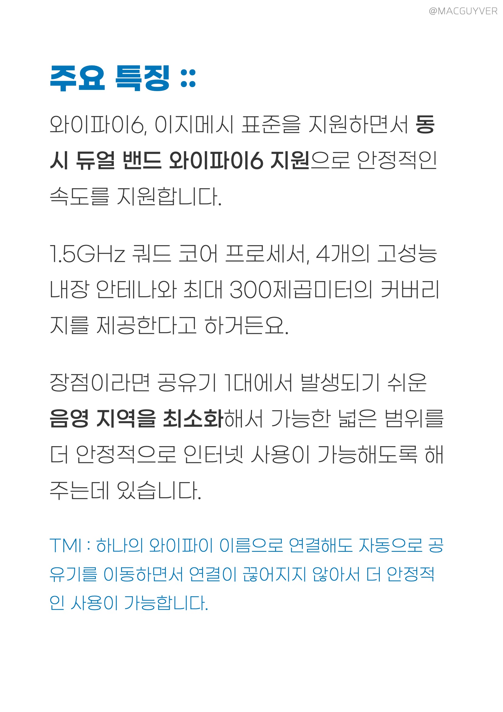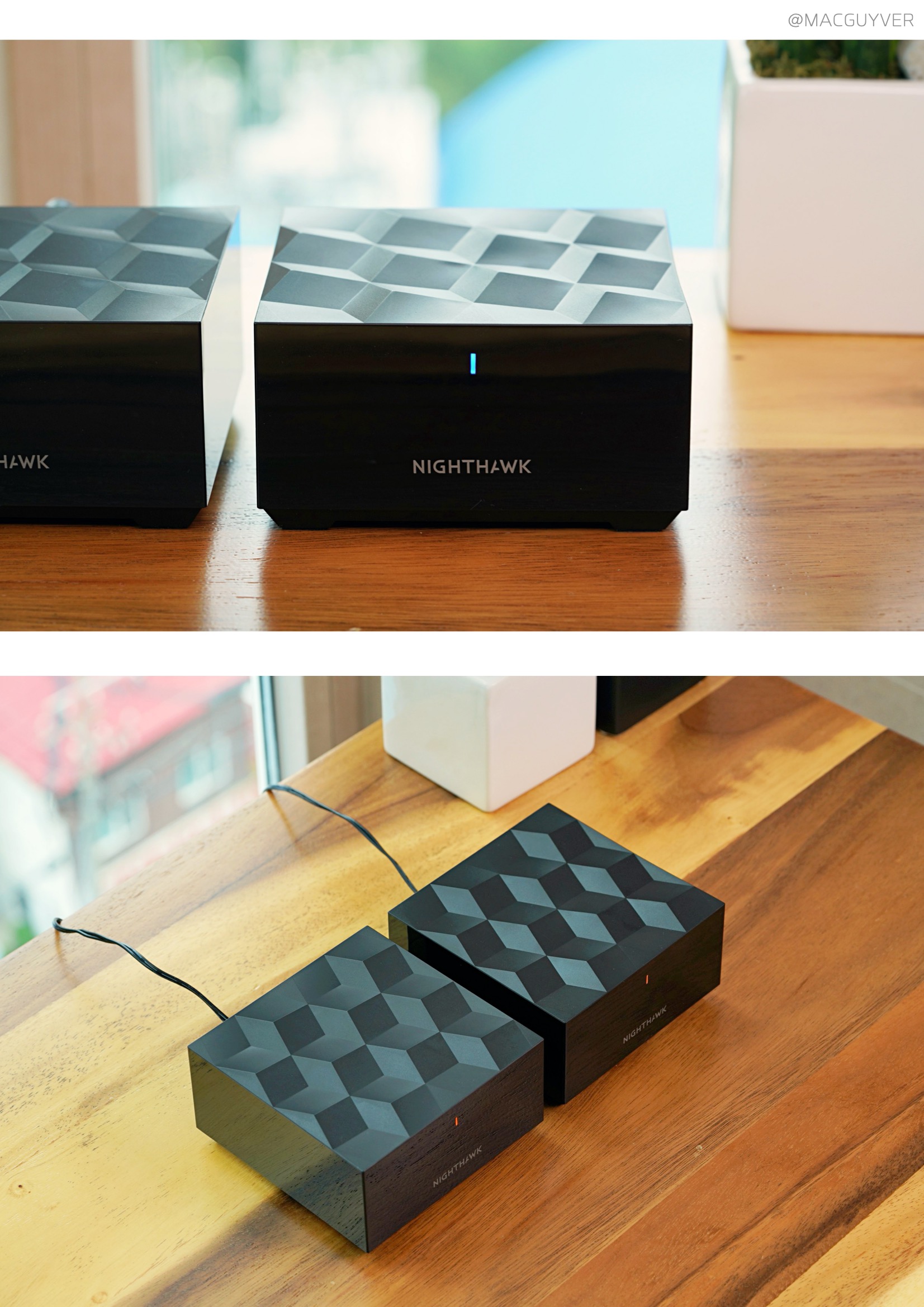 이지메시 와이파이 공유기 주요 특징 :: 와이파이6, 이지메시 표준을 지원하면서 동시 듀얼 밴드 와피아피6 지원으로 안정적인 속도를 지원합니다. 넷기어 공유기 1.5GHz 쿼드 코어 프로세서, 4개의 고성능 내장 안테나와 최대 300제곱미터의 커버리지를 제공한다고 하거든요. 넷기어 나이트호크 장점이라면 공유기 1대에서 발생되기 쉬운 음영 지역을 최소화해서 가능한 넓은 범위를 더 안정적으로 인터넷 사용이 가능해도록 해주는 데 있습니다. 이지메시 와이파이 공유기 TMI : 하나의 와이파이 이름으로 연결해도 자동으로 공유기를 이동하면서 연결이 끊어지지 않아서 더 안정적인 사용이 가능합니다. 메시 와이파이 공유기 디자인 :: 얼핏 보기에는 와이파이 공유기로 보이기보다는 NAS 혹은 별도의 스마트기기처럼 보이는 디자인으로 상단부에는 홀이 있지만 디자인으로 조금은 독창적인 느낌을 전달해 줬습니다. 넷기어 공유기 측면을 두르는 재질이 흠집에 약하다는 아쉬움이나 먼지가 잘 묻는 재질이라는 점도 때로는 아쉬움으로 다가왔는데요. 메시 공유기 추천 무선 공유기 전면 상단부에 LED를 통한 알림까지 해주는 점에서 현재 상태를 확인하기 쉬웠습니다. 와이파이 공유기 MK62 모델은 2대 구성으로, MK63 모델은 3대 구성으로 되어서 최대 3곳에 놓아둘 수 있거든요. 이지메시 와이파이 공유기 공간 차지가 많지 않고, 안테나가 4개나 있지만 안쪽으로 넣어둬서 지저분해 보이지 않는 점은 장점이 아닐까 합니다.