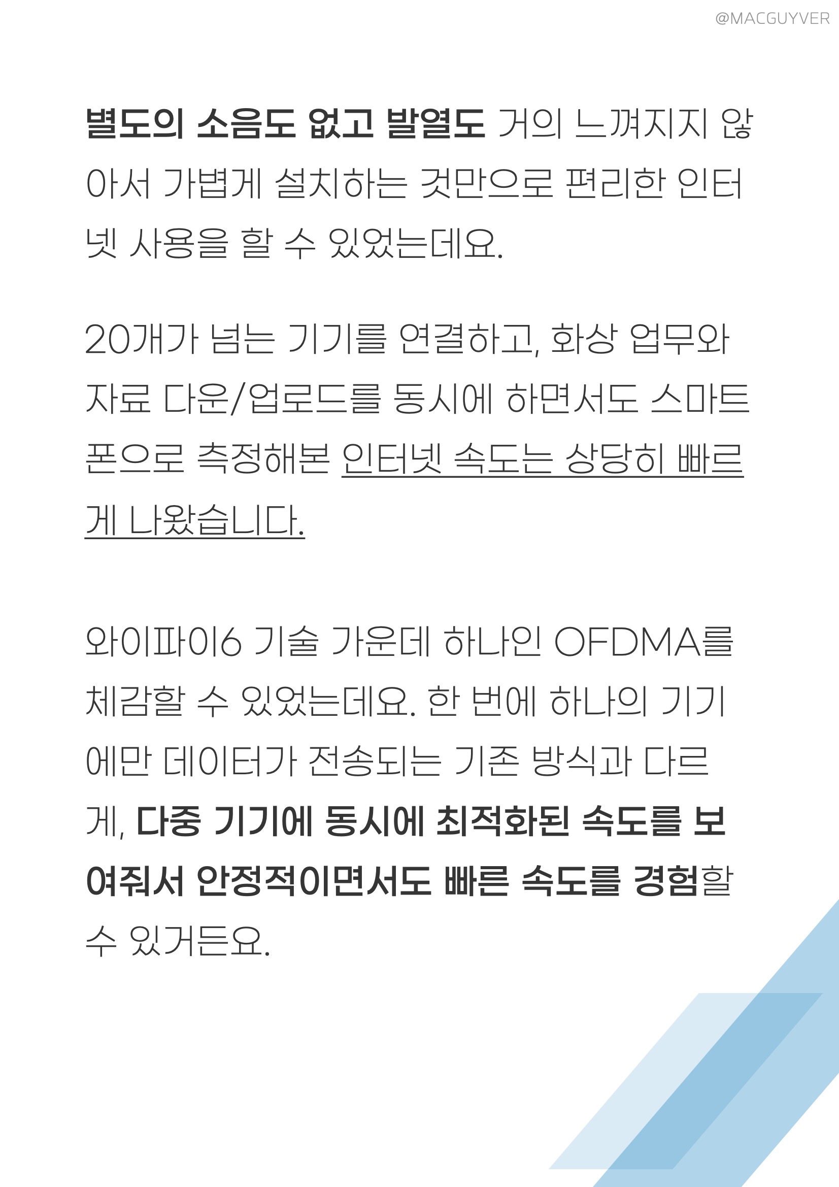 와이파이 공유기 실사용 :: 직접 사용해본 소감이라면, 확실히 와이파이 음영 지역에 대한 고민이 줄어들었습니다. 거실에 하나, 방에 하나, 주방에 하나 놓아두니까 서로 엮이면서 촘촘한 와이파이를 제공해 줬거든요. 무선 공유기 특히 2.4Ghz와 5Ghz를 별도로 연결하는 방식이 아니라, 인터넷 공유기 하나의 인터넷 신호를 잡기만 하면 알아서 거리에 따라 2.4Ghz로 연결해 주거나, 혹은 더 빠른 5Ghz로 변경해 주니까 넷기어 나이트호크 안정성과 편의성이 둘 다 장점이 되더라고요. 별도의 소음도 없고 발열도 거의 느껴지지 않아서 무선 공유기 가볍게 설치하는 것만으로 편리한 인터넷 사용을 할 수 있었는데요. 이지메시 와이파이 공유기 넷기어 나이트호크 20개가 넘는 기기를 연결하고, 화상 업무와 자료 다운/업로드를 동시에 하면서도 스마트폰으로 측정해본 인터넷 속도는 상당히 빠르게 나왔습니다. 메시 와이파이 공유기 와이파이6 기술 가운데 하나인 OFDMA를 체감할 수 있었는데요. 한 번에 하나의 기기에만 데이터가 전송되는 기존 방식과 다르게, 메시 공유기 추천 다중 기기에 동시에 최적화된 속도를 보여줘서 넷기어 공유기 안정적이면서도 빠른 속도를 경험할 수 있거든요.