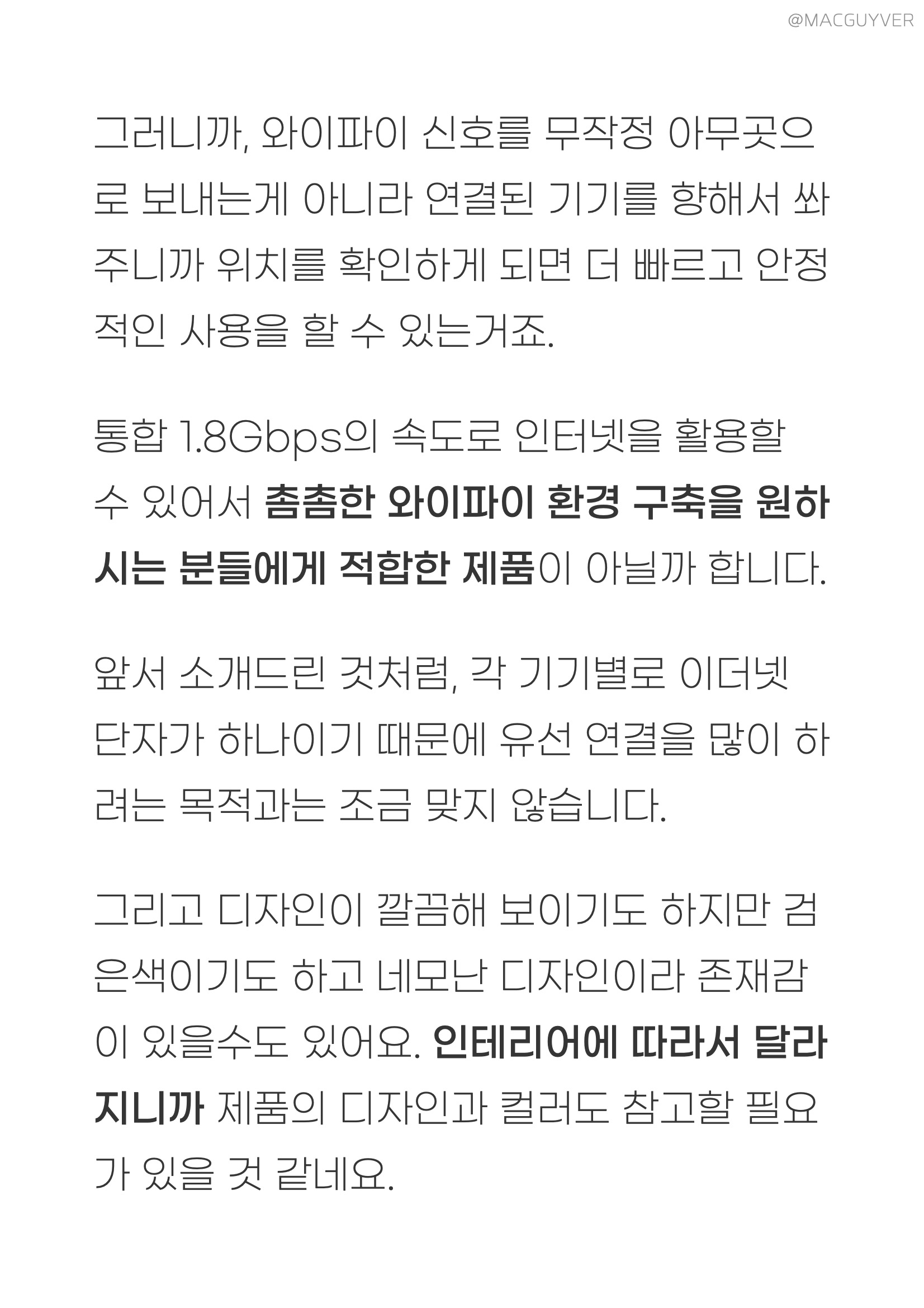 사실,와이파이 공유기 넷기어 나이트호크 이지메시 와이파이 공유기를 사용하면서 존재감을 거의 느끼지 못해서 메시 공유기 추천 실사용 소감은 '느껴지지 않는다’라고 말하는 게 맞지 않을까 합니다. 이지메시 와이파이 공유기 인터넷이 끊기거나, 속도가 떨어지거나, 안정적이지 않거나, 연결 가능한 기기가 많지 않거나 하는 등의 문제가 없으니까 그냥 유선 연결처럼 인터넷을 계속 사용할 수 있었습니다. 이지메시 와이파이 공유기 사용하면서 체감되는 순간이라면, 빔포밍+ 기술로 이동할 때 인터넷 속도가 다소 떨어지는 것 같다가도 빠르게 최고 속도로 빨라지더라고요. 그러니까, 와이파이 신호를 무작정 아무 곳으로 보내는 게 아니라 연결된 기기를 향해서 쏴주니까 위치를 확인하게 되면 더 빠르고 안정적인 사용을 할 수 있는 거죠. 메시 와이파이 공유기 통합 1.8Gbps의 속도로 인터넷을 활용할 수 있기 때문에 촘촘한 와이파이 환경 구축을 원하시는 분들에게 적합한 제품이 아닐까 합니다. 앞서 소개 드린 것처럼, 각 기기별로 이더넷 단자가 하나이기 때문에 유선 연결을 많이 하려는 목적과는 조금 맞지 않습니다. 그리고 디자인이 깔끔해 보이기도 하지만 넷기어 나이트호크 검은색이기도 하고 네모난 디자인이라 존재감이 있을 수도 있어요. 인터넷 공유기 인테리어에 따라서 달라지니까 제품의 디자인과 컬러도 참고할 필요가 있을 것 같네요. 넷기어 나이트호크 추천 사용자 :: 넓은 공간에서 사용하려는 분들 카페나 사무실에서 쓰려는 분들 안정적이고 빠른 속도 찾는 분들 안테나 없는 디자인 원하는 분들