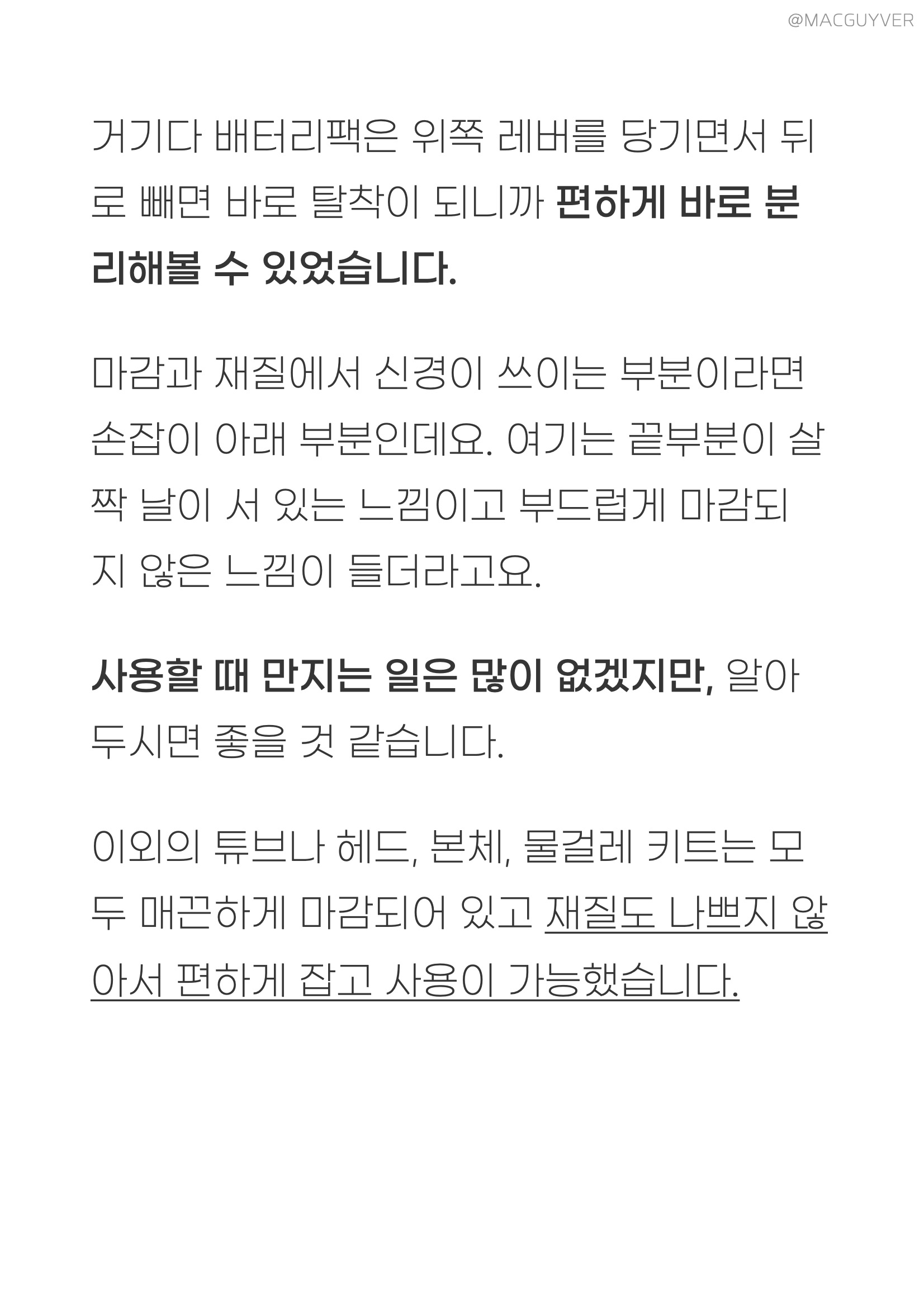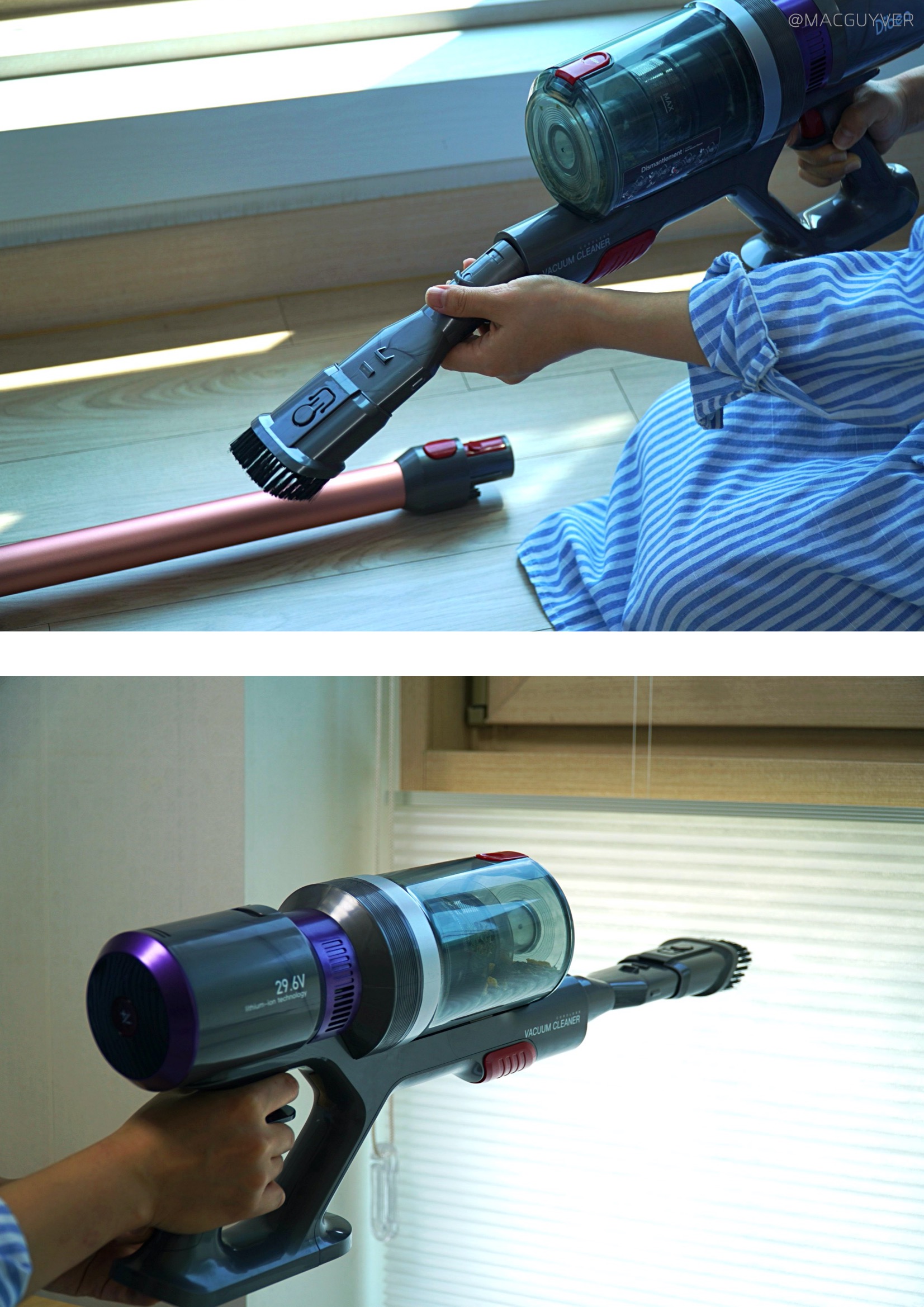 가성비청소기 #. 마감과 재질 의외로 청소기 후기에서 쉽게 보기 힘든 점 가운데는 마감과 재질이 있는데요. 사실 손이 닿는 제품이라면 마감이나 재질이 정말 중요해요. 그 점에서 디베아 차이슨 무선청소기는 손잡이 부분이 매끄럽고 걸리지 않아서 편리하더라고요. 거기다 각종 툴을 연결하고 탈착하는 부분에서도 스트레스가 없었거든요. 특히 인상적인 부분은 먼지통 분리에 있었습니다. 아래쪽 빨간 레버를 당겨서 열어준 다음에 돌려서 분리가 가능한데요. 확실히 제대로 분리가 되니까 편리하더라고요. 거기다 배터리팩은 위쪽 레버를 당기면서 뒤로 빼면 바로 탈착이 되니까 편하게 바로 분리해볼 수 있었습니다. 디베아무선청소기 마감과 재질에서 신경이 쓰이는 부분이라면 손잡이 아래 부분인데요. 여기는 끝부분이 살짝 날이 서 있는 느낌이고 부드럽게 마감되지 않은 느낌이 들더라고요. 사용할 때 만지는 일은 많이 없겠지만, 알아두시면 좋을 것 같습니다. 무선청소기추천 이외의 차이슨청소기 튜브나 헤드, 본체, 물걸레 키트는 모두 매끈하게 마감되어 있고 재질도 나쁘지 않아서 편하게 잡고 사용이 가능했습니다.