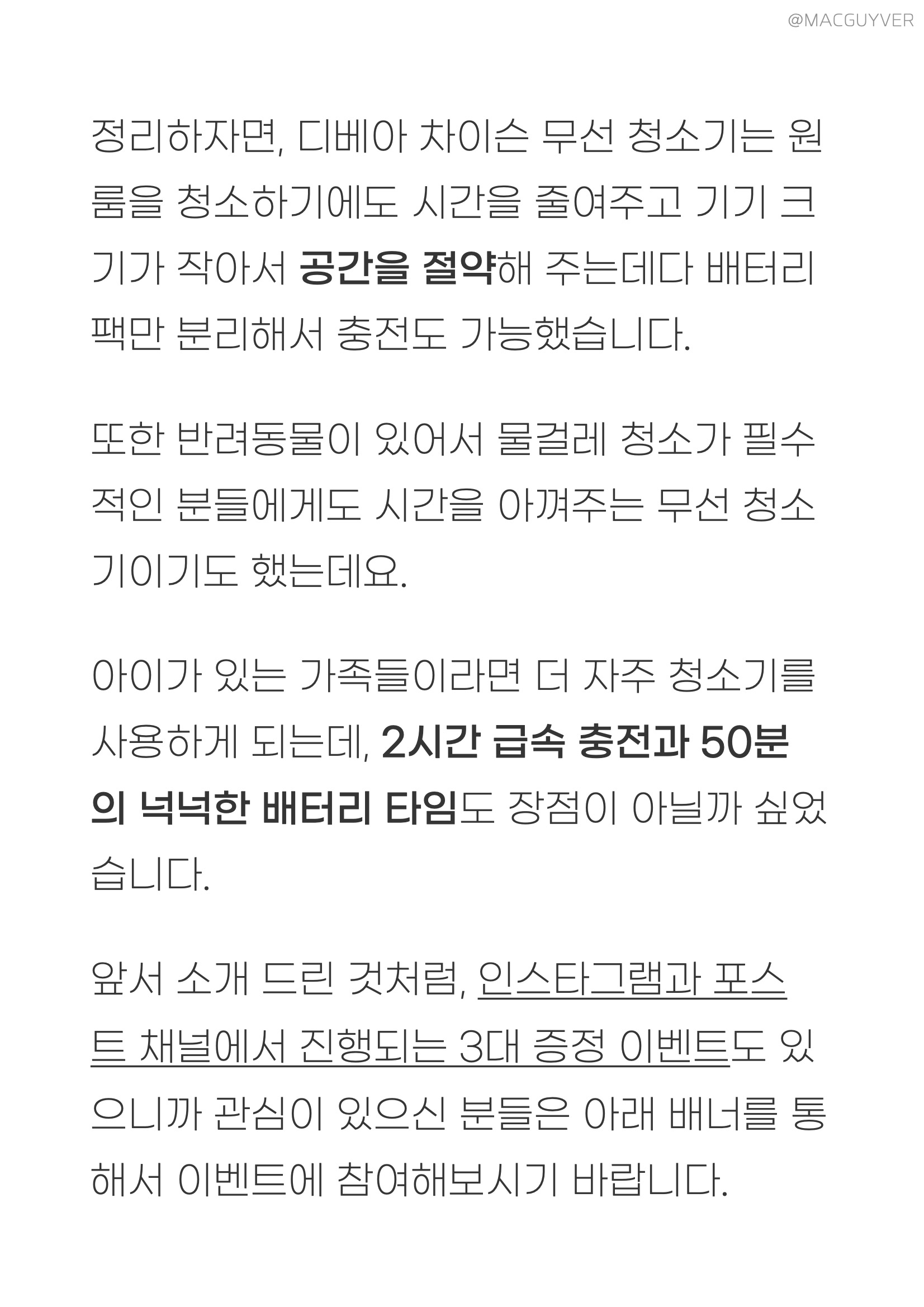 지난번 디베아무선청소기 리뷰에 이어서, 이번 리뷰에서는 보다 상세한 디베아 차이슨 무선청소기의 장단점을 정리해볼 예정입니다. 앞서 소개된 것처럼, 차이슨청소기 2시간 고속 충전부터 탈착 가능한 물걸레 키트, 다양한 브러시와 라이트 기능을 더한 헤드 램프, 배터리팩 분리 충전 등의 다양한 기능을 가지고 있는 무선청소기인데요. 또한 인스타그램과 포스트 채널에서 진행되는 디베아무선청소기 3대 증정 이벤트도 있으니까 관심이 있으신 분들은 아래 배너를 통해서 2in1청소기 이벤트에 참여해보실 수 있습니다. 무선청소기추천 싱글족이나 아이가 있는 가족들, 반려동물을 키우는 분들에게 꼭 알맞은 디베아 차이슨 무선청소기는 어떤 평가가 가능했을지 가성비청소기 두 번째 이야기를 시작해보겠습니다.