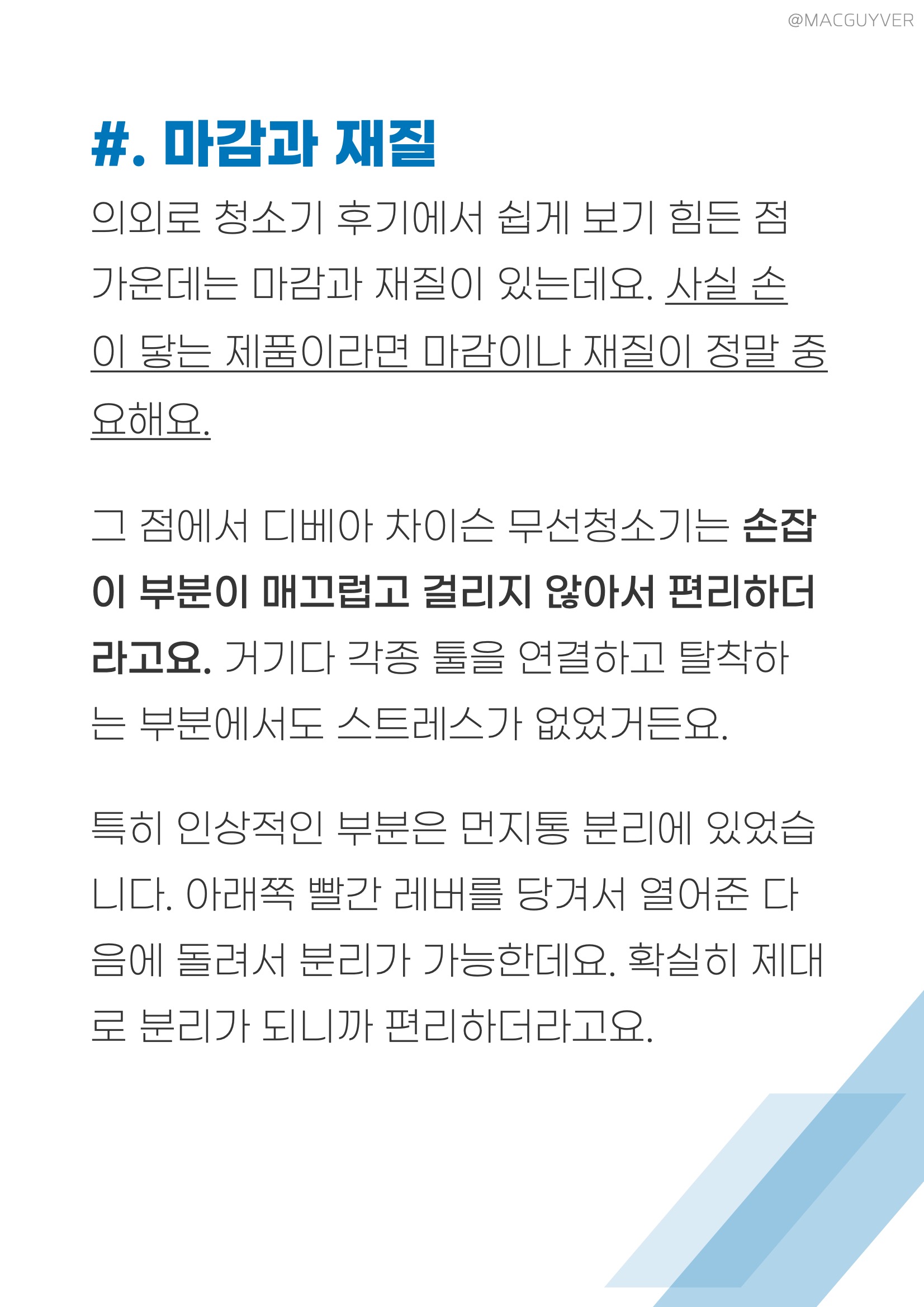 가성비청소기 #. 마감과 재질 의외로 청소기 후기에서 쉽게 보기 힘든 점 가운데는 마감과 재질이 있는데요. 사실 손이 닿는 제품이라면 마감이나 재질이 정말 중요해요. 그 점에서 디베아 차이슨 무선청소기는 손잡이 부분이 매끄럽고 걸리지 않아서 편리하더라고요. 거기다 각종 툴을 연결하고 탈착하는 부분에서도 스트레스가 없었거든요. 특히 인상적인 부분은 먼지통 분리에 있었습니다. 아래쪽 빨간 레버를 당겨서 열어준 다음에 돌려서 분리가 가능한데요. 확실히 제대로 분리가 되니까 편리하더라고요. 거기다 배터리팩은 위쪽 레버를 당기면서 뒤로 빼면 바로 탈착이 되니까 편하게 바로 분리해볼 수 있었습니다. 디베아무선청소기 마감과 재질에서 신경이 쓰이는 부분이라면 손잡이 아래 부분인데요. 여기는 끝부분이 살짝 날이 서 있는 느낌이고 부드럽게 마감되지 않은 느낌이 들더라고요. 사용할 때 만지는 일은 많이 없겠지만, 알아두시면 좋을 것 같습니다. 무선청소기추천 이외의 차이슨청소기 튜브나 헤드, 본체, 물걸레 키트는 모두 매끈하게 마감되어 있고 재질도 나쁘지 않아서 편하게 잡고 사용이 가능했습니다.