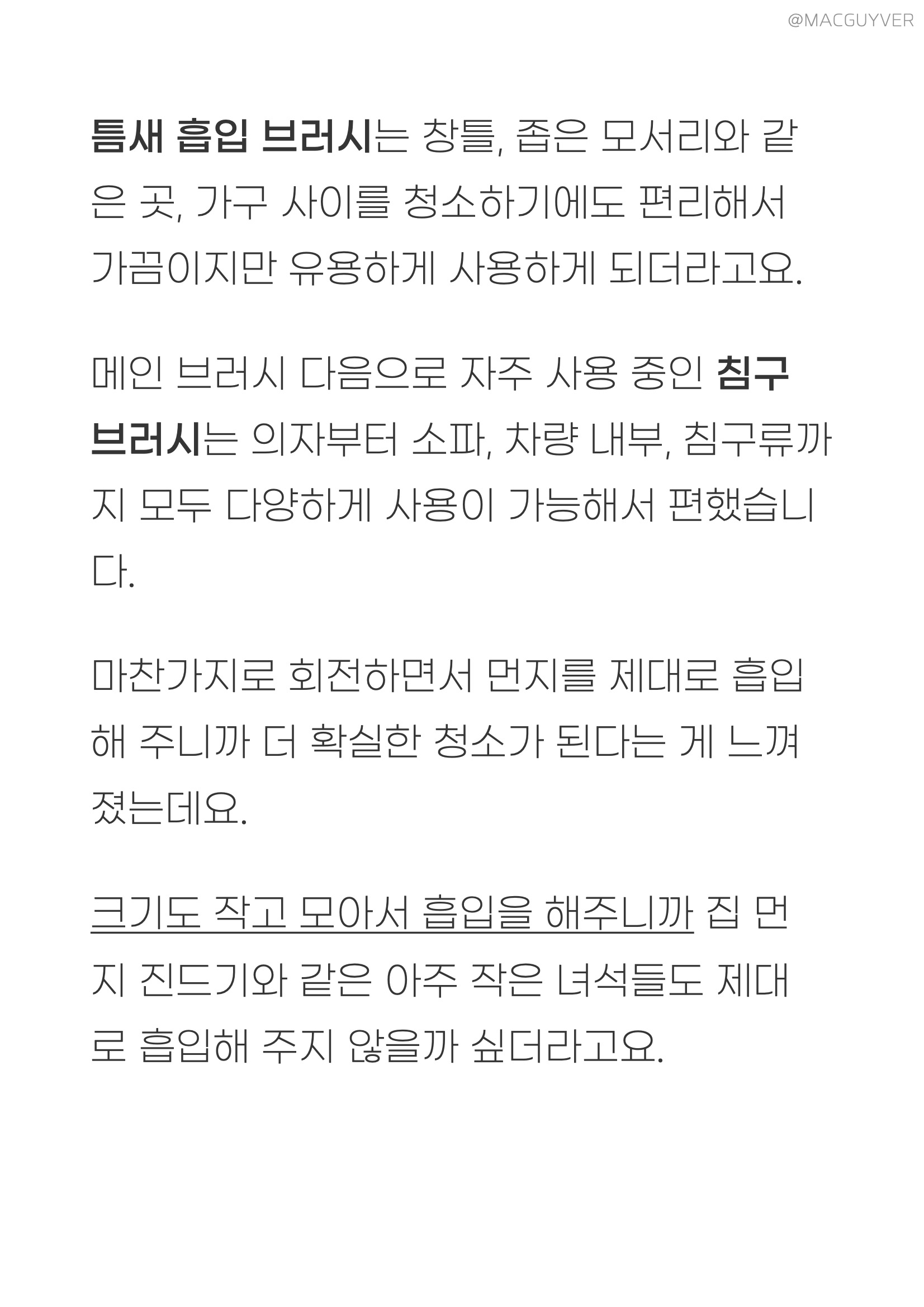 디베아무선청소기 멀티 브러시는 확실히 솔이 달려 있어서 블라인드를 비롯해서 평소에 먼지가 오래 쌓여있기 쉬운 곳을 쓸어주면서 청소하기에 알맞았는데요. 무선청소기추천 틈새 흡입 브러시는 창틀, 좁은 모서리와 같은 곳, 가구 사이를 청소하기에도 편리해서 가끔이지만 유용하게 사용하게 되더라고요. 원룸청소기 차이슨 청소기 메인 브러시 다음으로 자주 사용 중인 침구 브러시는 의자부터 소파, 차량 내부, 침구류까지 모두 다양하게 사용이 가능해서 편했습니다. 마찬가지로 차이슨청소기는 회전하면서 먼지를 제대로 흡입해 주니까 더 확실한 청소가 된다는 게 느껴졌는데요. 저렴한청소기 크기도 작고 모아서 흡입을 해주니까 집 먼지 진드기와 같은 아주 작은 녀석들도 제대로 흡입해 주지 않을까 싶더라고요. 디베아무선청소기 #. 디베아무선청소기 흡입력 & 소음 가장 중요한 흡입력은 부족함 없이 제대로 빨아들여서 만족스러웠습니다. 실험을 위해서 정말 많은 가루들(?)을 바닥에 흩어놓은 다음에 사용해봤거든요. 결과는 기대 이상으로 좋았습니다. 우선, 지나간 자리에 남은 게 없는 데다 뒤로 이동해도 다른 제품 대비 많이 흡입을 해주더라고요. 또 흡입력이 약한 청소기는 들어 올리면 가루나 알갱이가 많이 떨어지기도 하는데, 이 제품은 그런 증상 없이 깔끔하게 기기만 들려서 확실히 흡입력이 좋다는 것을 체감할 수 있었거든요.