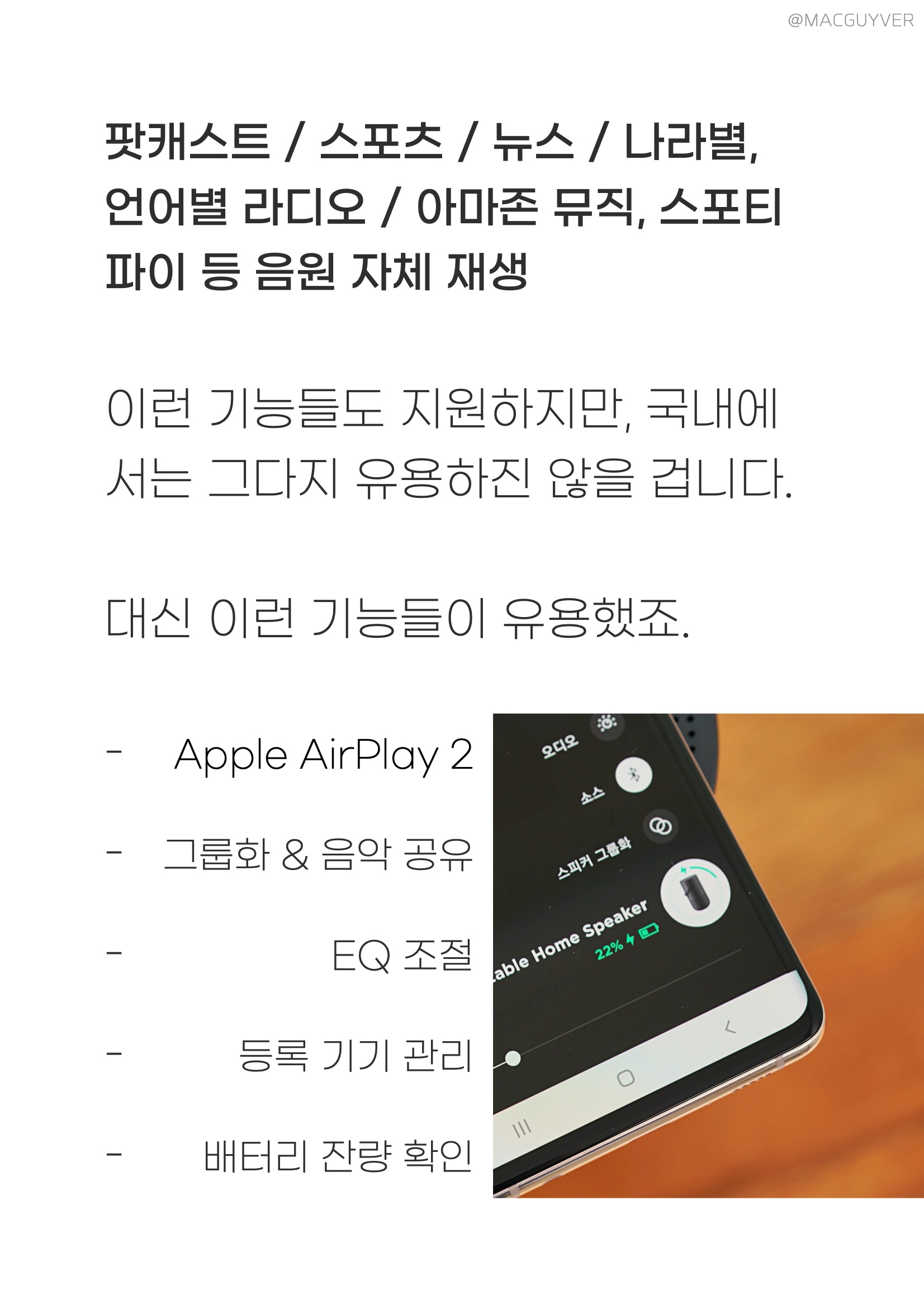 블루투스스피커추천: 스마트 기능 보스 Bose 포터블 홈 스피커 (Bose Portable Home Speaker)는 보스 스피커들 중 가장 똑똑한 스피커 중 하나라고 해요. ‘Bose Music’이라는 전용 앱을 활용하면 스피커가 와이파이에 연결되면서, 스마트 스피커로 사용할 수 있는데요. 팟캐스트 / 스포츠 / 뉴스 / 나라별, 언어별 라디오 / 아마존 뮤직, 스포티파이 등 음원 자체 재생 이런 기능들도 지원하지만, 국내에서는 그다지 유용하진 않을 겁니다. 대신 이런 기능들이 유용했죠. 블루투스 스피커 추천 * Apple AirPlay 2 * 그룹화 & 음악 공유 * 포터블홈스피커 EQ 조절 * 등록 기기 관리 * 배터리 잔량 확인 보스가 내세우는 몇몇 스마트 기능들은 국내에서 그리 대중화되지 않은 기능들이라 아쉬웠어요. 하지만 개인적으로, 여러 기기를 사용하는 입장에서, 한 스마트폰 화면에서 여러 기기들의 연결을 조정할 수 있다는 게 정말 편리했습니다. 갤럭시에 있는 어플로, 이 보스 스피커를 아이패드나 맥북에 연결하고 또 연결해제 할 수 있는 거죠. 하다보니 포터블 홈스피커에 기기 등록을 7대까지는 해봤는데, 그 이상도 가능할 것 같네요. Bose Portable Home Speaker EQ도 직관적이고 변화가 확연해요. 블루투스 스피커 총평 정리 *소리 만족도가 압도적인 건 사실 *보스 포터블 홈스피커 휴대성이 크기에 비해서도 우수함 *디자인 완성도도 역대급 *늘 완충하게 해준 충전 크래들 *한국에서 쓰기엔 아쉬운 전용앱 *하지만 매번 사용하게 되는 직관성 *총알이 넉넉하다면 추천 *가성비를 원한다면 다른 모델 추천